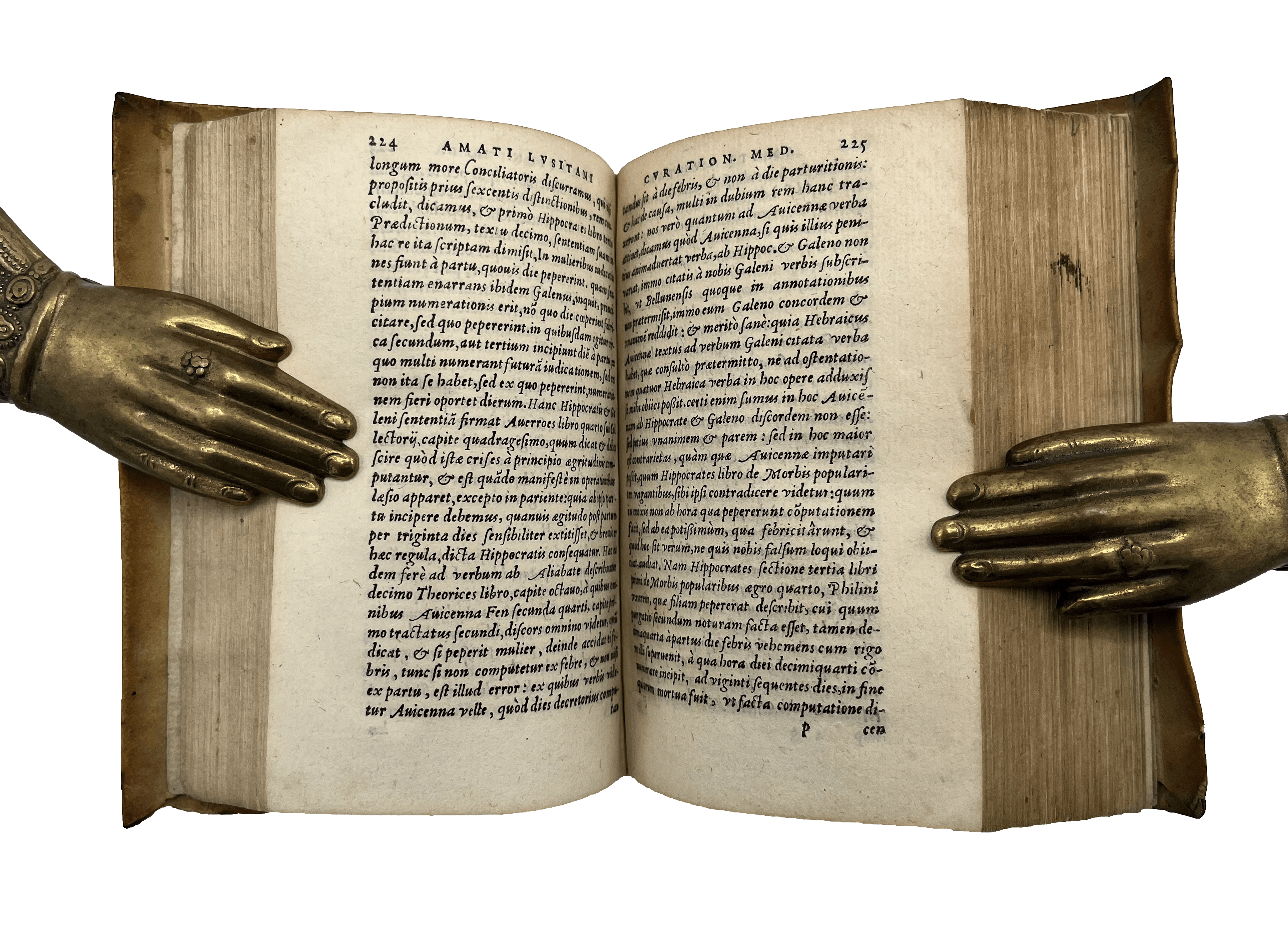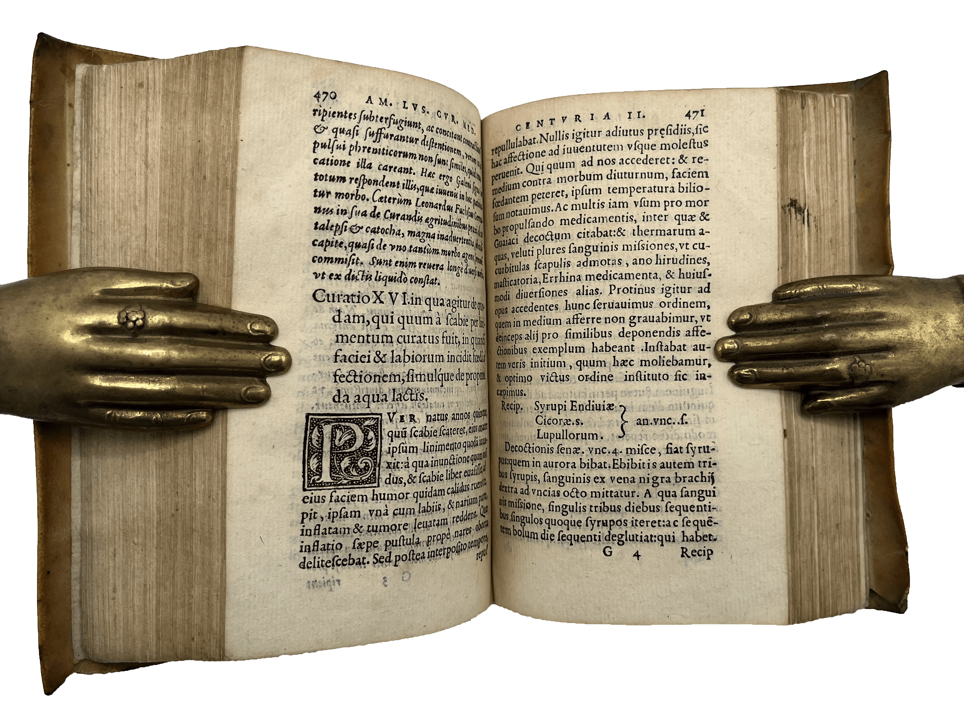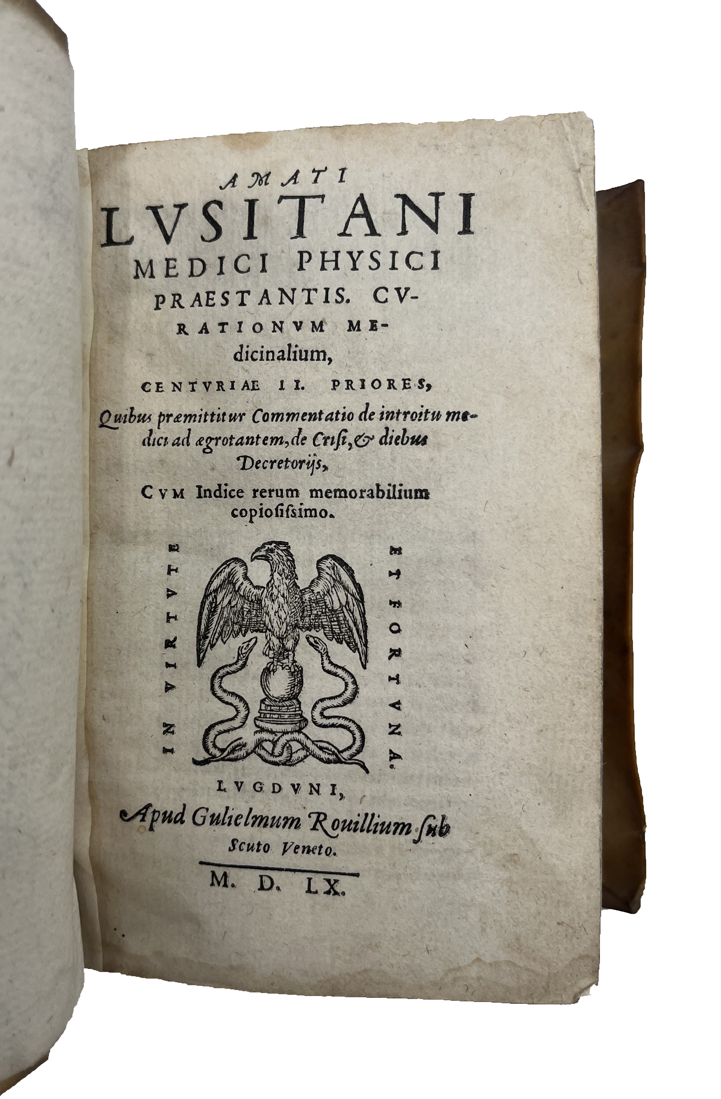 Rare and attractive second Lyon edition of this extremely popular work by the Jewish Portuguese doctor Amatus Lusitanus (1511-68), credited with discovering the function of the heart valves, first published in Florence in 1551. The book begins with a short work on critical days occurring during a disease, describing the day-by-day progression of illnesses according to Galen and Hippocrates, running to twenty days. The main part of the work consists of the first two of Lusitanus’s ‘centuries,’ collections of one hundred case studies of cures, which are divided into a description of the illness and cure, each with a commentary called the ‘scholia.’