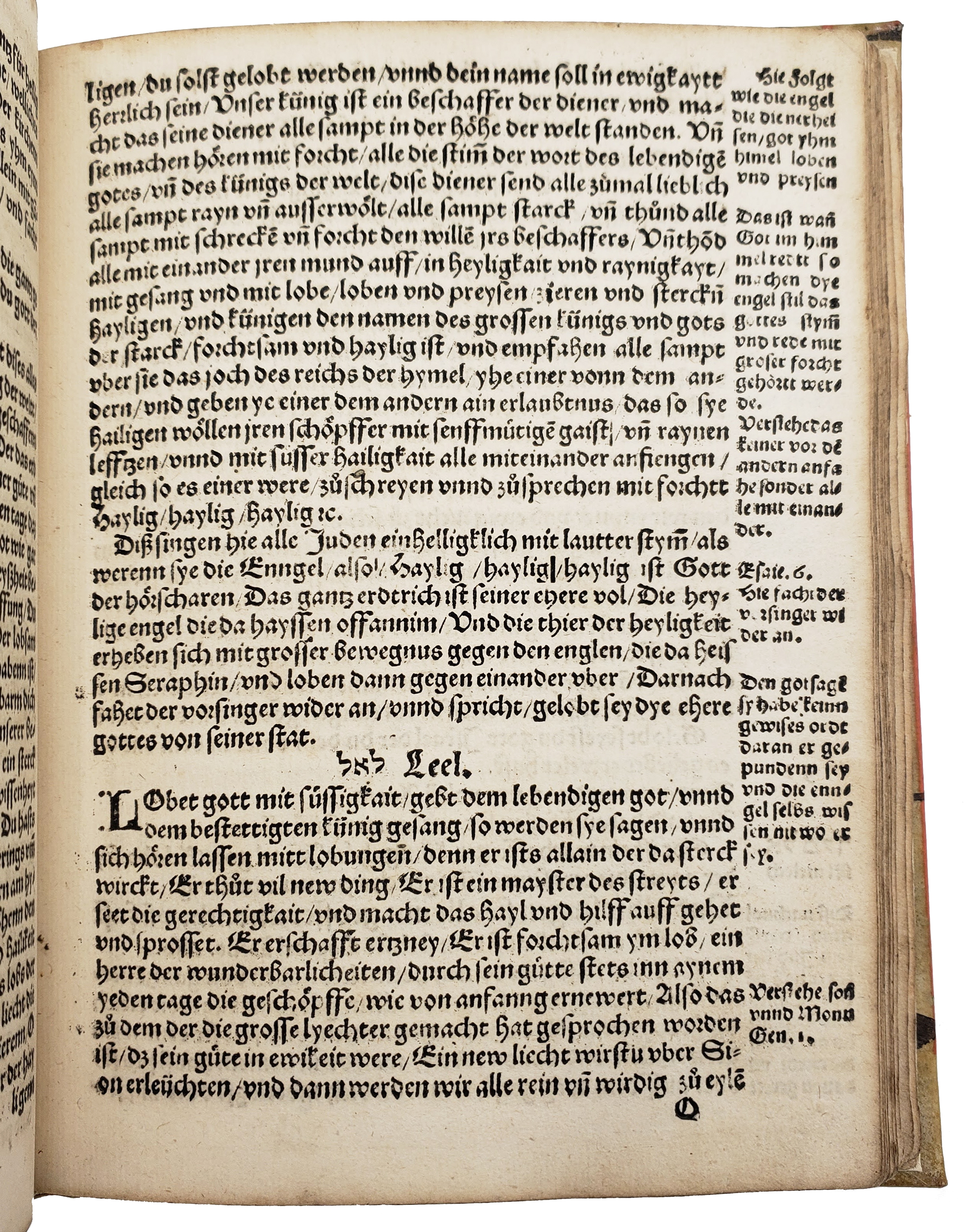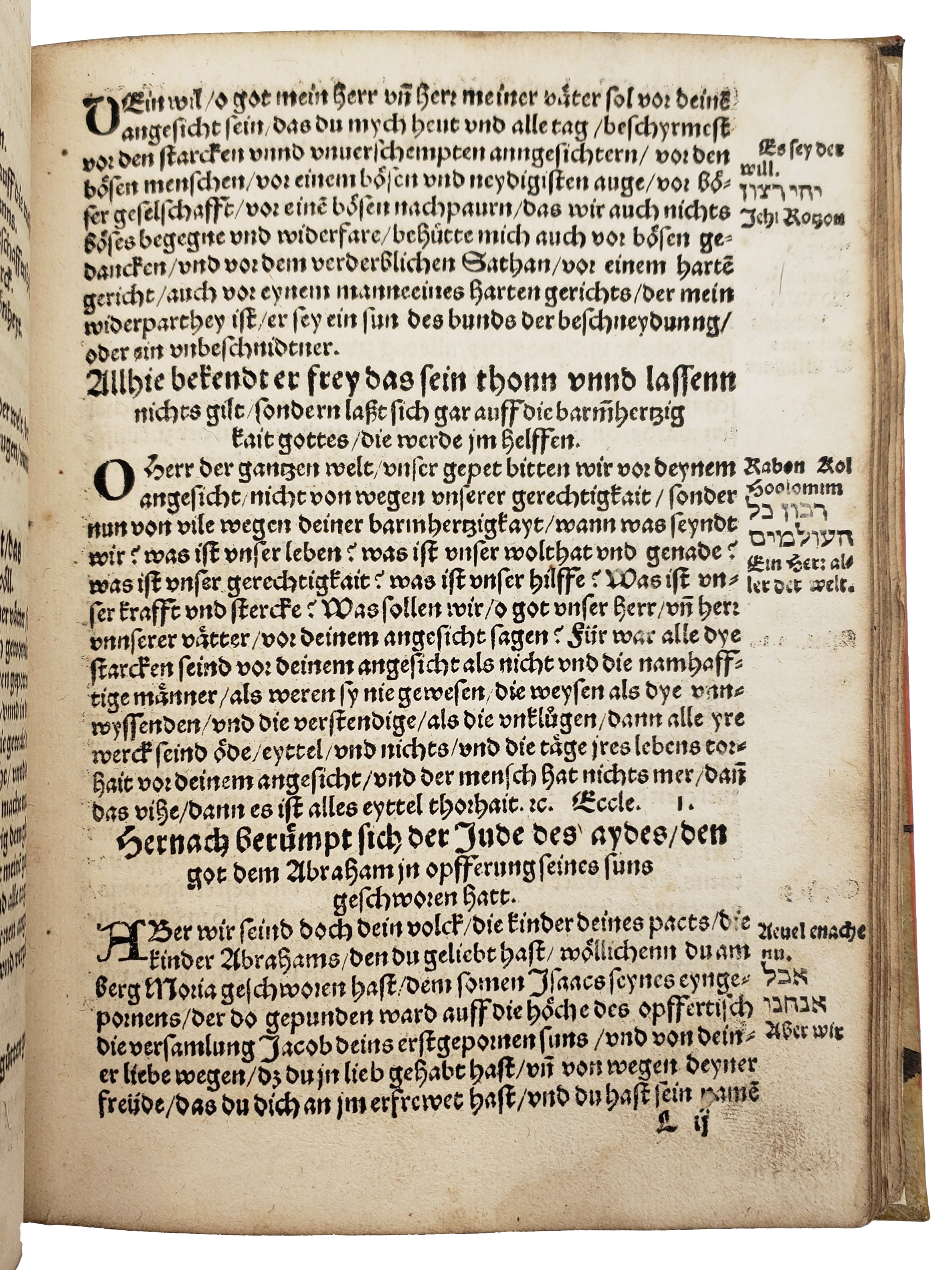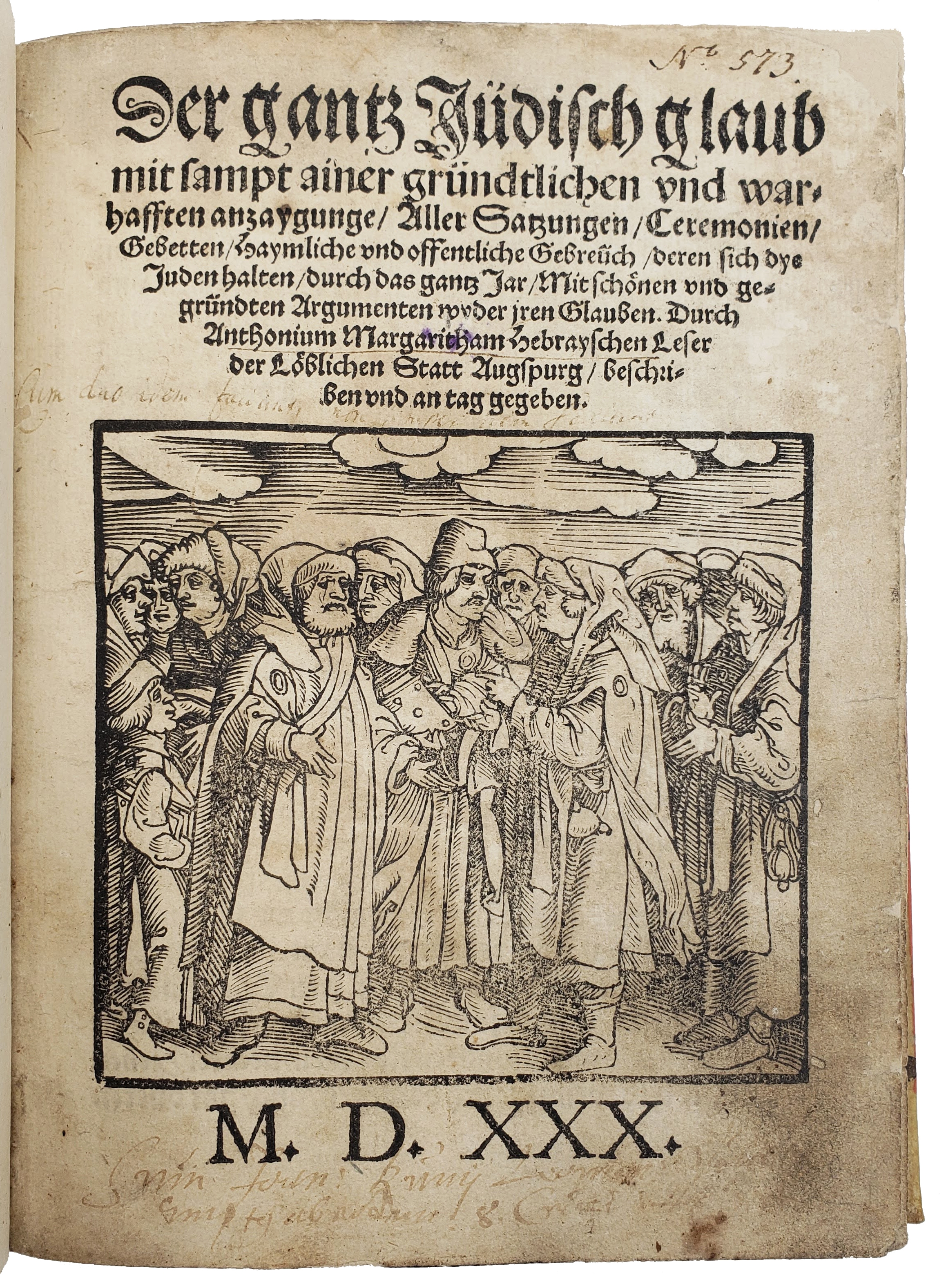 Much of the book consists of the German translation of the Jewish liturgy and prayers, with details of the observances of the Sabbath, Passover, Yom Kippur, circumcision, etc. It also contains Margaritha’s criticism of rabbinic authority and the practice of usury, and shows the Jewish faith to be based on ritual and superstition. The book influenced Martin Luther, who read, praised and recommended it. ‘One of the fundamental factors determining Protestant policy towards the Jews during the 1530s … it confirmed [Luther’s] belief that, like the ‘papists,’ the Jews were completely focused on gaining salvation by virtue of specific religious acts in themselves … [which] was idolatry’ (Thomas Kaufmann, Luther’s Jews (Oxford: 2017), p. 79). It was after this that Luther moved from a position of toleration to one of hostility, penning a series of venomous denunciations of Judaism. Margaritha’s attack on Judaism caused significant controversy in Augsburg and he was banned from the city. His work ‘was to remain one of the most important sources of information about Jewish religious ceremonies and practices into the eighteenth century’ (Kaufmann), as well as a source of everyday Jewish life and customs.