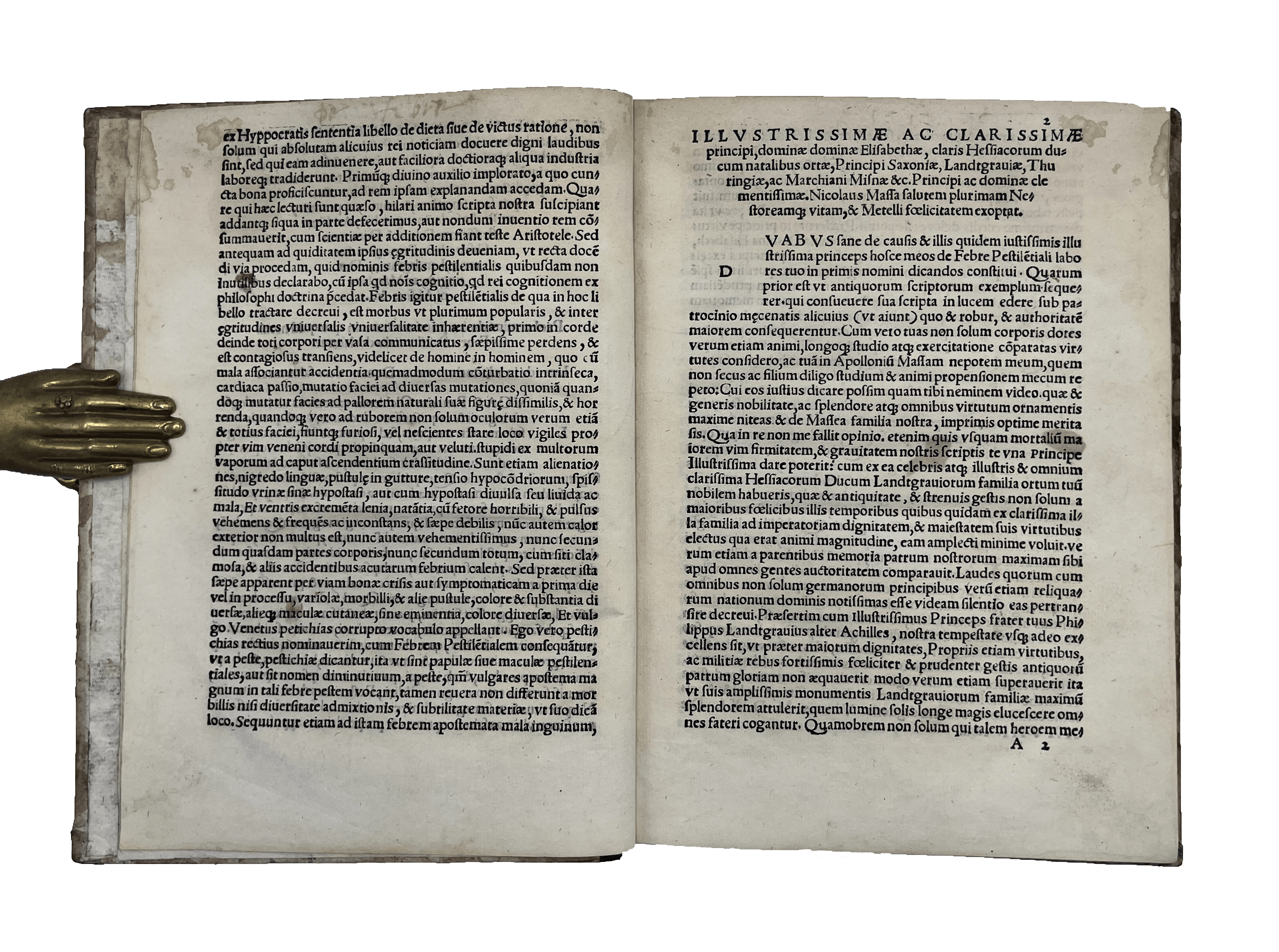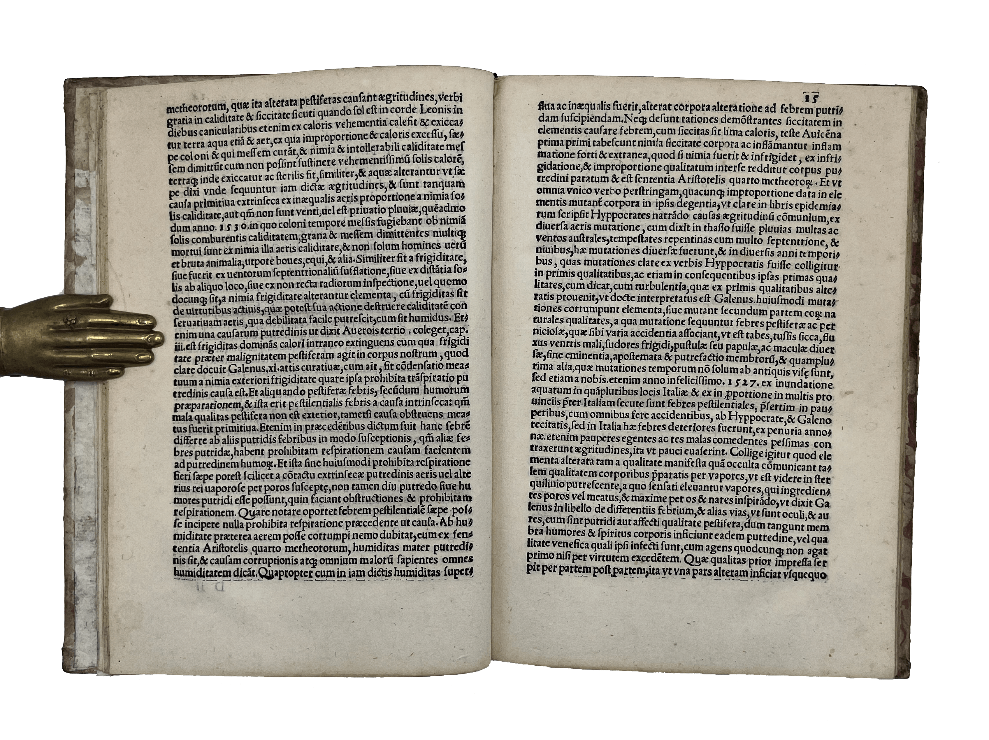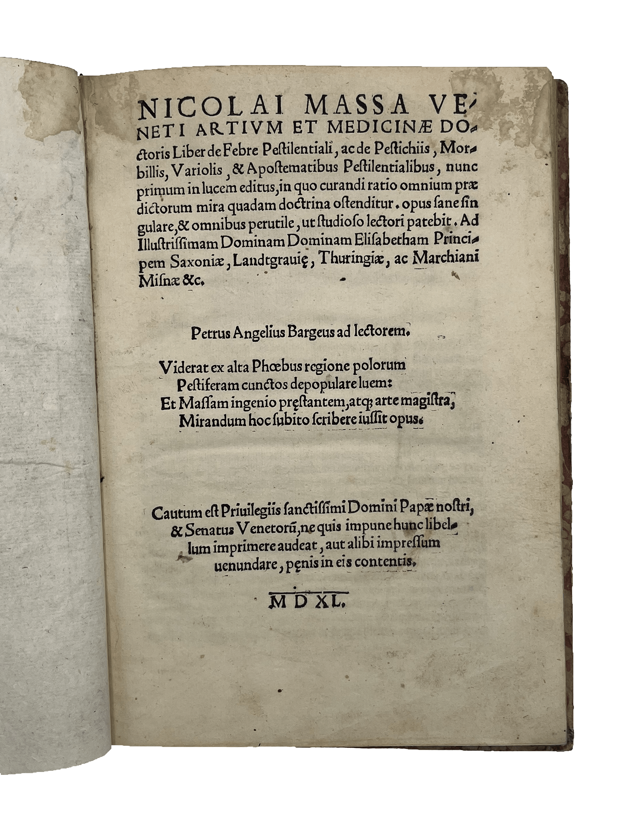 Rare first edition of this work on fevers by the Italian physician and anatomist Niccolò Massa (1489-1569), credited as being the first to describe cerebrospinal or intraventricular fluid. Taking a Galenic position and seeing fever as a corruption of the humours by pestilential air, Massa advocates prevention by adequate ventilation of houses. The last section discusses buboes and other swellings associated with plague and their treatment.