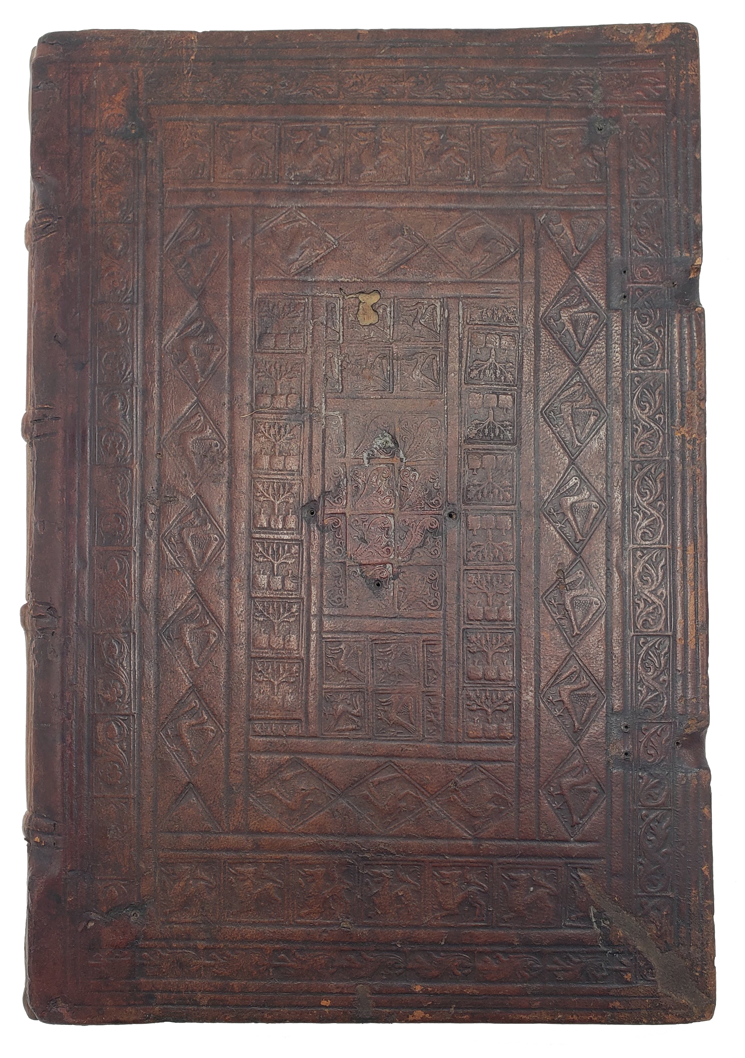 - Ernst Philip Goldschmidt (1887-1954), Viennese-born London bookdealer; this from his formidable private collection of fine early bindings: his gilt-tooled leather bookplate in centre of pastedown with “Ex libris E. PH. G.”. On him see the obituary by R.O. Dougan in The Library, 5th series, 9:2 (1954), pp. 75-84.