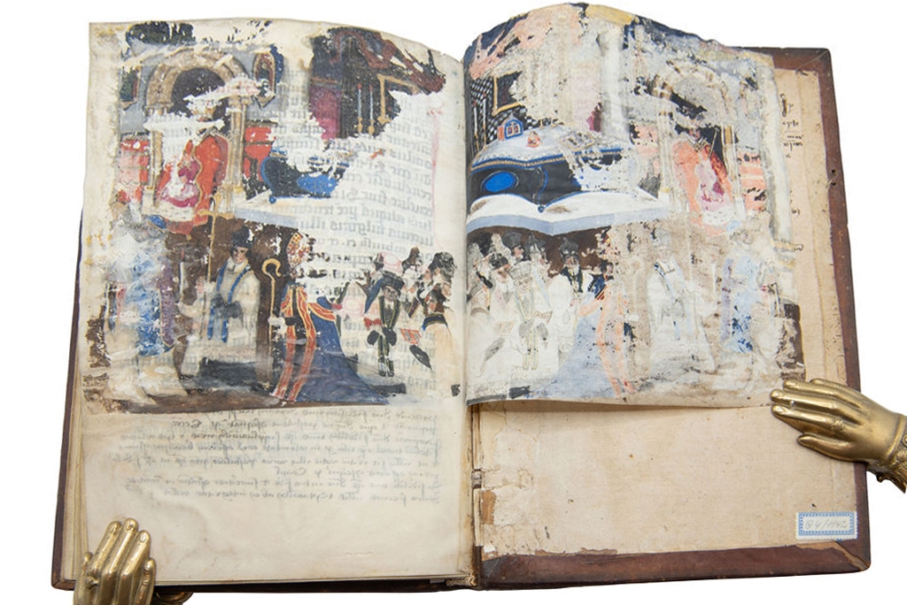 However, what is far less common is that the final vellum endleaf here, immediately following the end of the text, was used, most probably in the first half of the sixteenth-century, for a large miniature of the Mass. In this a bishop, crowned and holding a crosier, in the middle foreground, is flanked by choristers who sing, as well as a priest who carries a gold cross while a boy carries a candle. Above them a crowned emperor is seated, looking directly out at the viewer and holding a long golden sceptre, his throne placed next to a richly decorated altar. Unfortunately, the leaf that this richly painted image was painted on seems to have suffered from damp interacting with the paint and adhered to blank space of the last leaf of the main codex, obscuring it and resulting in the image’s survival in parts both on the leaf on which it was painted and as offset on the facing leaf. The presence of a king here is startling, and it is to be wondered if this miniature represents an actual event, at which the painter (and this volume) were present. If the identification of the original home of this book as the Sebalduskirche in Nuremberg can be upheld, it is worth noting that institution was particularly close to the court of Emperor Maximilian I (reigned 1508-1519), and the provost of the Sebalduskirche, Melchior Pfinzing, acted as imperial secretary to Maximilian. This may well be a painting, from life, of an actual event attended by Emperor Maximilian I.