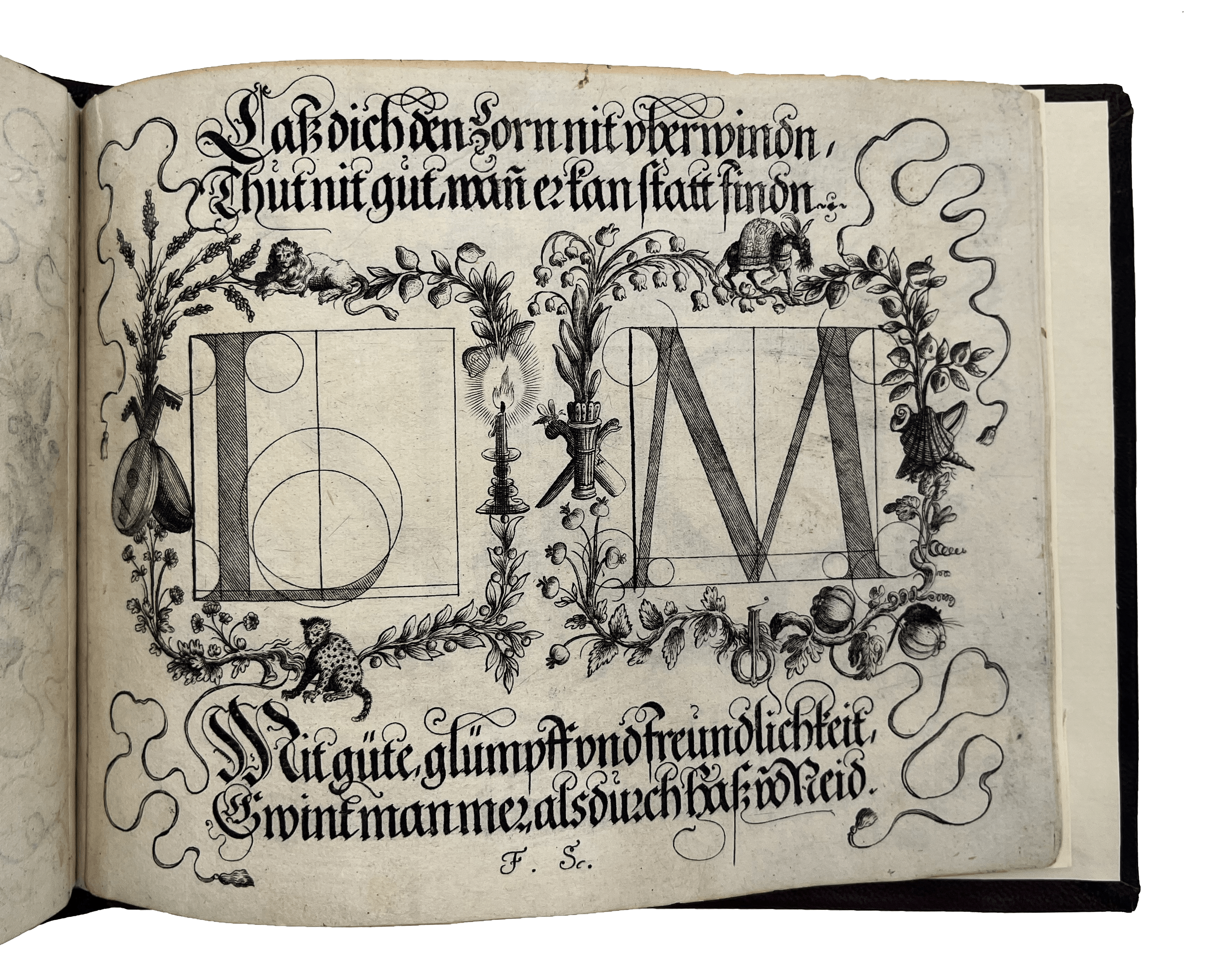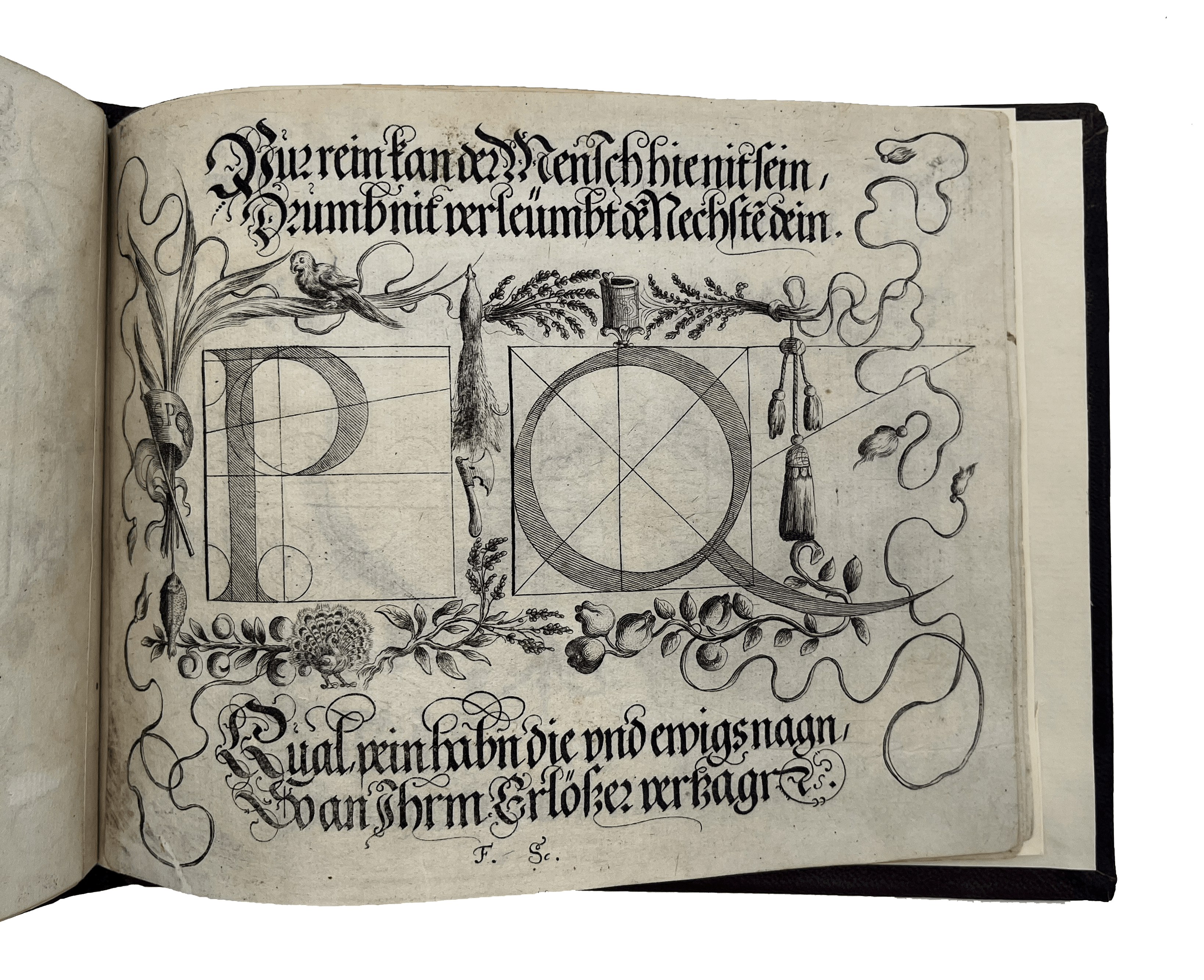 Extremely rare reprint of Neudörffer the Elder’s (1497-1563) designs for a roman alphabet, first engraved in this format by Fleischberger c.1660, consisting of twelve exquisitely engraved plates with geometrical designs for letters. These fall into the Renaissance tradition of letter design according to the principles of perspective, derived from Euclidian geometry via Vitruvius (see Donald M. Anderson, ‘A Renaissance Alphabet (Wisconsin: 1971), pp. ix-xi). The letters appear two to a plate, each initial accompanied by an alphabetically suitable calligraphic verse in German, the plates decorated with fabulous and whimsical borders featuring mammals, insects, reptiles, crustaceans, shells, fruits, heraldic and religious symbols, rebuses and grotesqueries, musical instruments including bagpipes, a minute ceramic stove and a wagon drawn by four horses. These decorative elements fit with the book’s stated purpose, which is for the use of youth, but the title-page also advertises its application to scribes, painters, sculptors, joiners, stonemasons and other artists. An often overlooked contemporary of Albrecht Dürer, Neudörffer’s Gute Ordnüng of 1538 was the first German writing manual or book of calligraphy and he has been called the founder of the art in Germany (ADB).