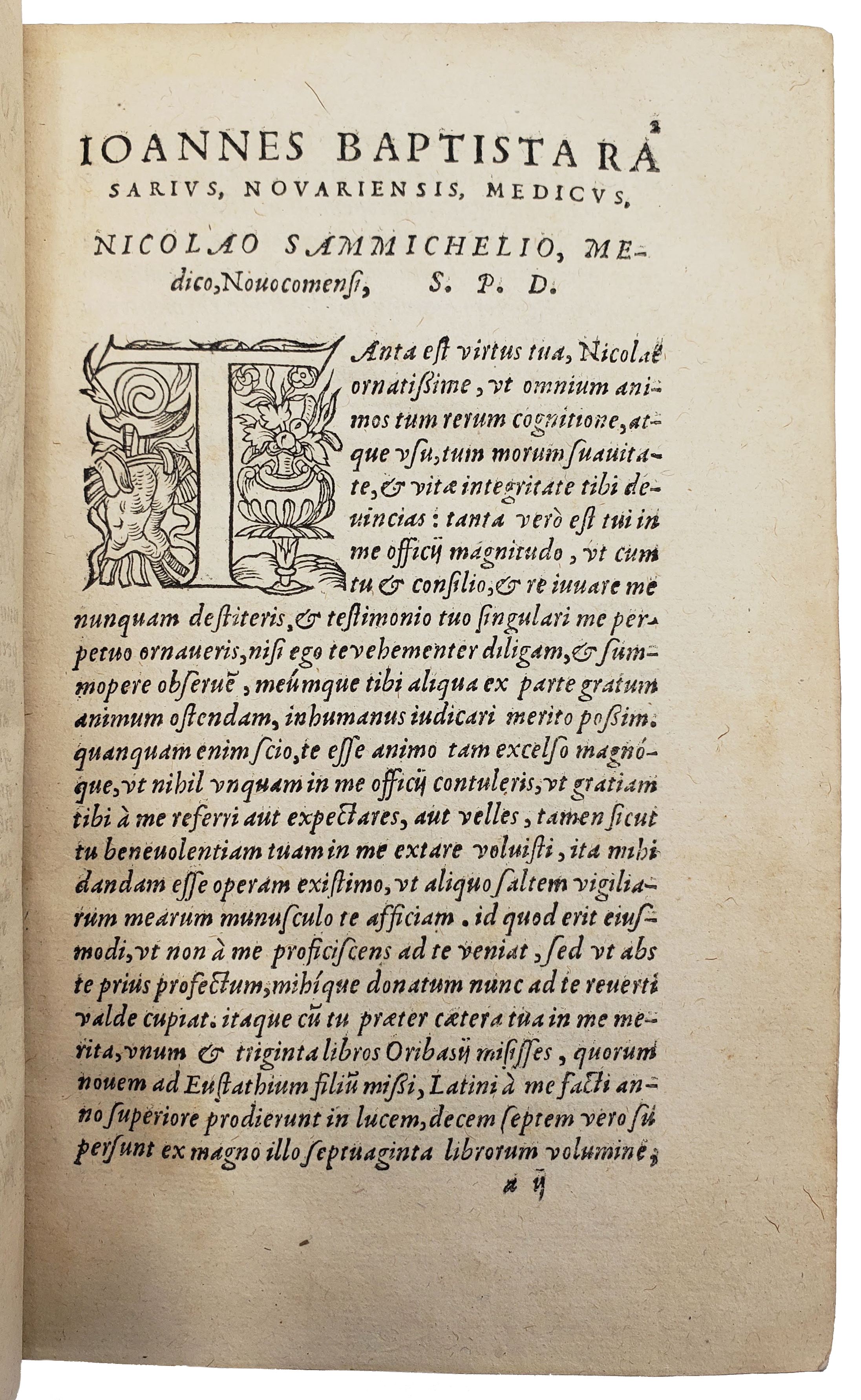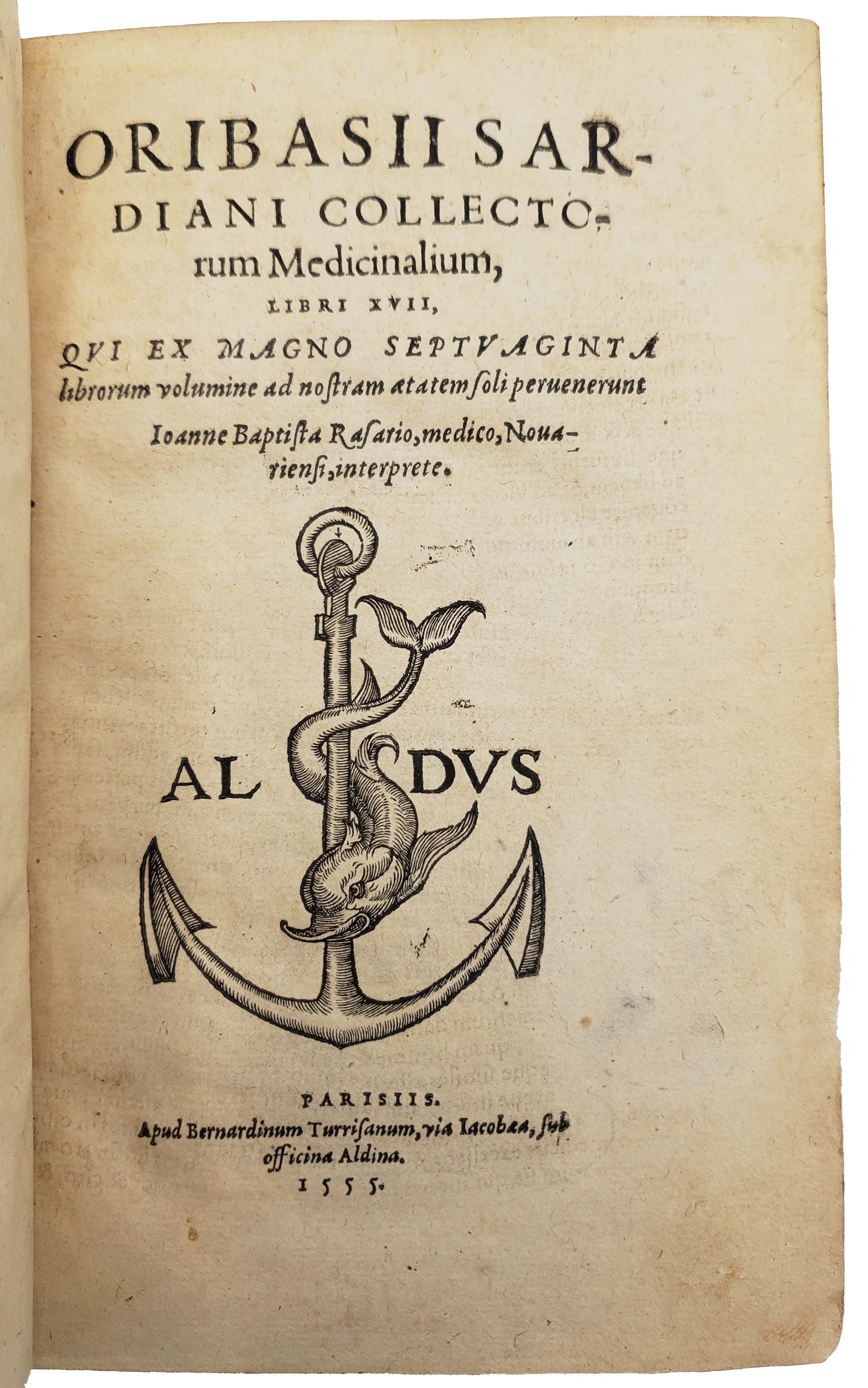 First Paris edition, appearing simultaneously with, and copied from, an undated edition published in Venice by Paulus Manutius, of the chief work of the Roman Greek physician Oribasius (b. 4th century AD).