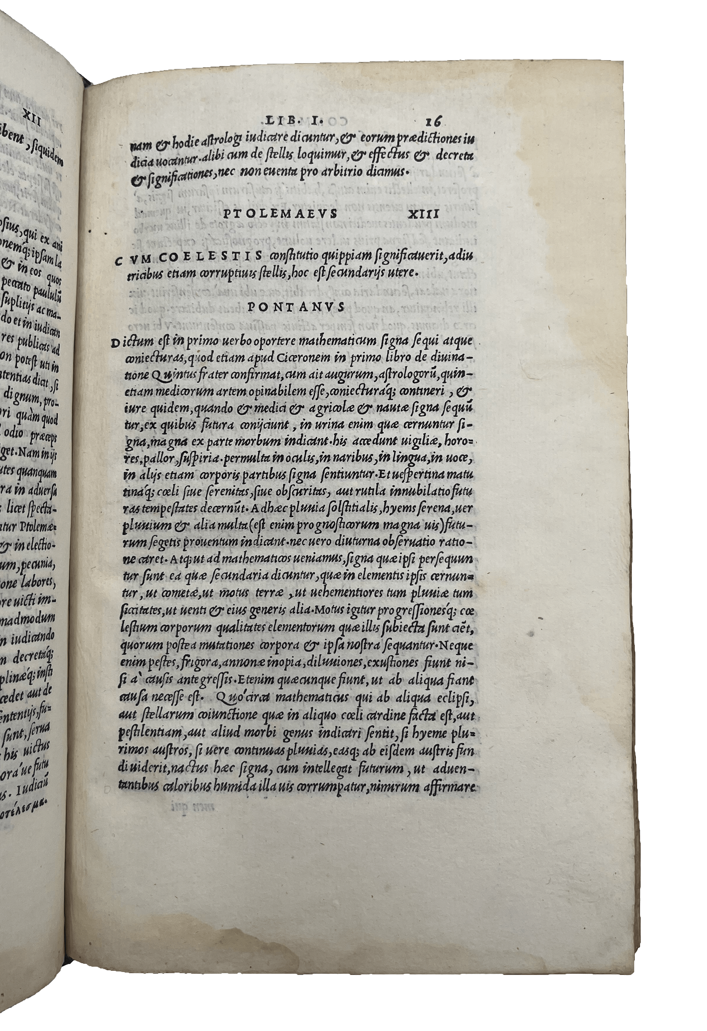 The pseudo-Ptolemaic Centum Sententiae, or Centiloquy, is a collection of astrological aphorisms, once thought to have been the work of Claudius Ptolemaeus – from whose work it differs in many key respects. Seventeenth-century English scholars such as Joseph Moxon and William Lilly noted that some ascribed it to the mythical Hermes Trismegistus. More recent speculation has centred around the figure of Abu Ja’far Ahmad ibn Yusuf Ibn Daya (d. c.941), who wrote extensive glosses to the work, and translated it into Hebrew and Latin. While some of the sententiae demonstrate typical astrological vagueness (III: a person skilled in a particular field will have been born under the relevant star; VI, XI: the day and time for a particular activity should be chosen carefully, with reference to one’s horoscope), others are extremely specific (XX: ‘Do not pierce not with iron that part of the body which may be governed by the sign occupied by the Moon’; XXII: ‘Do not either put on or lay aside any garment for the first time, when the Moon is located in Leo’). Pontanus’ commentary is notable for its concern with proving the superiority of astrology over much contemporary ‘science’, and for the socio-psychological rather than theological nature of its speculations. It was immensely influential in contemporary and later astrological and prophetic writing: Nostradamus quotes with approval his first proposition ‘Soli numine divino afflati praesagiunt & spiritu prophetico particularia’ (‘Only those inspired by the divine godhead can prophesy, and only those inspired by the spirit of prophecy can prophesy detailed events’).