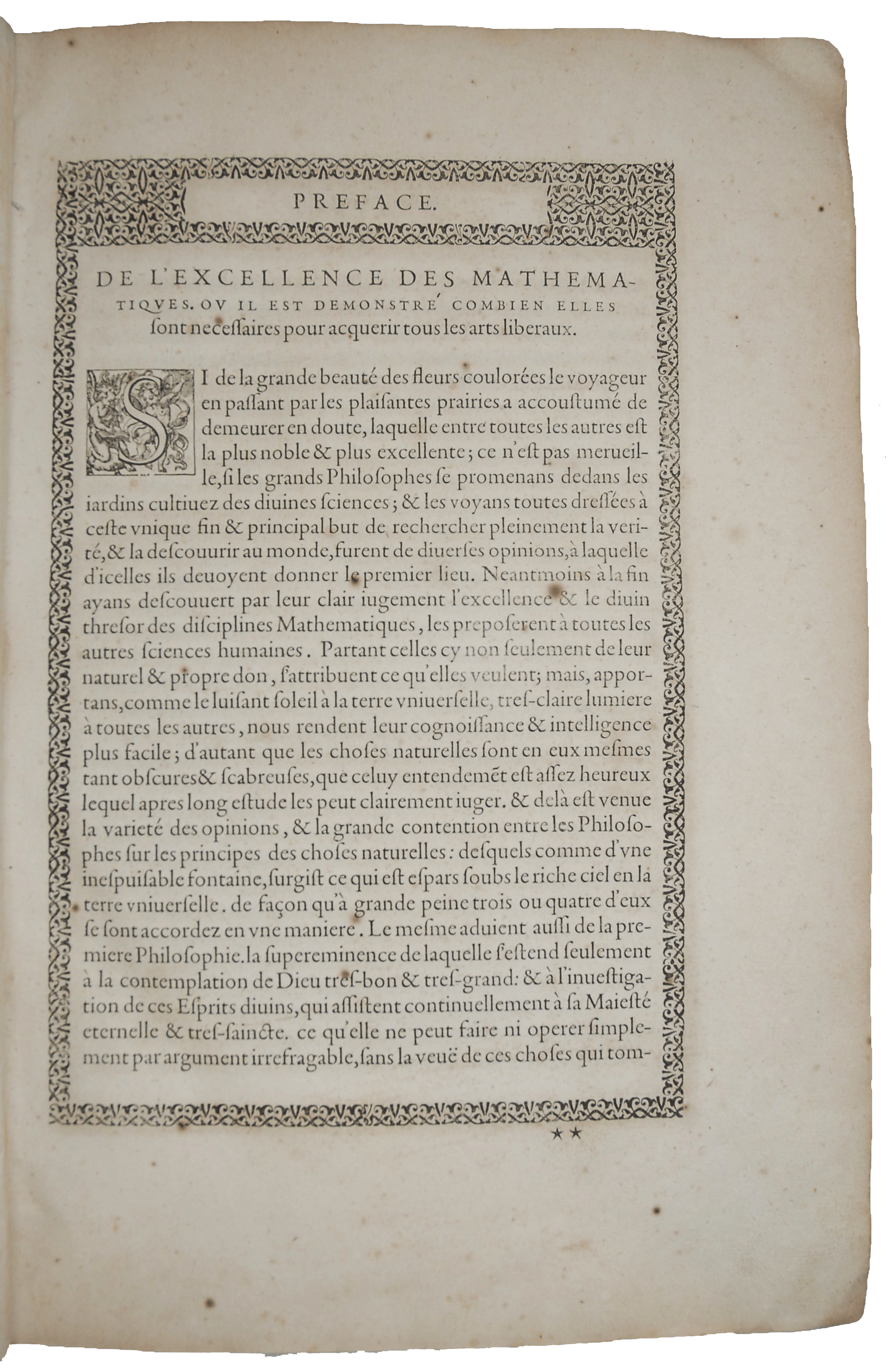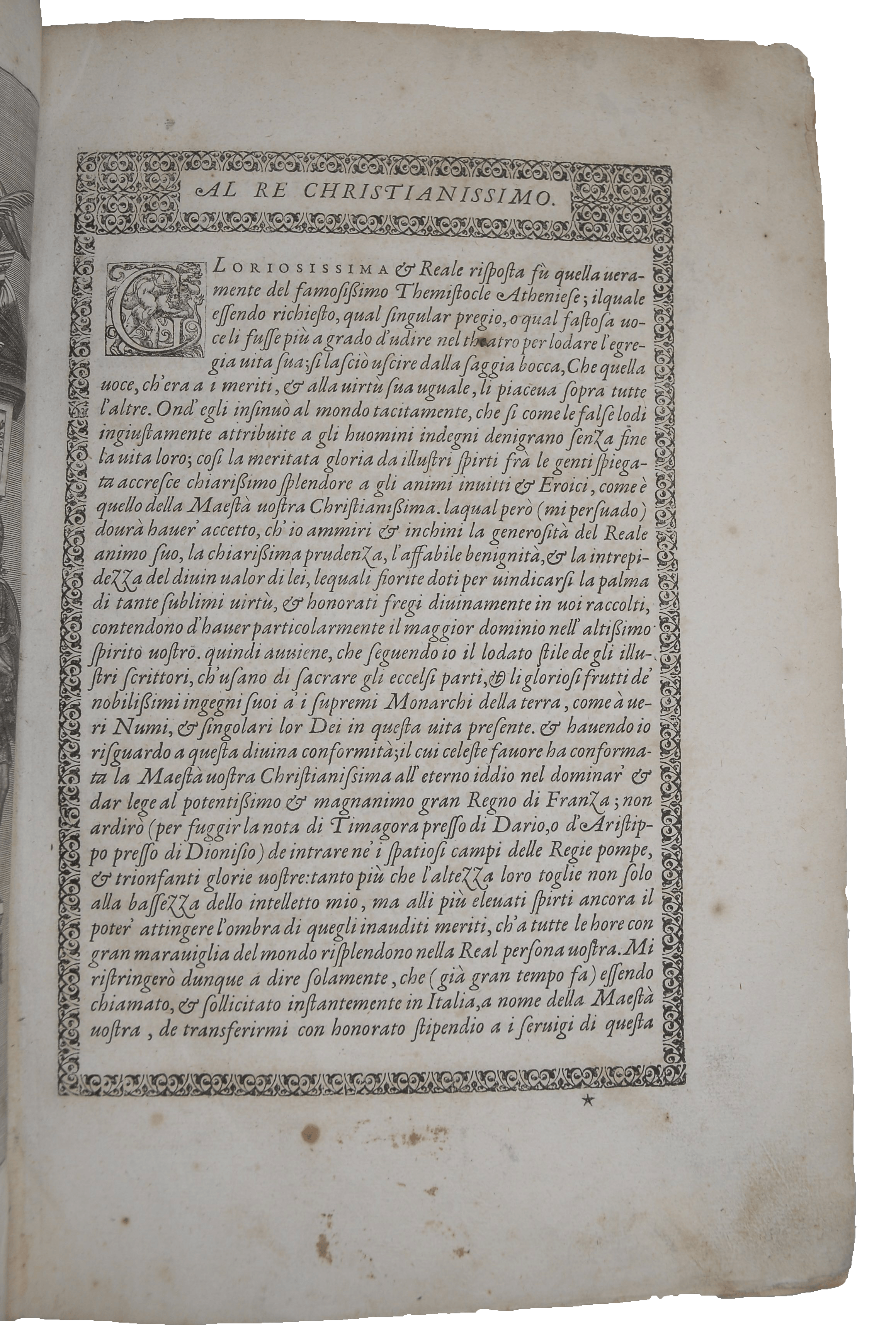 FIRST EDITION. Folio. ff. [xvi], 338. *1, **7, a-s8, t6, u-z8, A-D8, E-K4-2, L6, M-Q4-2, R-X8, Y4, Z2, Aa2, Bb8, Cc-Ff4-2, Gg-Kk6-2. French text in Roman, Italian in italic. Engraved title within architectural border, full page engraved portrait of the author on verso within architectural frame, both by Léonard Gaultier, 194 engravings, of which are 174 full-page and 20 double-page, numbered to 195, numbers 148–9 combined as one illustration, three signed with the monogram “JG”, text and engravings printed within borders of floral typographic ornaments, historiated and floriated woodcut initials in various sizes, woodcut tailpieces and corner ornaments. Discreet library stamp of “Schmidt József pesti molnár” on title, repeated on a few blank margins of plates. Age yellowing with marginal browning, minor spotting in places, autograph pasted over in lower blank margin of title with small repairs to outer margin on recto and verso, tear restored in blank margin of ff16, the occasional marginal thumb mark or ink spot, small oil stain in blank lower corner on last few leaves. A good copy, with excellent dark impressions of the engravings, in contemporary vellum over thick boards, old reback with original spine remounted, a little soiled, corners bumped.