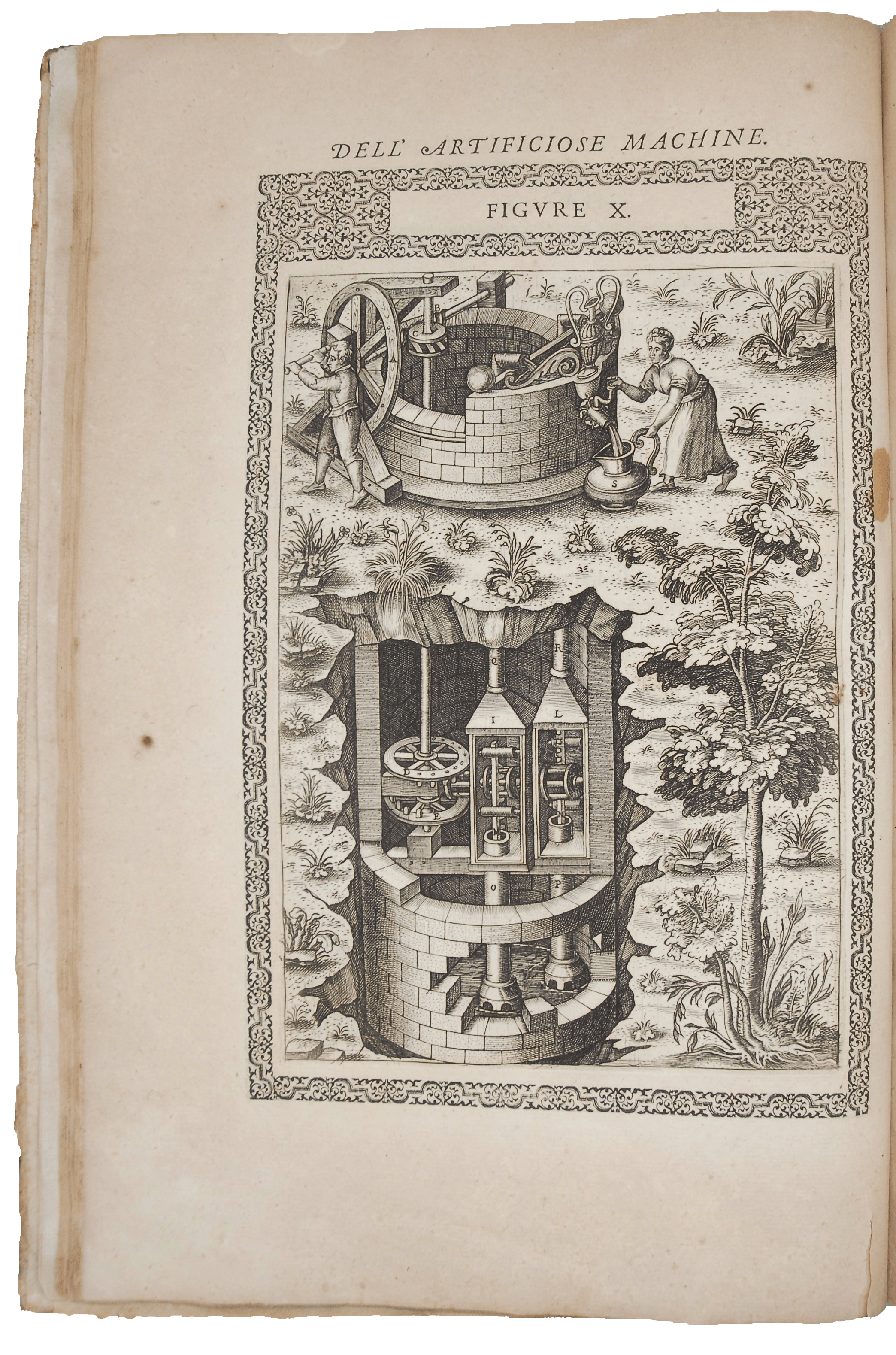 The Ramelli machines are concerned especially with hydraulics or mechanisms of warfare. The superb illustrations show the machines in use with their parts indicated by letters explained in the accompanying text. They are extremely finely worked and detailed, with great care taken to present the machine in landscape settings with figures employed in demonstrating them. Ramelli’s designs cover water-raising devices, wells, mills, mobile bridges, machines for breaking through doors and metal bars, cranes, excavating equipment, fountains, and projectile devices. He described and illustrated for the first time the rotary pump, mechanical details of windmills, and a coffer-dam of interlocking piles, and like other writers of the period he designed biological automata in the form of hydraulically operated singing birds. including one notable departure into the world of domestic gadgetry, a revolving bookcase designed to enable a reader to peruse multiple volumes without having to leave his seat. Ramelli was greatly influenced by the increasing importance placed on mathematics and geometry as an important tool for engineers and artists, and particularly by the writings of Guidobaldo del Monte (1545-1607) and Petrus Ramus (1515-1572).