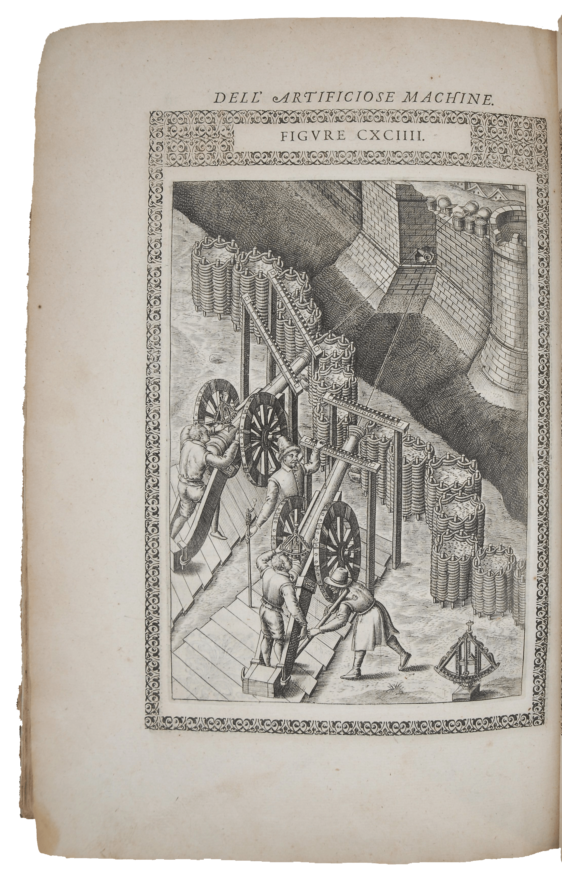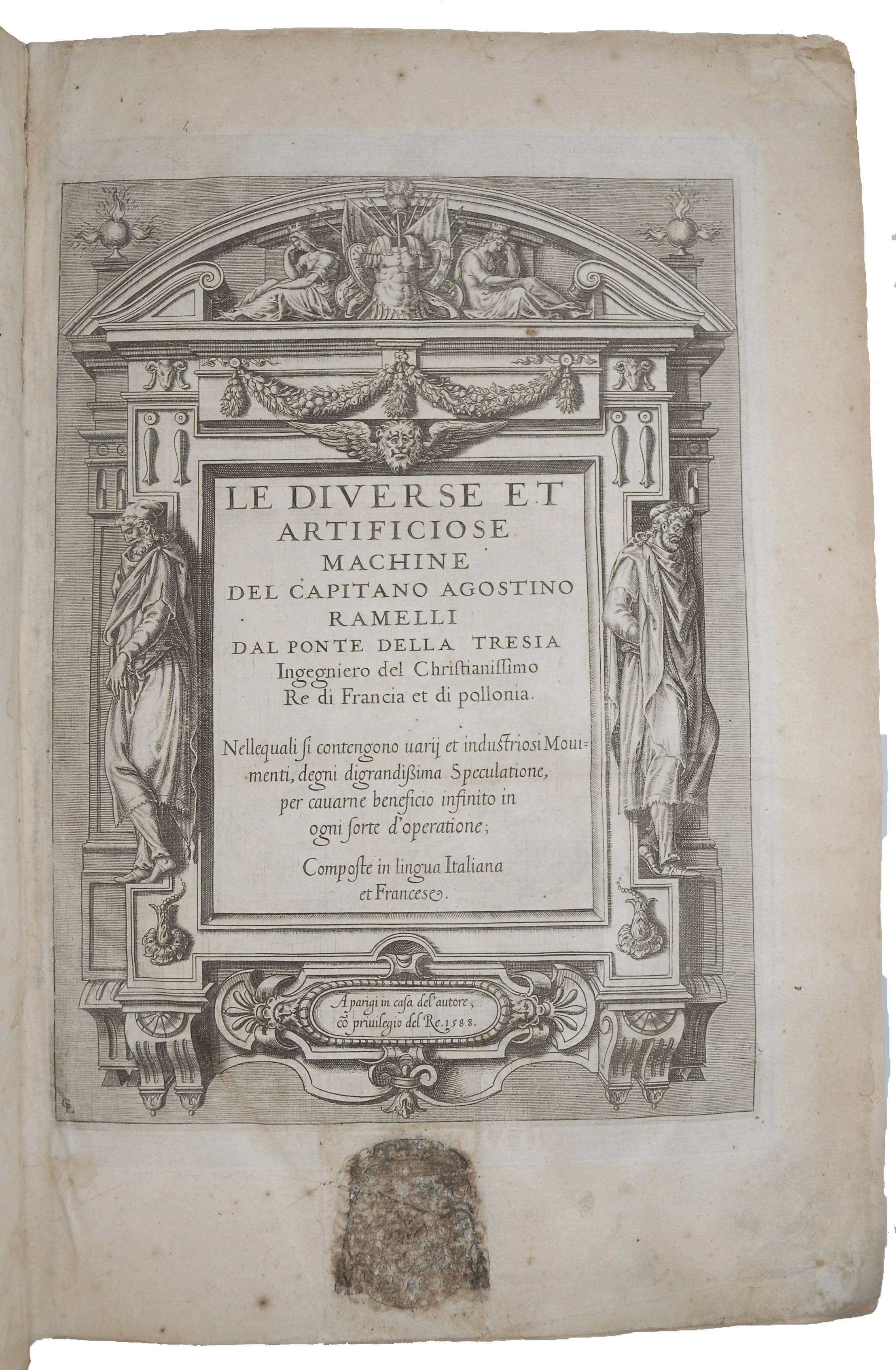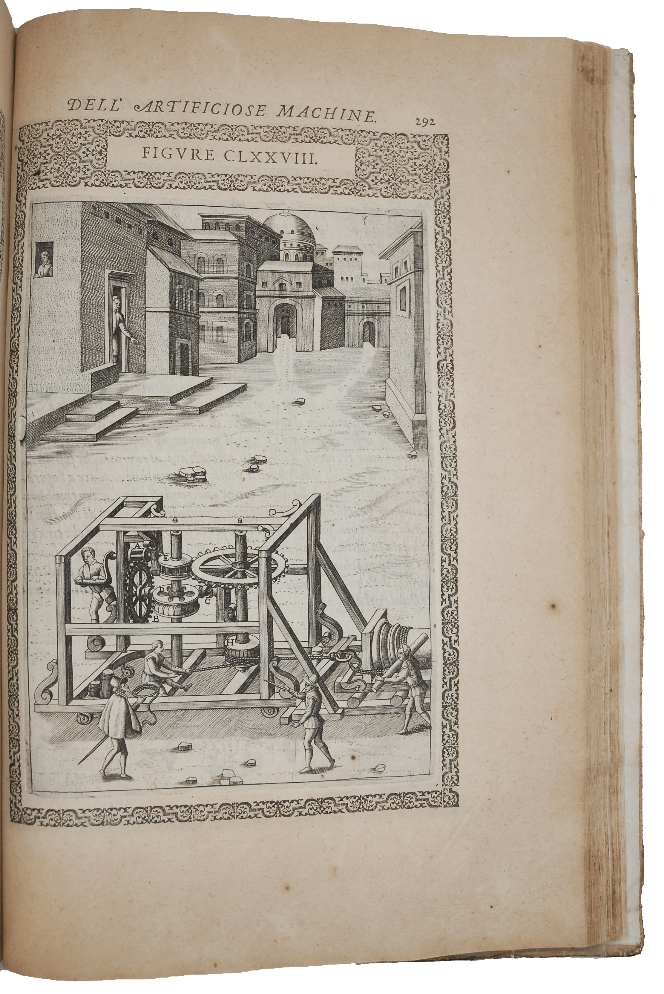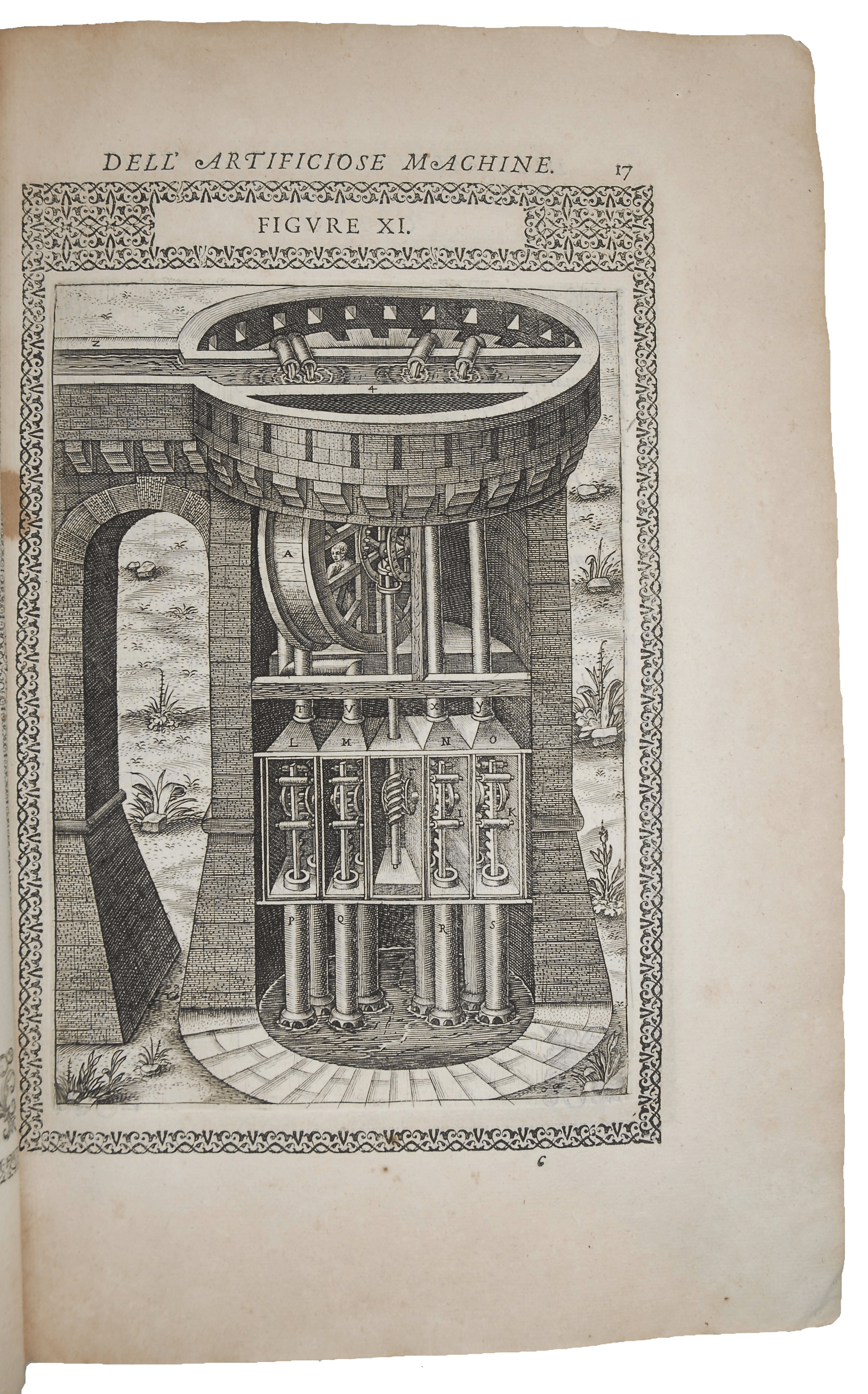 First edition of the most important and most impressive ‘book of machines’ of the C16th, an outstanding example of French book production; illustrated with 195 full-page engravings, it is one of the earliest and most elaborate pictorial technical works to be printed. “This volume is dedicated to the King and special care was taken to make it appropriate as an expression of gratitude for Royal favor and protection. There is also a second factor governing the circumstances of publication. In his address to the reader, Ramelli complains of piracy of his designs which resulted in their publication in corrupt and mutilated forms destroying the original accuracy of his inventions. As a result of this experience, Ramelli planned this work as a particularly handsome volume, difficult to counterfeit, strictly supervised by the author himself and published with the imprint, ‘in casa del’ autore'” – Mortimer.