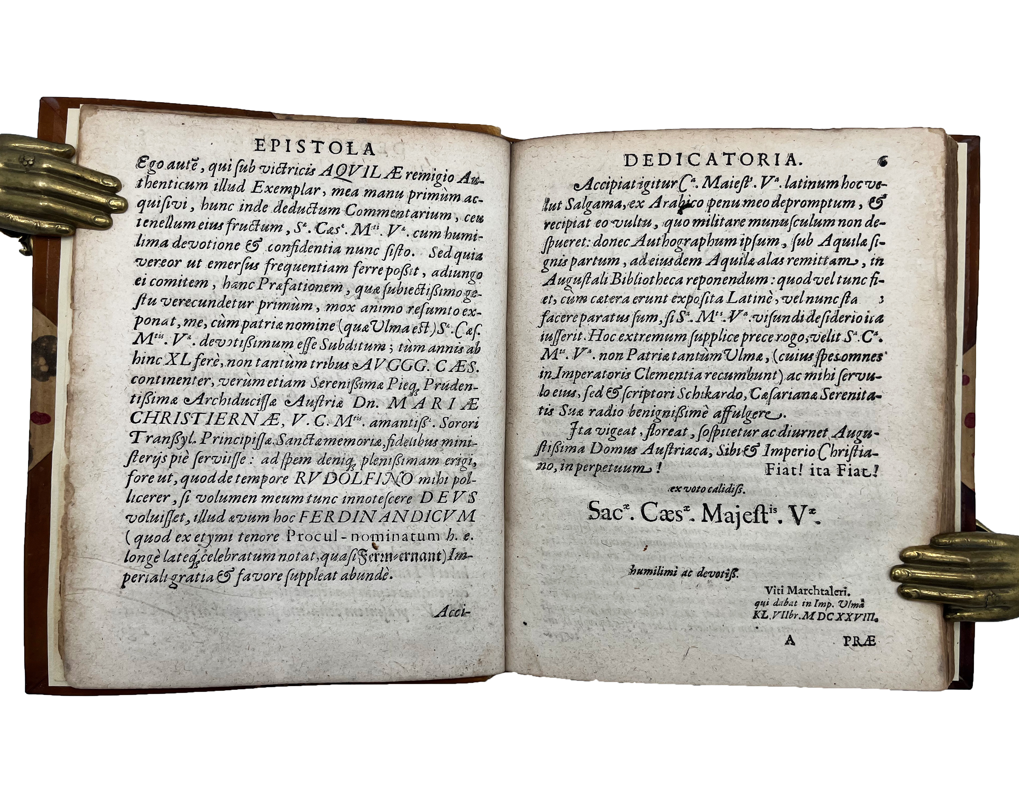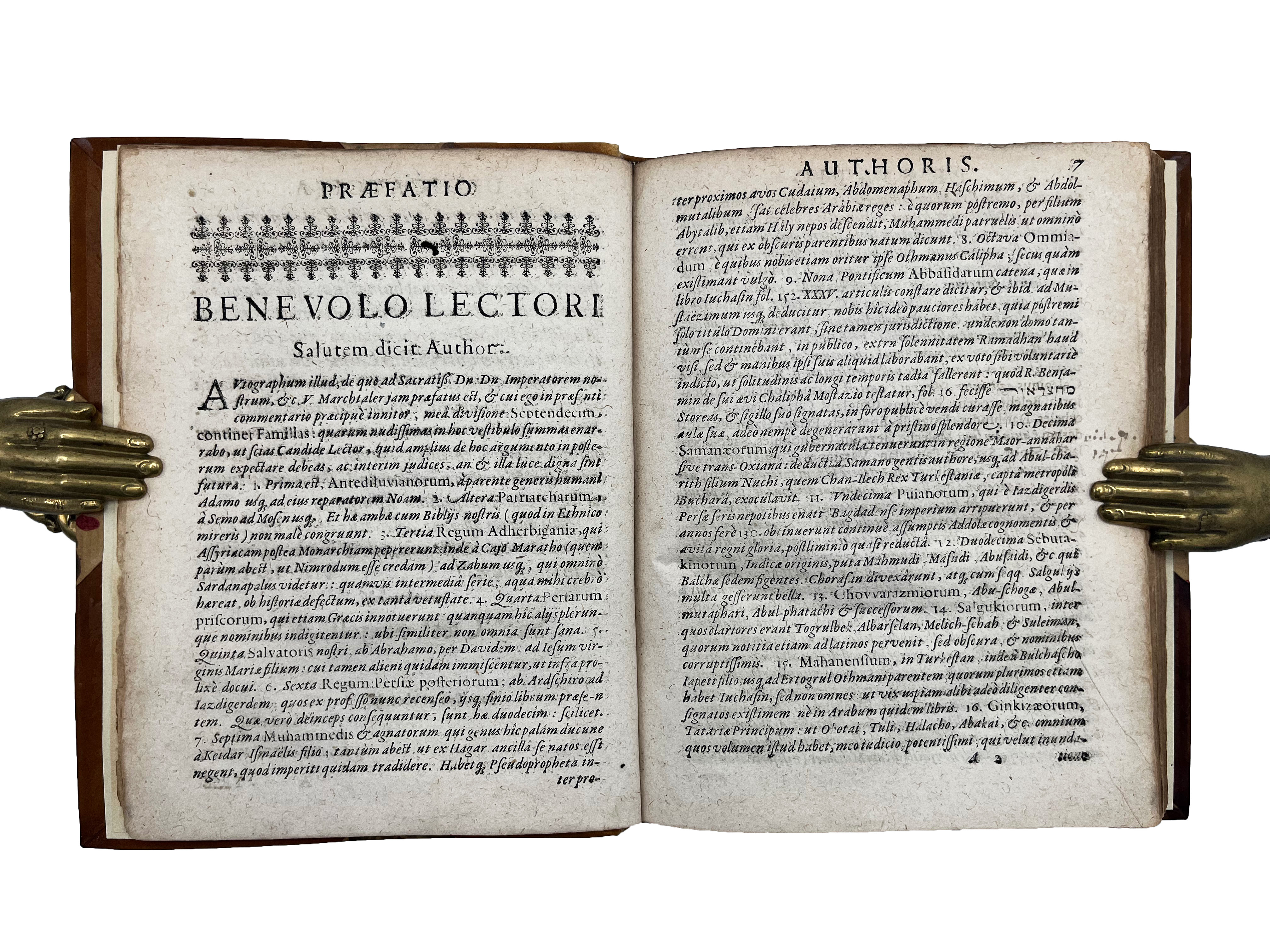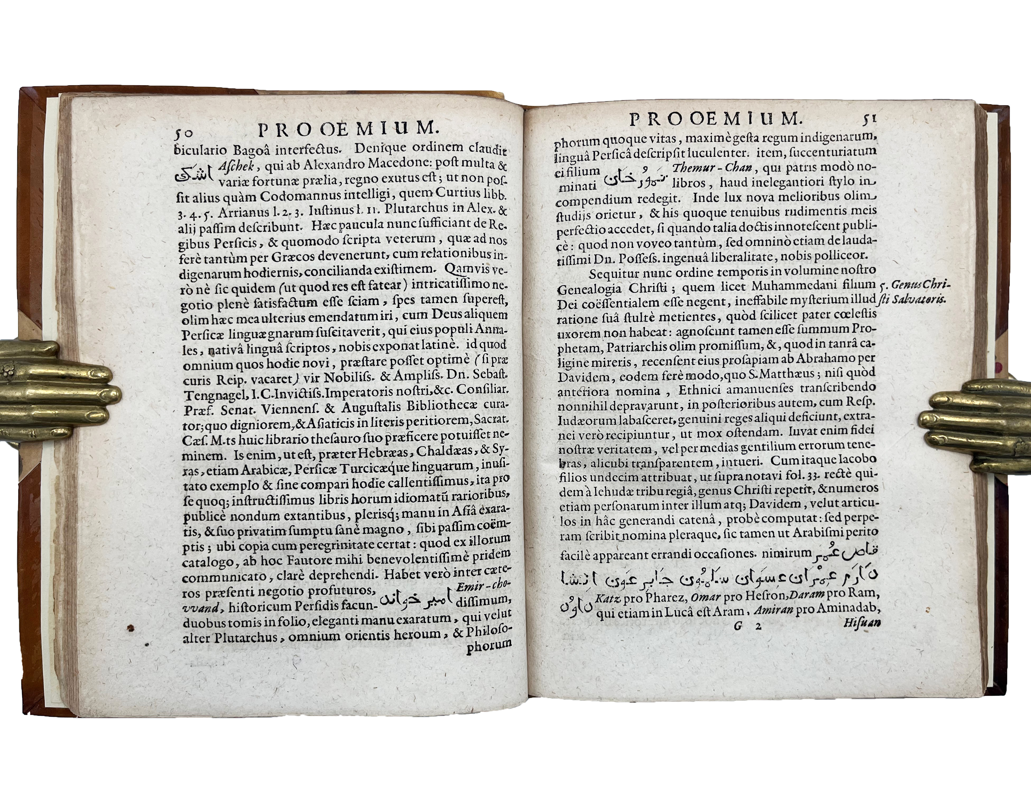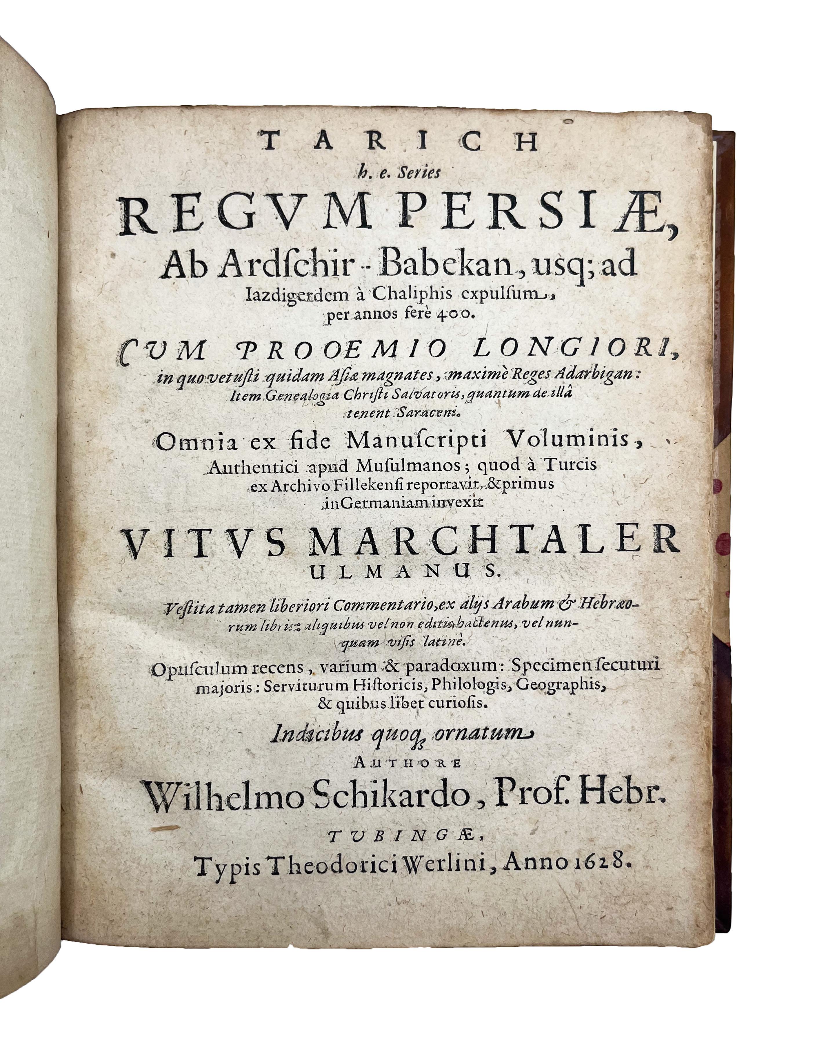 First edition of this ‘Tarikh’ or History of the Persian kings by the German Hebraist and Arabist Wilhelm Schickard (1592-1635), also known as an astronomer and horologist, and designer of an early calculating machine. This genealogical chronicle, beginning with the C3rd AD Ardashir I and ending with the C7th Yazdigerd III, the last Sasanian emperor, is a valuable source for early Islamic history, culture and geography. It was translated from a Turkish manuscript in Ottoman Arabic with a colourful history: found in the library of Filakovo Castle in modern-day Slovenia, which was recaptured from the Ottomans by the Holy Roman Empire in 1593, and brought to Germany by the traveller Veit Marchthaler of Ulm (1564-1641), where it was left unstudied for almost thirty years. The reappearance of the manuscript, a copy of the Tavarich Beni Adam by Yusuf ibn ‘Abd al-Latif, caused Schickard ‘both excitement and despair,’ because of his lack of proficiency in the Ottoman script and language (Stefan Hanss, ‘Ottoman Language Learning in Early Modern Germany’ in Central European History, 54.1 (2021), p. 25). Unable to gain help from any scholars in Europe, Schickard muddled through the manuscript by finding useful cognates between German, Hebrew, Arabic and Ottoman, producing his edition and commentary in less than three months (Hanss, p. 26).