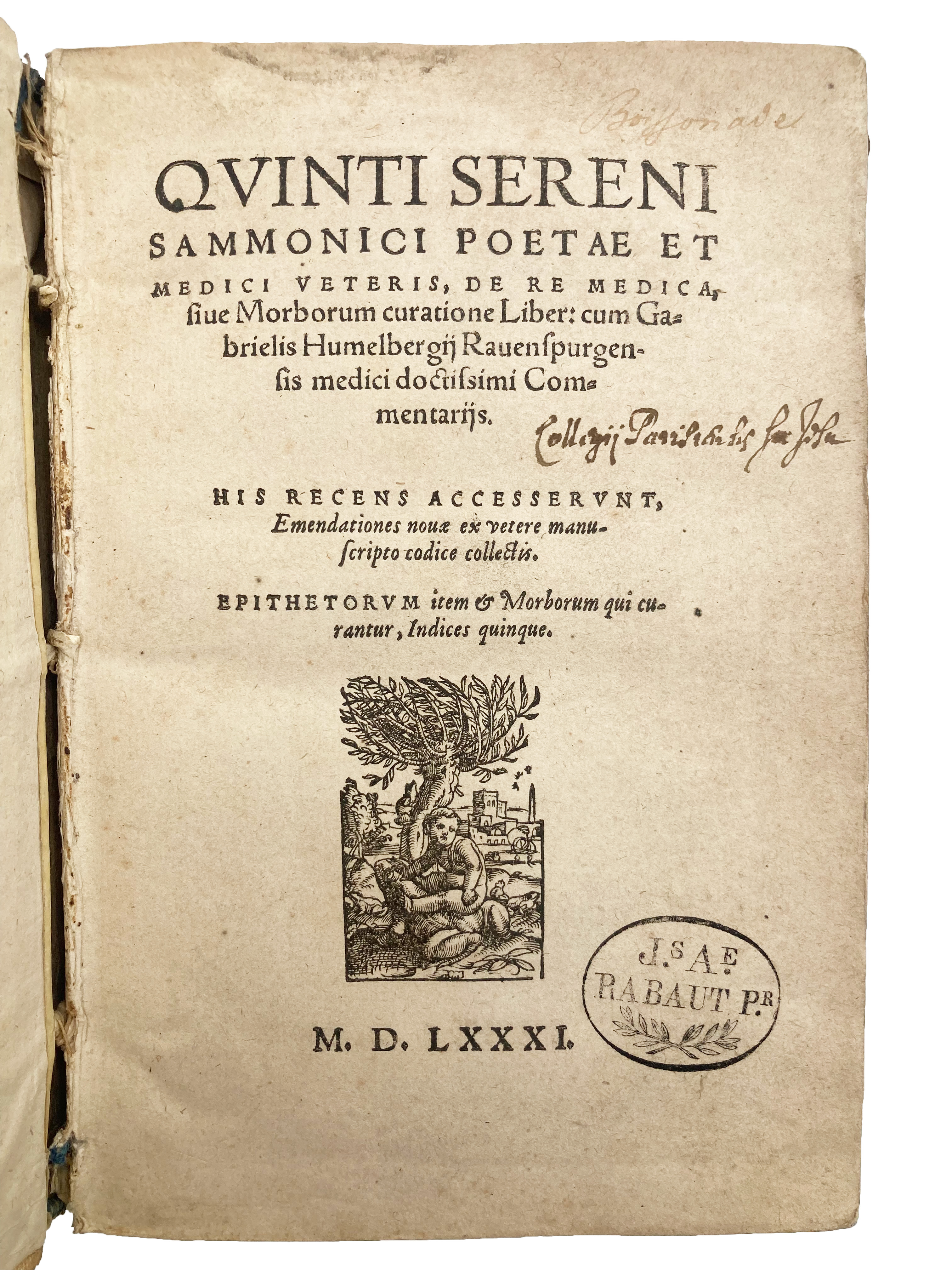 4to. ff. [10], 249 [i.e., 252], last blank. Roman letter, little Italic. Woodcut printer’s device to title, decorated initials. T-p very slightly softened, light age yellowing. A very good, clean, unsophisticated copy in contemporary limp vellum, yapp edges, ms title to spine, minor loss and soiling at head of spine, early ms shelfmarks to front and rear pastedown, cont. ms ‘Boissonade’, C17 ‘Collegij Parisiensis Soc Jesu’, and C19 ink stamp ‘J.s A.e Rabaut P.r’ [Antoine Rabaut-Pommier] to title, same ink stamp to lower blank margin of one text leaf.