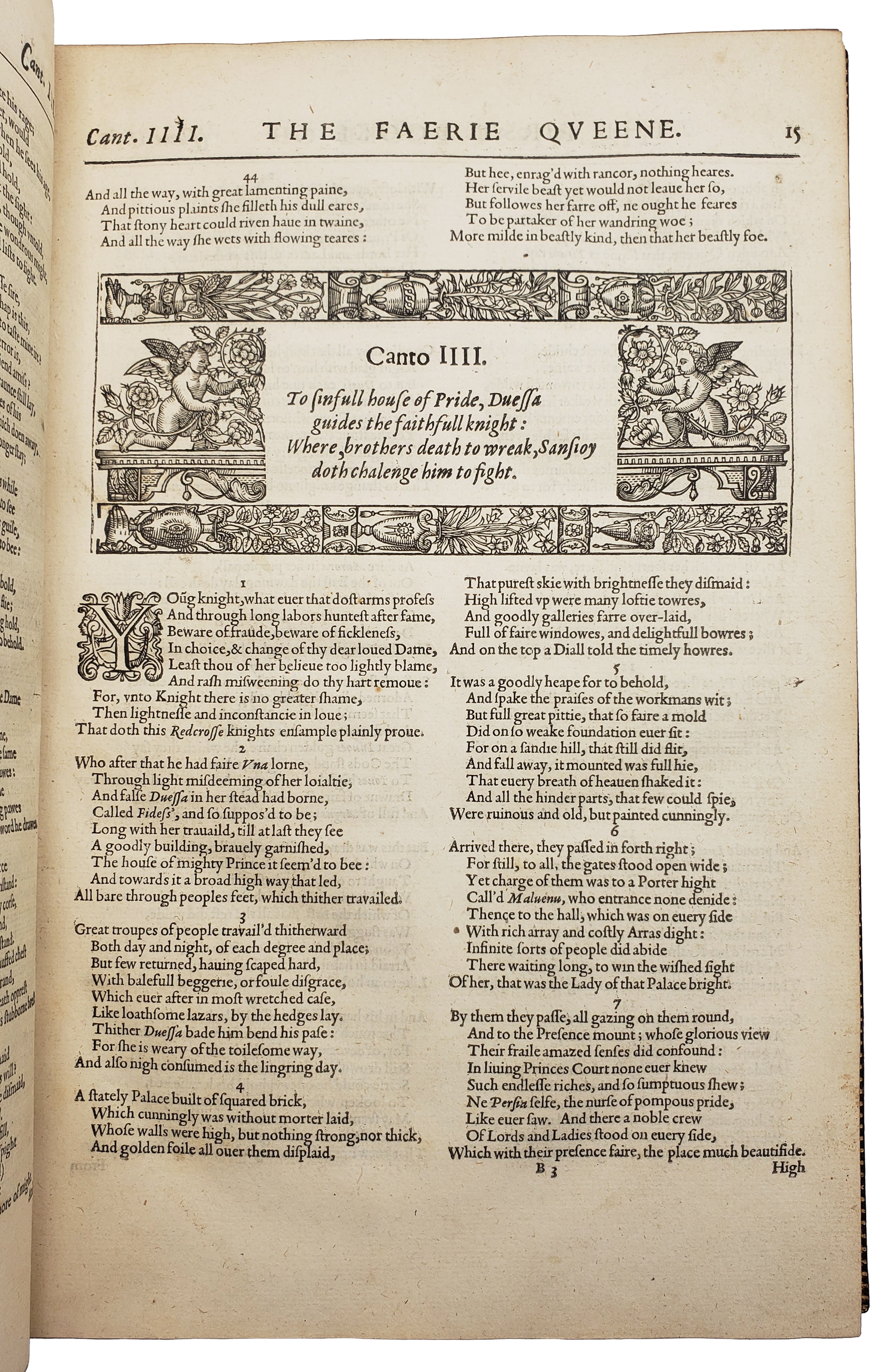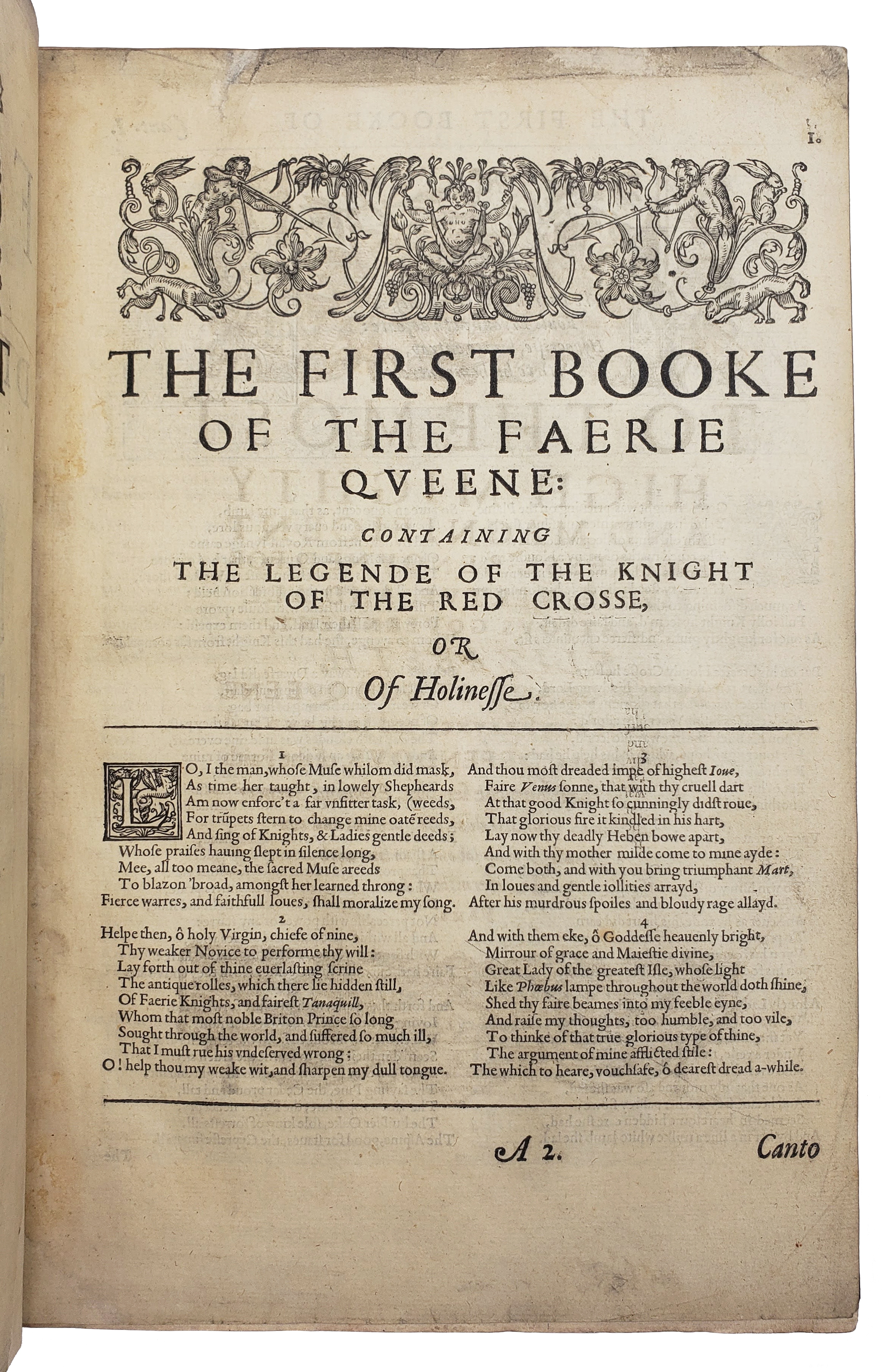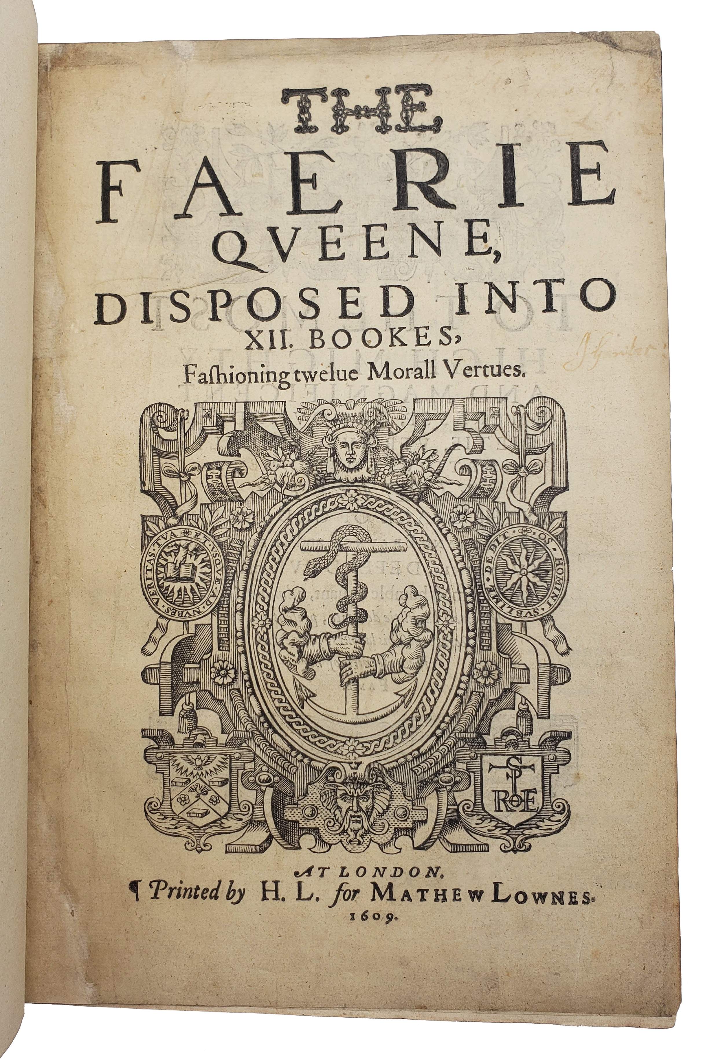 A fine copy of the first folio edition, with minor variants, of the ‘Faerie Queen’, the pre-eminent achievement of Edmund Spenser. Spenser was the first great poet in England since Chaucer, the most learned apart from Milton, the most influential ‘poet’s poet’ as described by Lamb, and acknowledged by Shakespeare as the master of ‘music and sweet poetry’. His influence on subsequent literature cannot be exaggerated: Milton found him a ‘sure guide’ both as a thinker and a poet; Dr Johnson pointed out the derivation of ‘The Pilgrims Progress’ from the ‘Faerie Queen’; Dryden called the author his ‘Master in English’.
