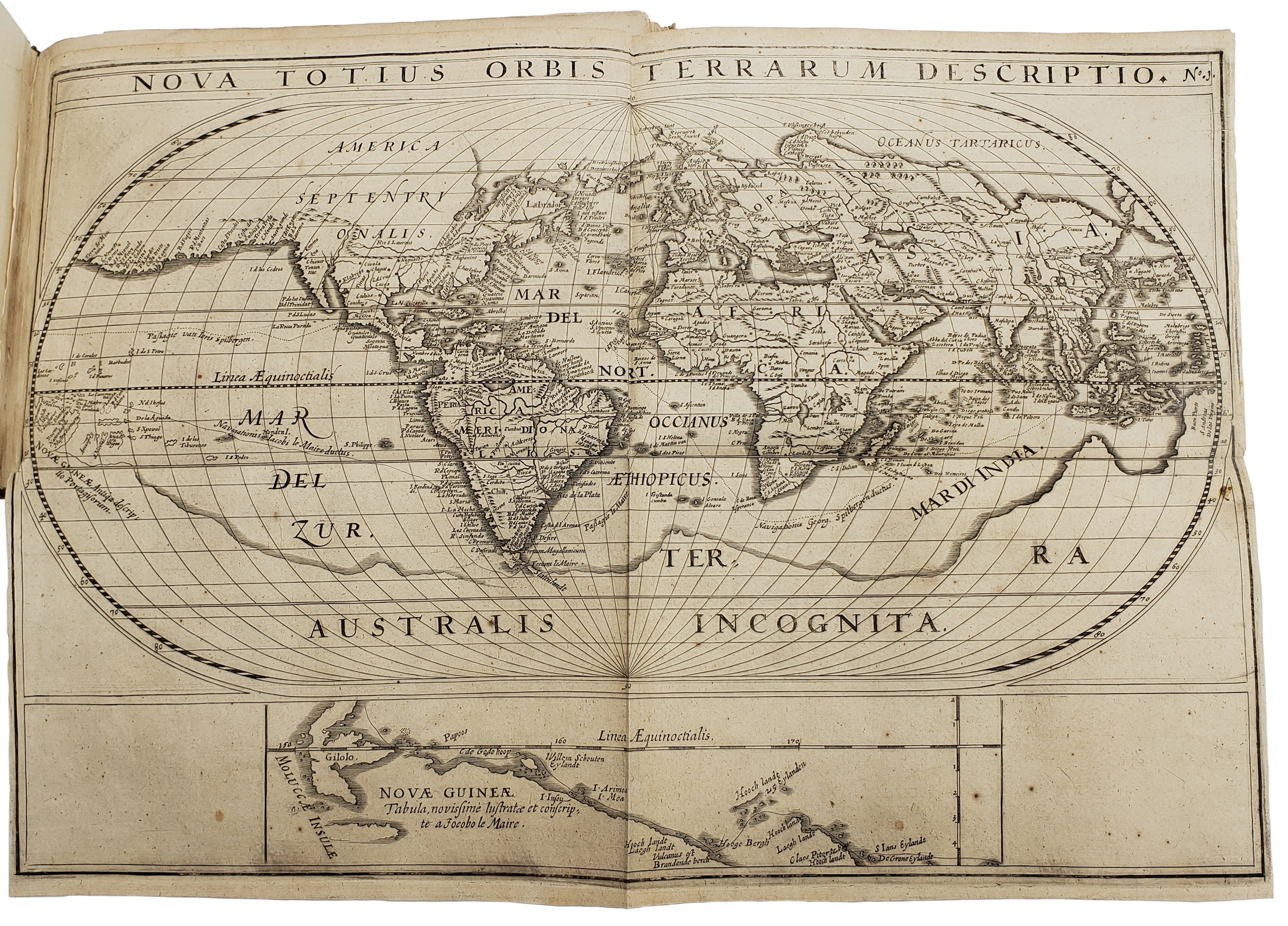 Richly illustrated first French translation of this popular account of Joris van Spilbergen’s (1568-1620) circumnavigation and Jacob Le Maire’s (1585-1616) account of Willem Schouten’s (c.1577-1625) voyage to Australia between 1614-18, first published in Dutch 1619 with a Latin edition appearing in the same year. The maps include a fine folding world map after Ortelius as the frontispiece, the Manila Straits and the Moluccas, and a chart of Le Maire’s voyage. The views of islands depict the often outsized local fauna, including monstrous fish, ostriches, sea lions, penguins, llamas and a condor, as well as a volcanic eruption in the Moluccas.