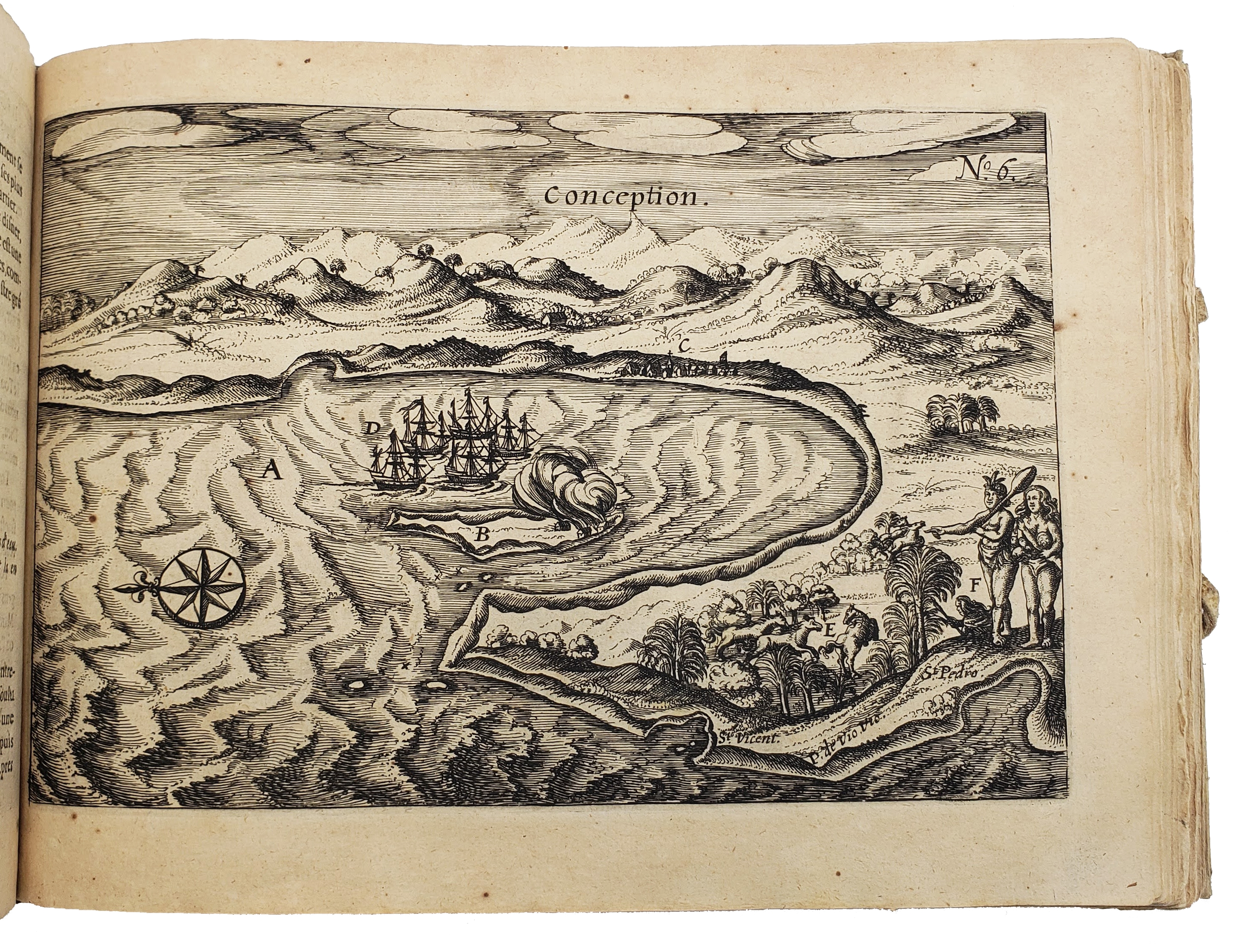 Spilbergen’s voyage is famous for his navigation of the Straits of Magellan in less than one month, which is described here and illustrated with a wonderful folding plate depicting the progression of the ships through the straits, a group of natives, a penguin, and scenes of the Dutch sailors hunting birds and being attacked and killed by natives. Passing up the west coasts of Chile and Peru, the Dutch make attacks on Spanish settlements at La Isla Sancta Maria, Concepciόn, Valparaiso, Quintero and Lima, as well as participating in sea battles by day and night, all of which are depicted here in the plates. The Dutch stop to refuel at Huarmey, where they occupy the abandoned fort from the Spanish, who had fled inland. More combats follow at Paita and, in Mexico, at Acapulco, which is captured, Santiago and Navidad. Crossing the Pacific they sailed through the Philippines and the Moluccas; appended to the narrative is Appolonius Schotte’s (c.1579-1639) discourse on the disputed ownership of the Moluccas between the Dutch, Portuguese, Spanish and English, with a description of the forts on the islands.