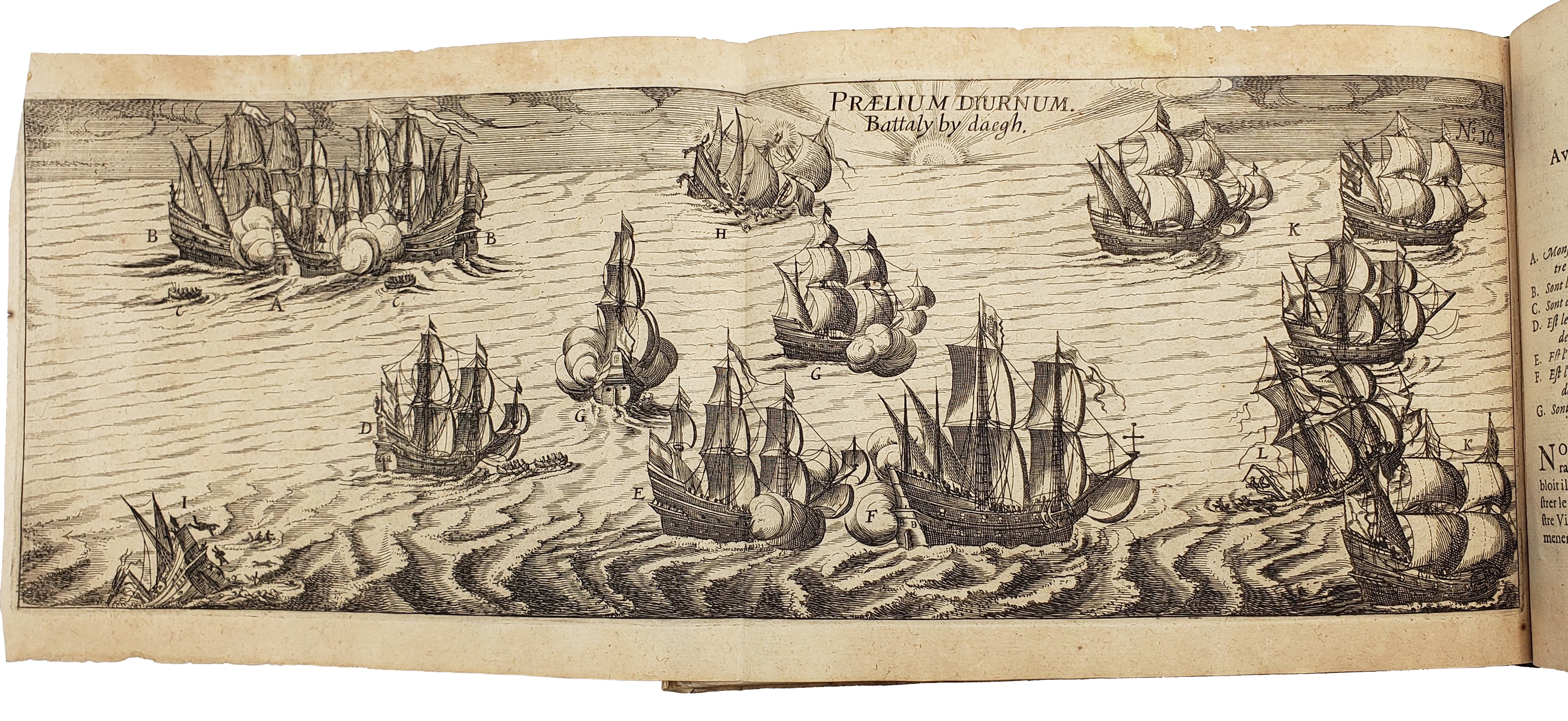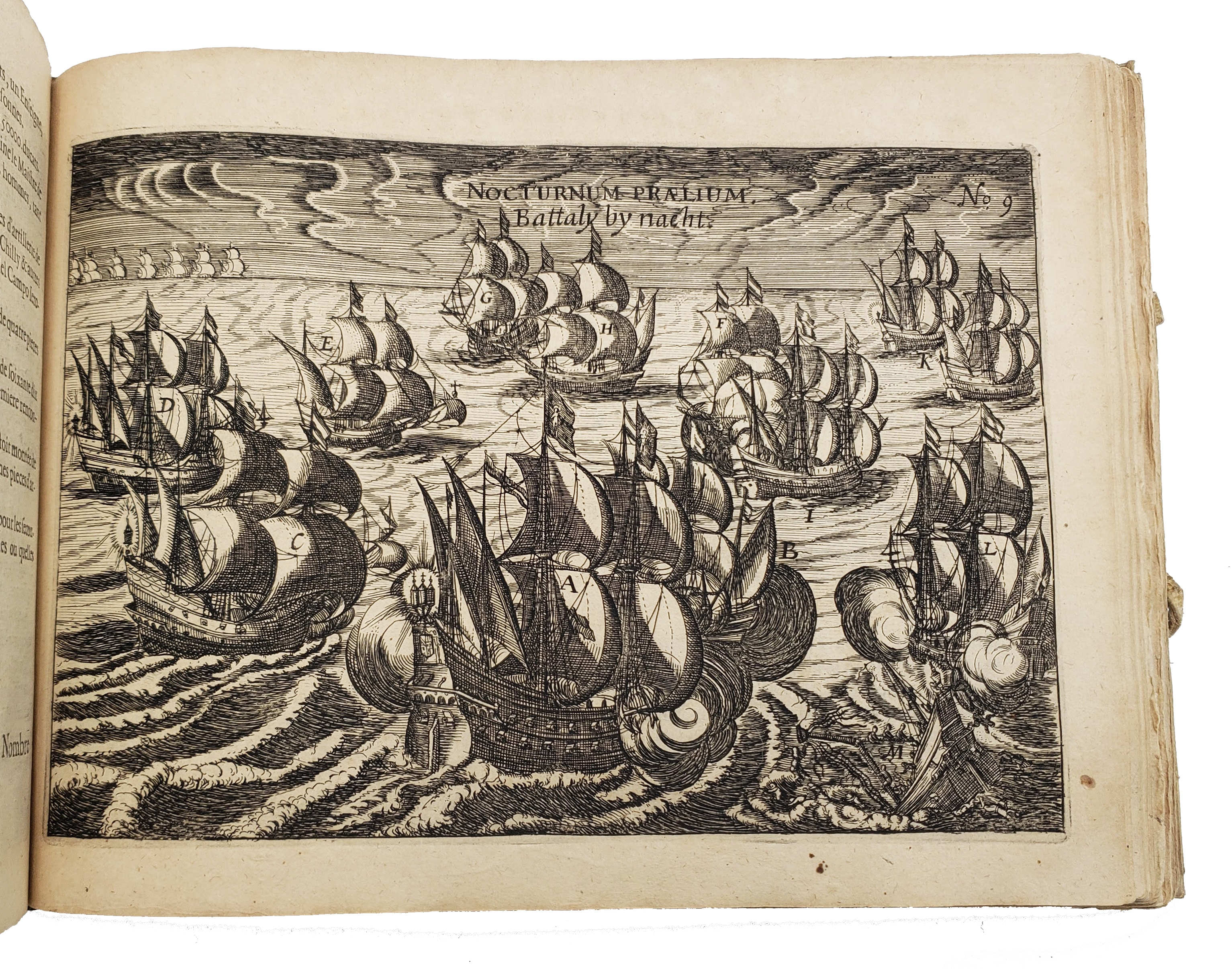 FIRST EDITION thus. Oblong 4to. pp. (iv) 172. Roman letter. 25 engraved plates, seven folding, including fine frontispiece folding world map, unsigned, further maps, views of islands and sea battles, good, strong impressions. Two ll. at start repaired at upper margins, affecting one running title, small ink burn to blank lower margin of plate facing F2r, folding map of Moluccas islands facing N2v with closed tear, small closed tear to blank upper margin of plate facing N3v, closed tear to lower margin of plate facing V3r, small repair obscuring one word to Z4r, a few ll. lightly browned, plates occasionally very lightly spotted, the odd very light mark or spot, mostly marginal, a very good copy in original vellum, spine restored, ties.
