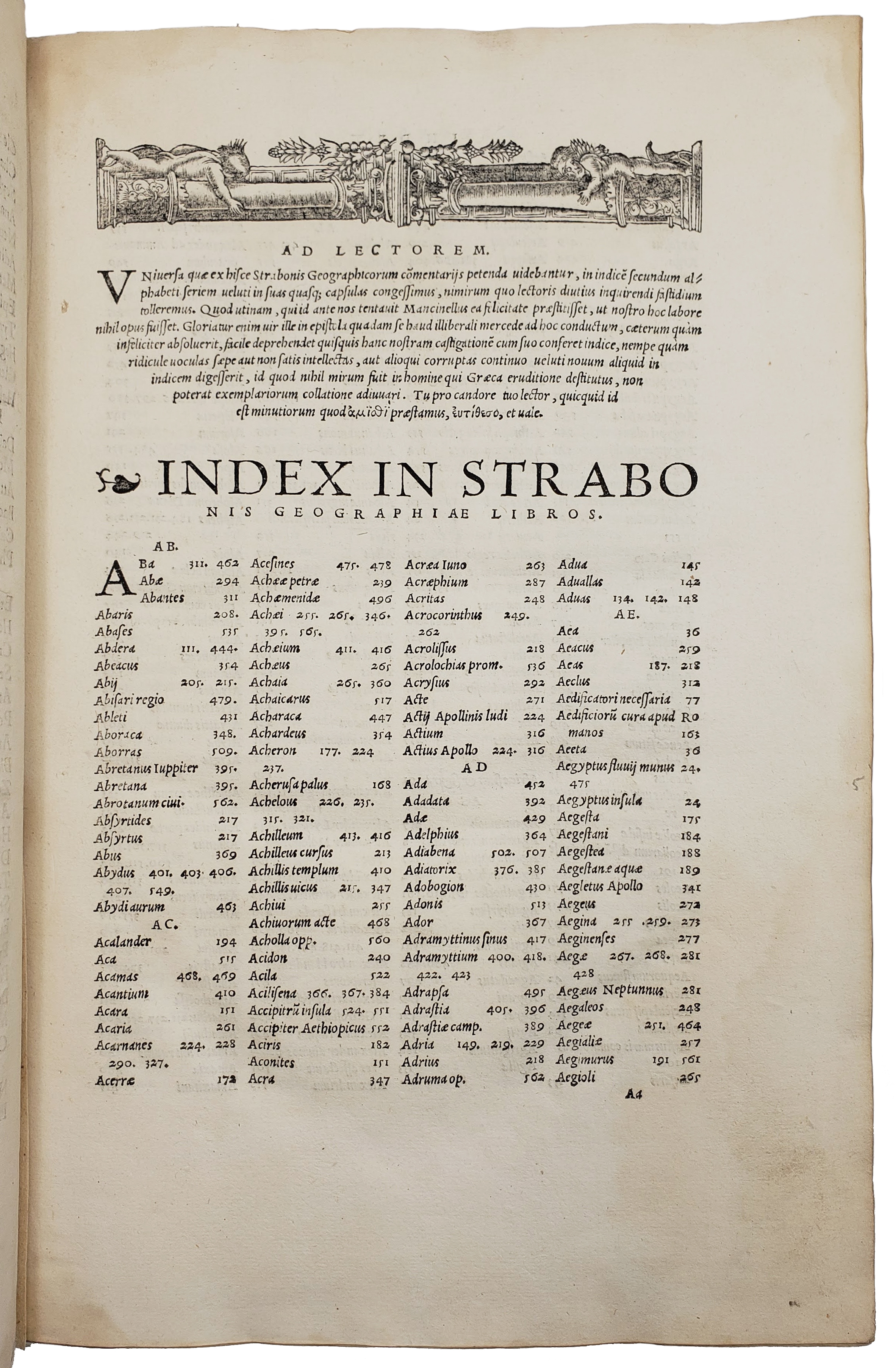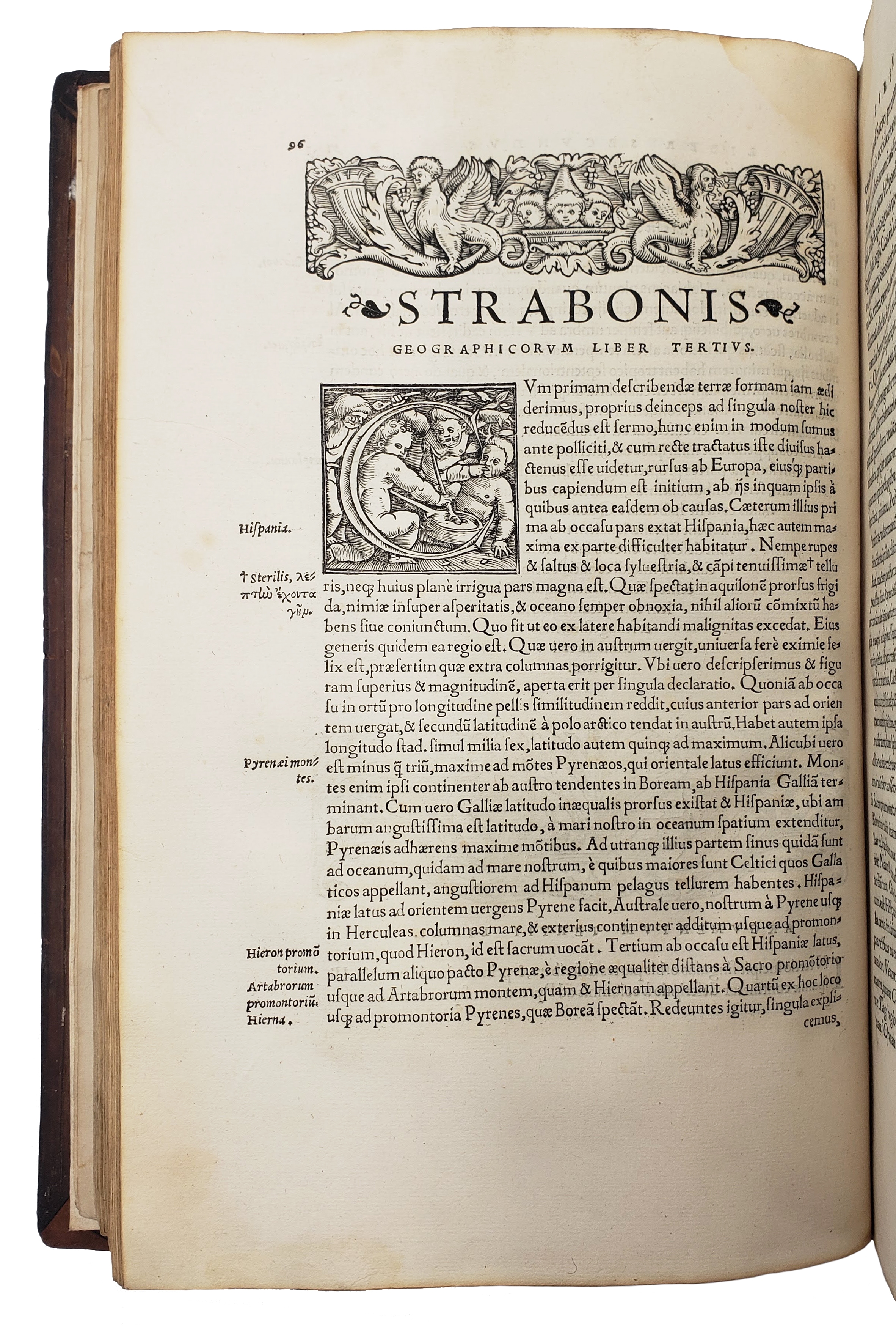 First edition of this Latin translation of Strabo’s Geography by Konrad Heresbach, produced at the bequest of the humanist printer Valentin Curio and attractively decorated, including woodcut initials by Holbein showing putti in various attitudes. The first Latin edition of Strabo’s was Guarino Veronese’s translation, published in Venice in 1469; the Aldine press published the editio princeps in 1516. The English blindstamped binding, almost certainly produced in London, is undoubtedly contemporaneous with the book (Oldham, p. 43).