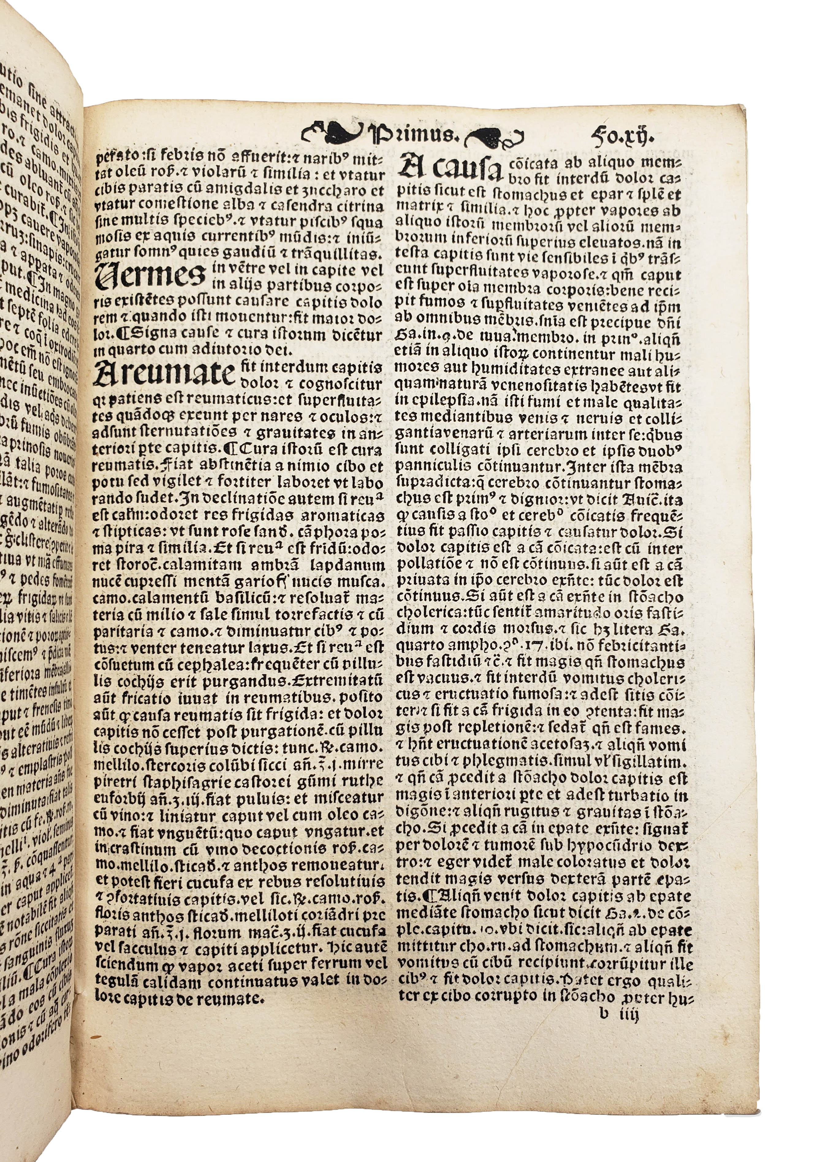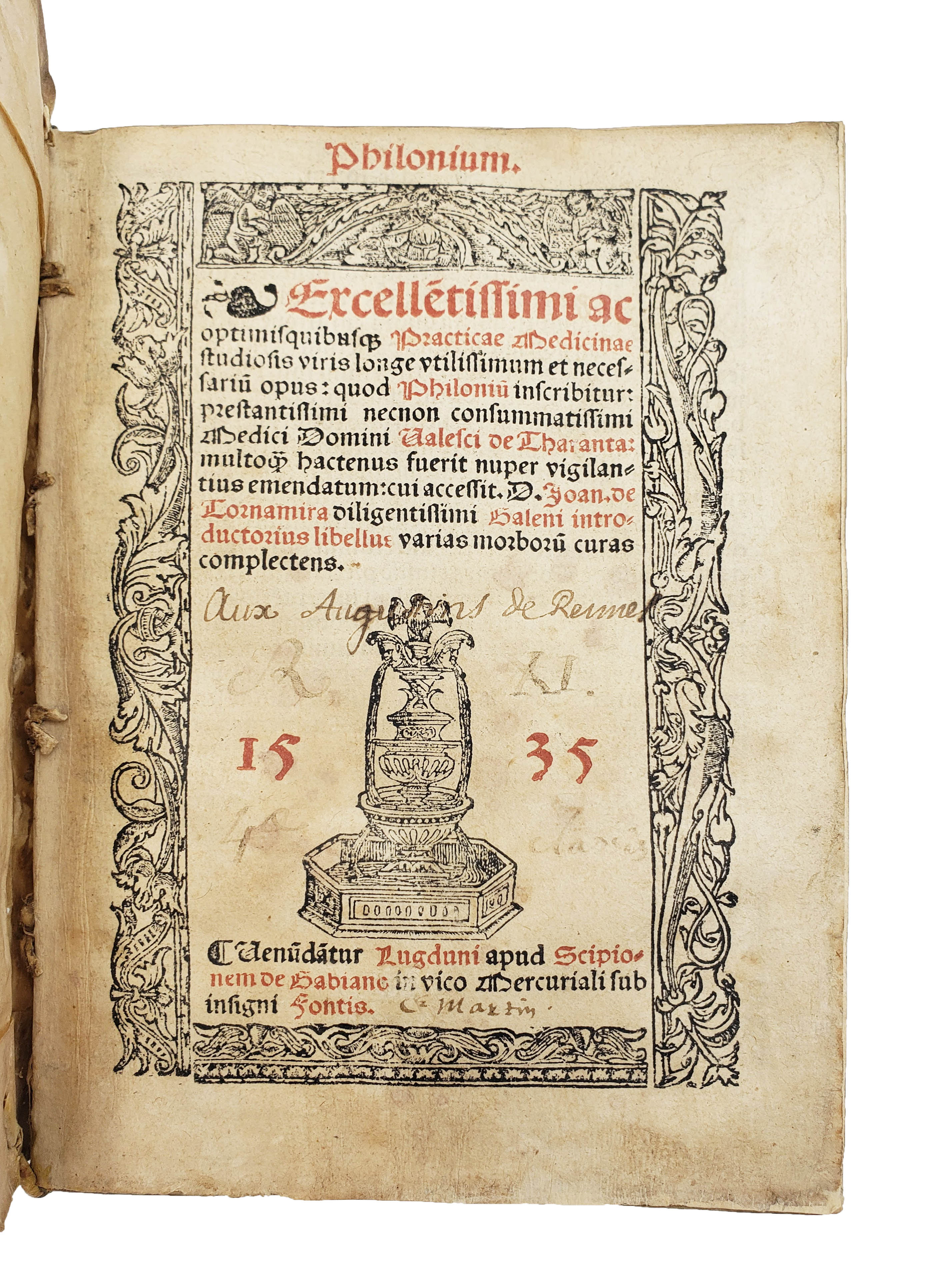 Handsomely printed edition of this popular medical manual, first published in Barcelona in 1484. Valascus de Tarenta (c.1382-c.1417) was a Portuguese physician trained at Montpellier, and ‘one of the foremost teachers and practitioners in Europe (Heirs of Hippocrates). ‘Philonum’ is ‘a general textbook of medicine intended to cover all of medicine except surgery’ (Heirs of Hippocrates), and a priceless reference work for European