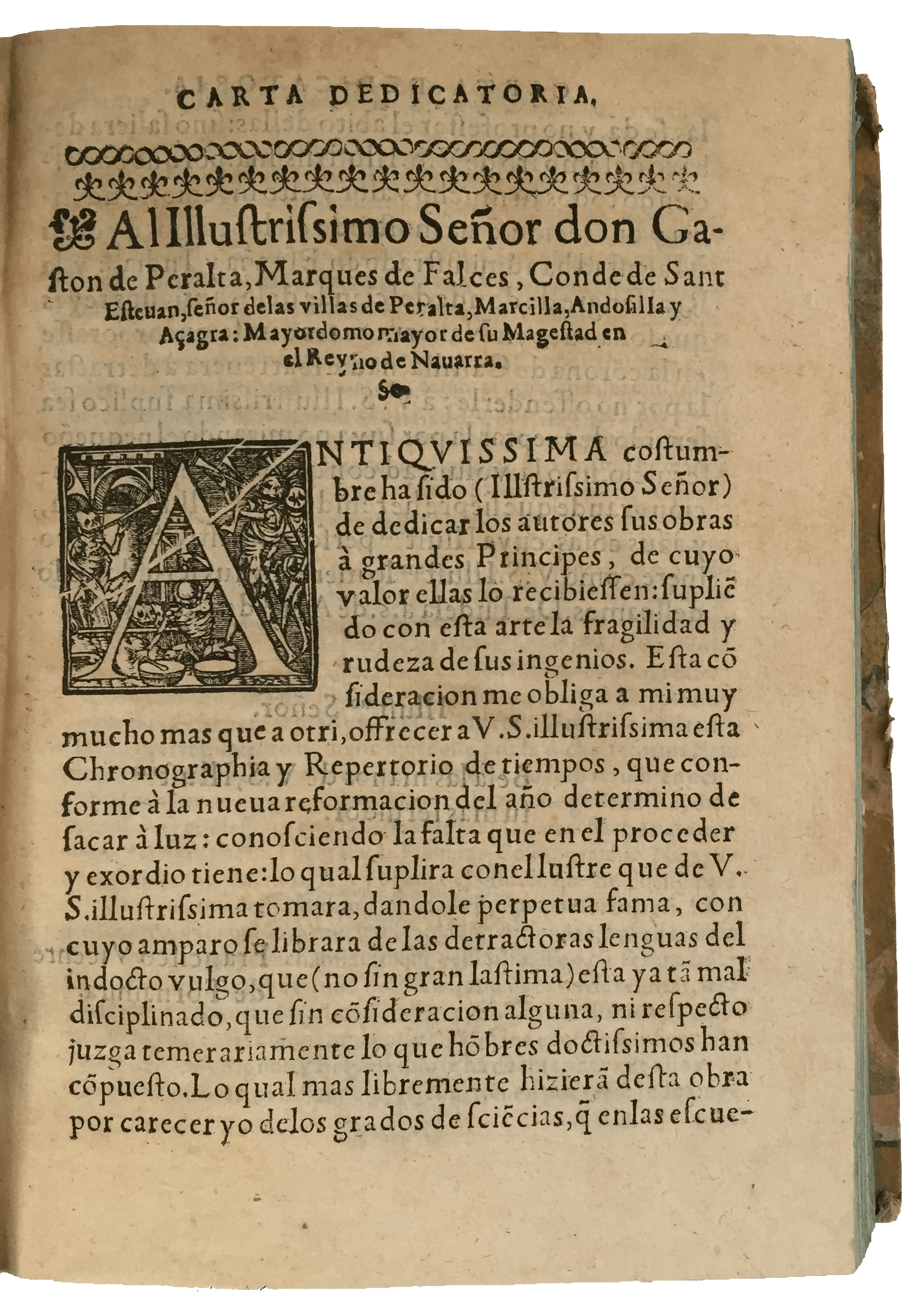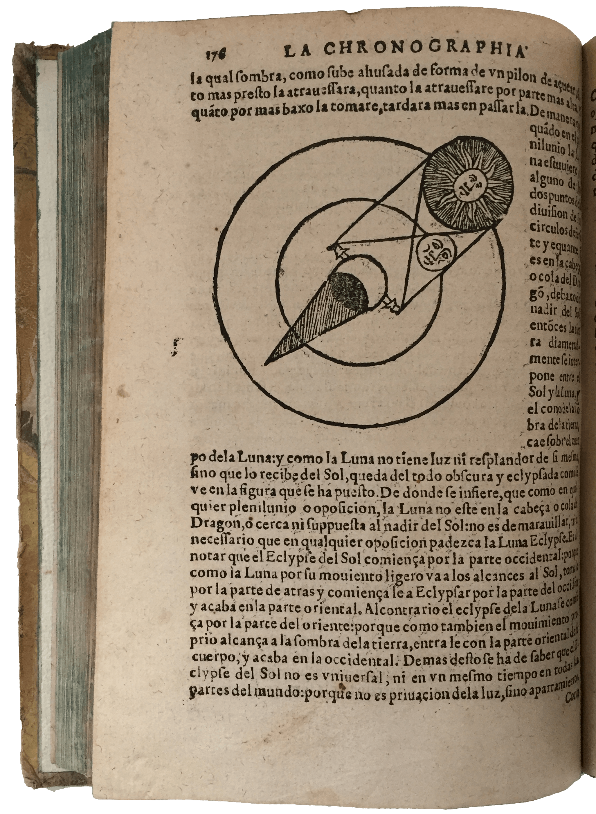 Rare first edition of a wide-ranging astronomical, cosmographical and historical book, one of the first of its kind to be directly written in Spanish. Little is known of the life of Francisco Vicente de Tornamira (1534 – 1597), born in Tudela, Navarre. Chronographia was the most influential work of this prominent Spanish astronomer, illustrating in 162 chapters the creation of the universe, the various branches of philosophy, the movement of planets, the constellations and the Zodiac, the universal chronology realm by realm, a series of calendars, almanacs and weather forecasts. All the subjects were elucidated further with a large number of illustrations, including, most notably, a traditional depiction of the Armillary Sphere and other globes, the Astronomical Man and the Roman gods on their chariots representing the planets named after them.