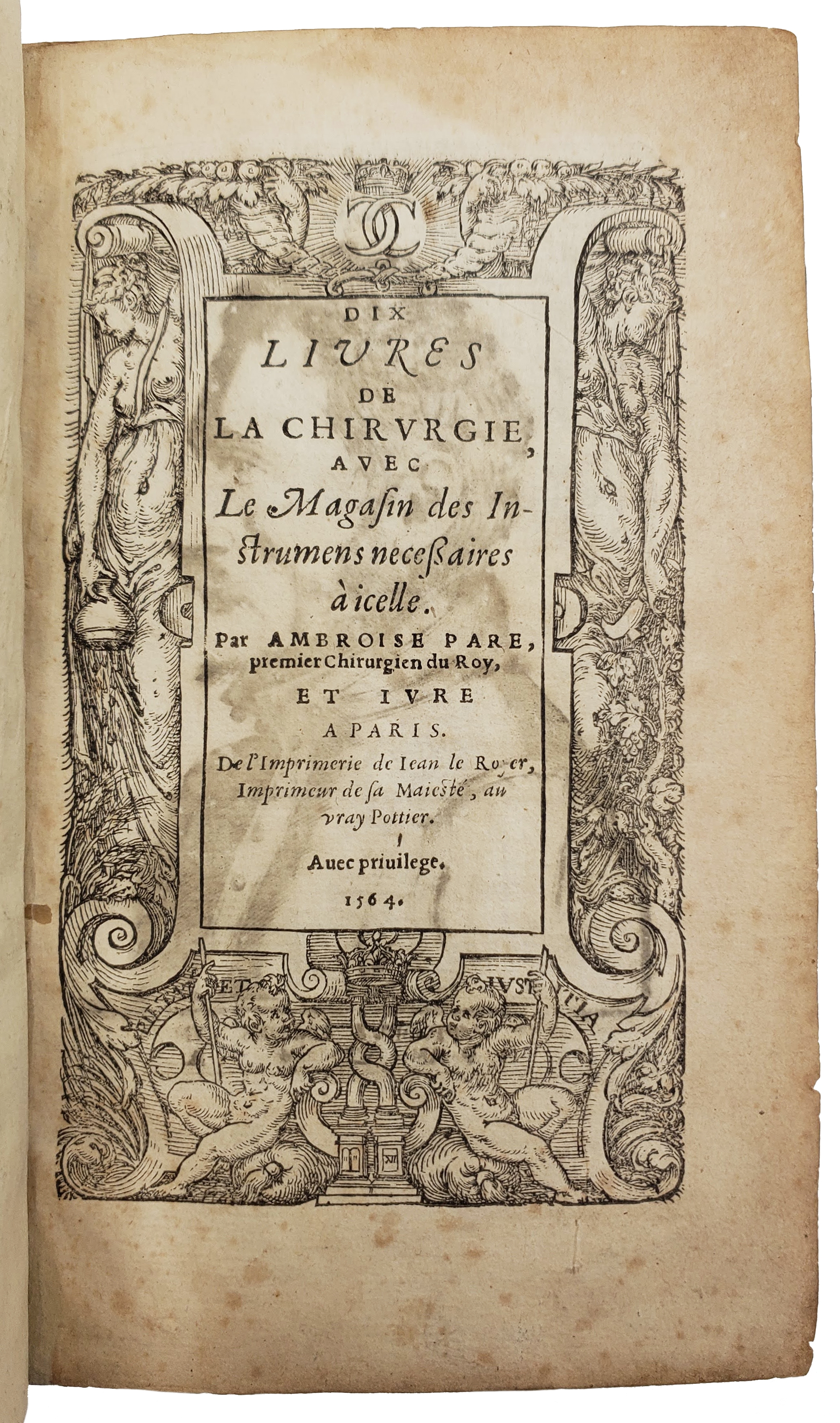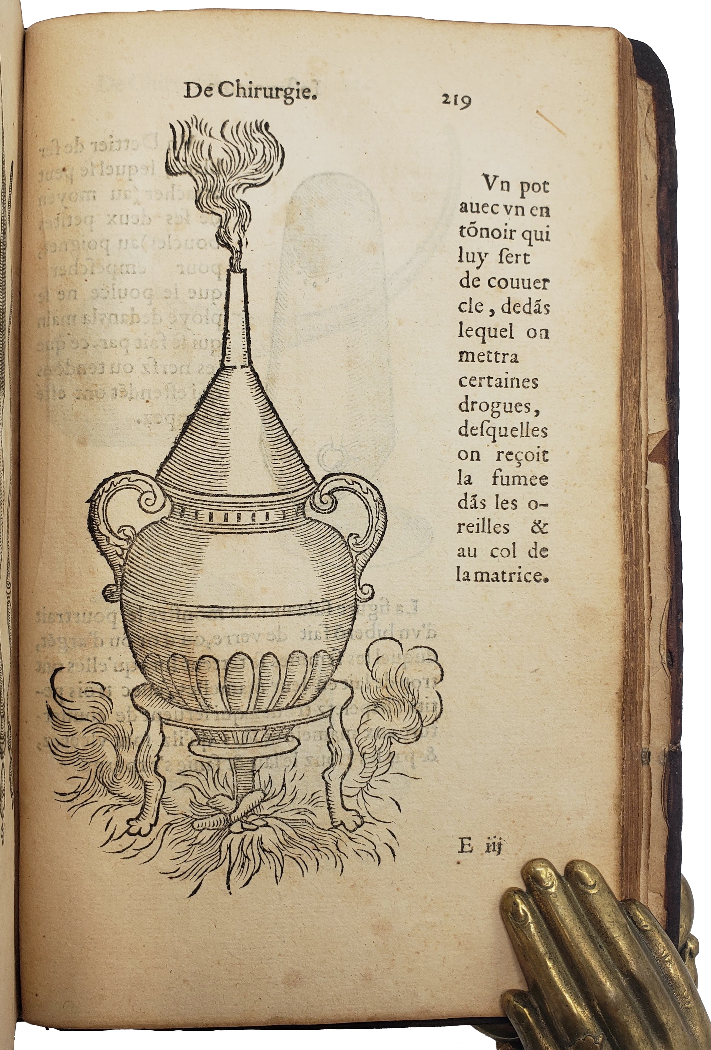 FIRST EDITION. 8vo. ll. (xxvi [‘discours’]) 232 (xxxvi [index]). Roman letter. T-p with woodcut border. Engraved portrait to verso of t-p, light bleeding from portrait to t-p. Numerous ½ and full-page woodcut diagrams to text depicting surgical instruments and procedures as well as skeletal anatomy. Woodcut initials and headpieces. Contemp. panelled calf, gilt, border of triple fillet in blind around central fleuron with fleuron cornerpieces, stained, spine gilt in panels, rebacked and remounted. Some browning, foxing, especially marginal, generally a good copy.