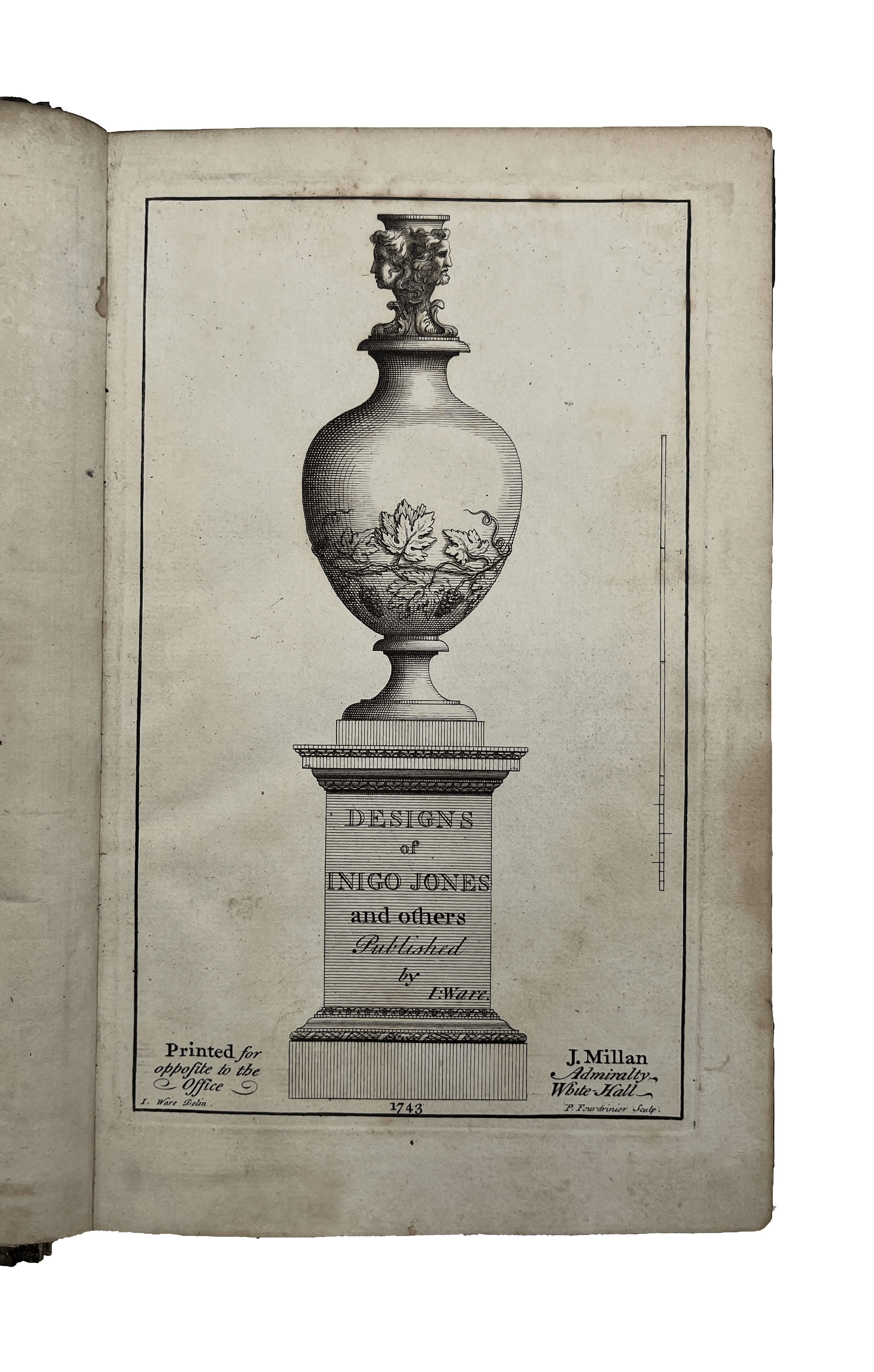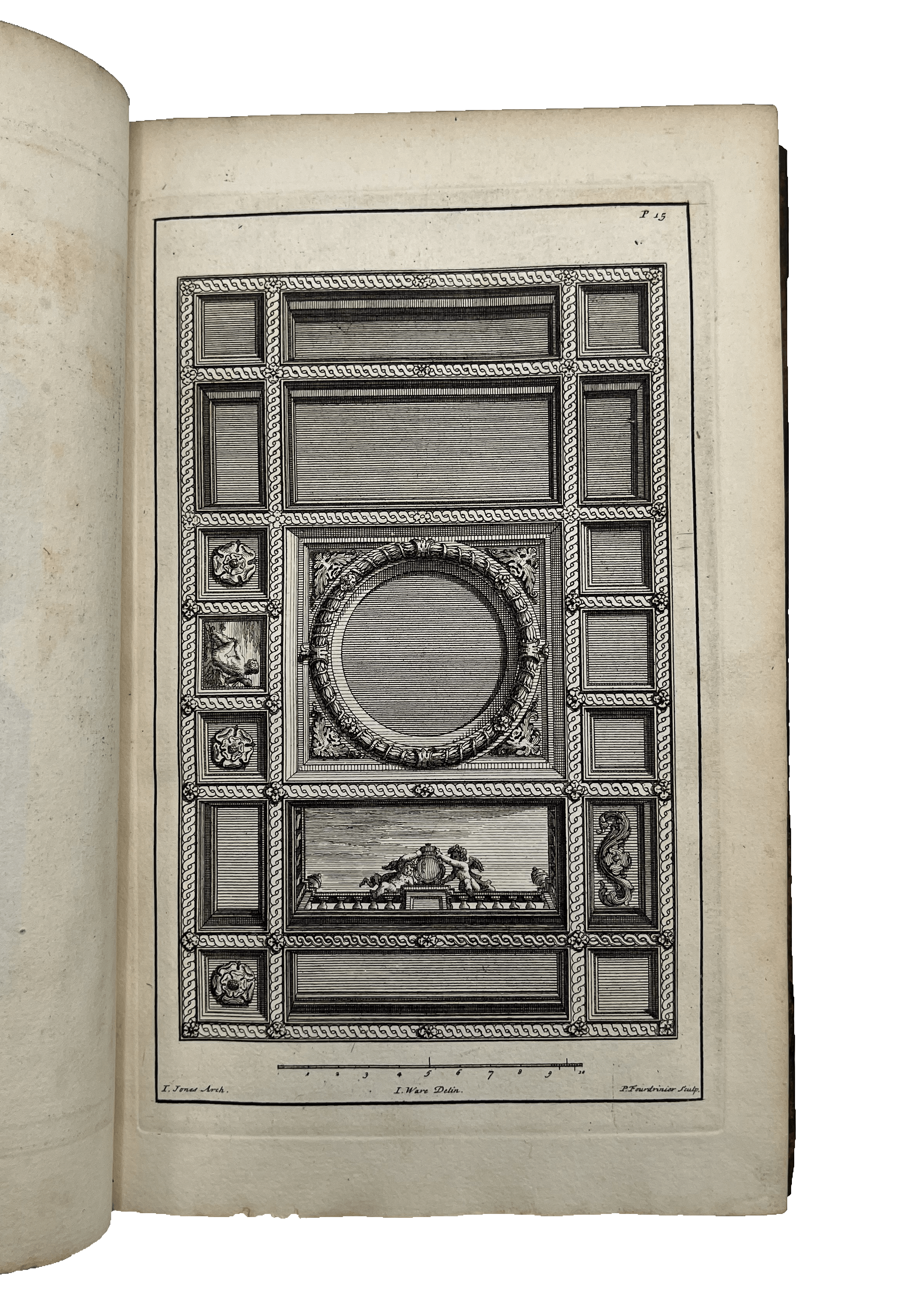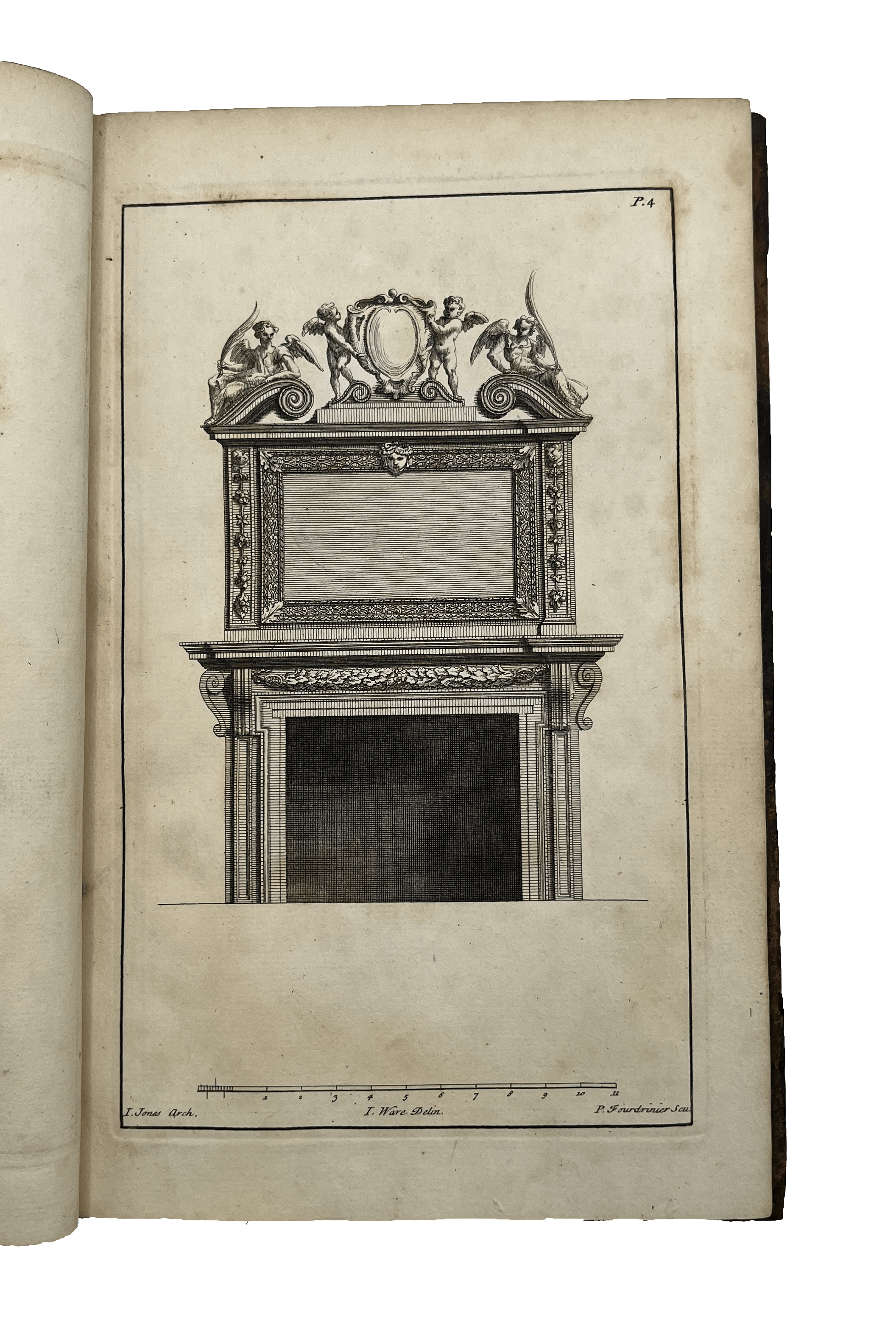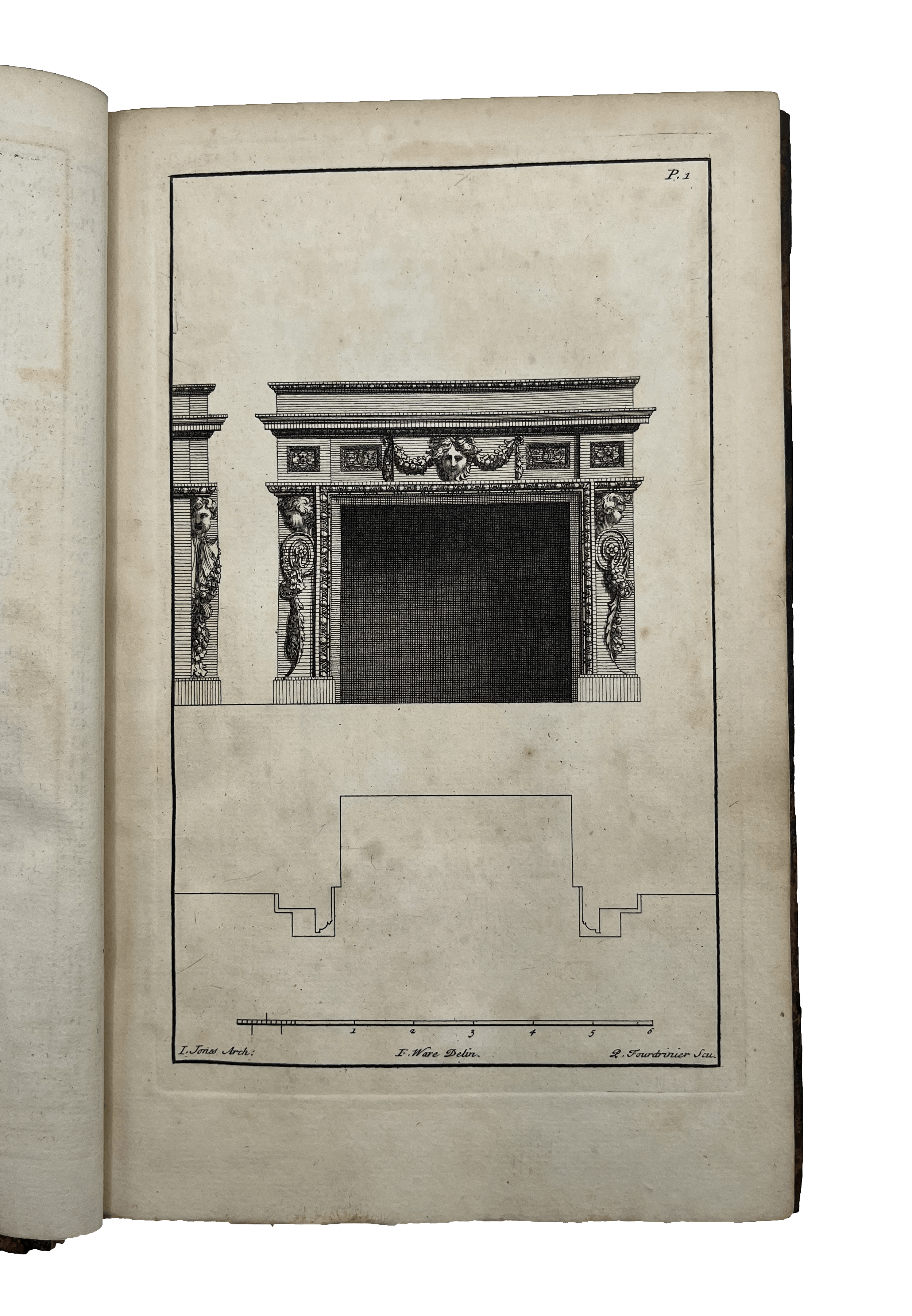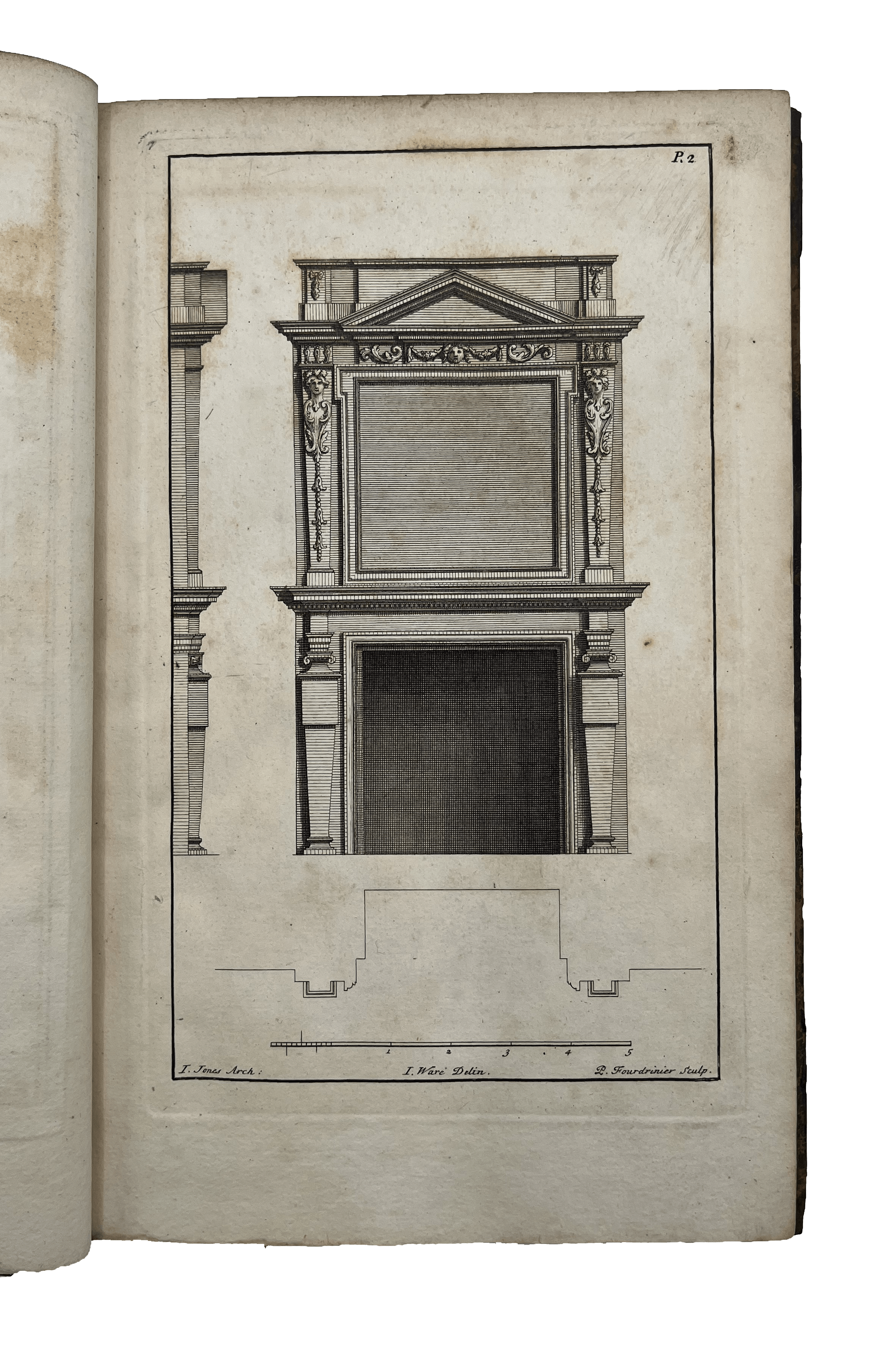 Second Edition of a lovely book featuring architectural designs, plans and ornamental detail by Inigo Jones, William Kent and Lord Burlington. Plates engraved by Paul Fourdrinier (1698-1758), a Dutch engraver and print-seller. They feature a variety of smaller scale designs, all listed in the index at the front, including fireplaces, ceilings and cornices, decorated in classical style, as well as a few sections of rooms, porticoes, stairways and a theatre plan. Ware’s engravings, as well as three designs that were not engraved, can be found in the Soane Museum.
