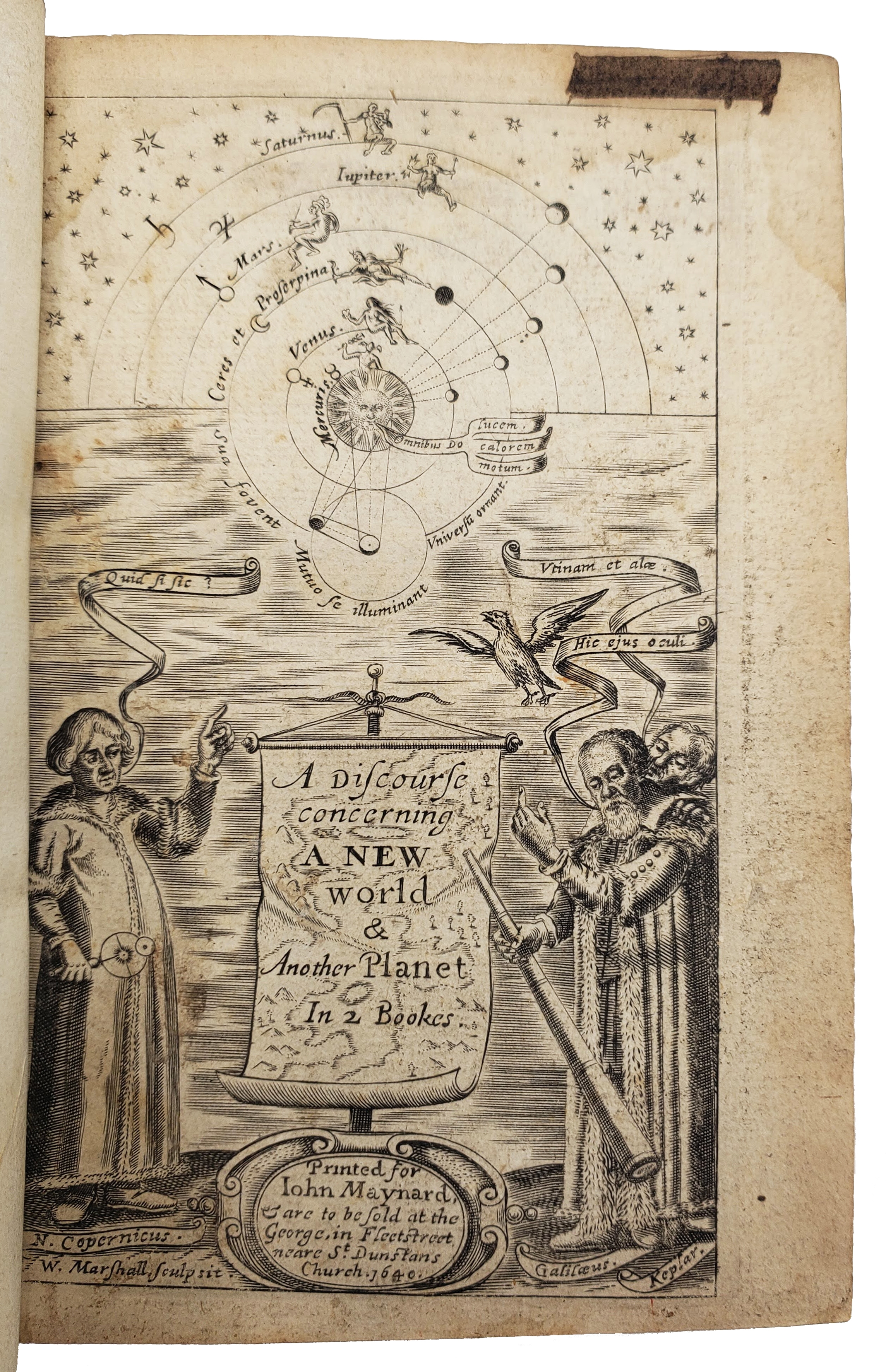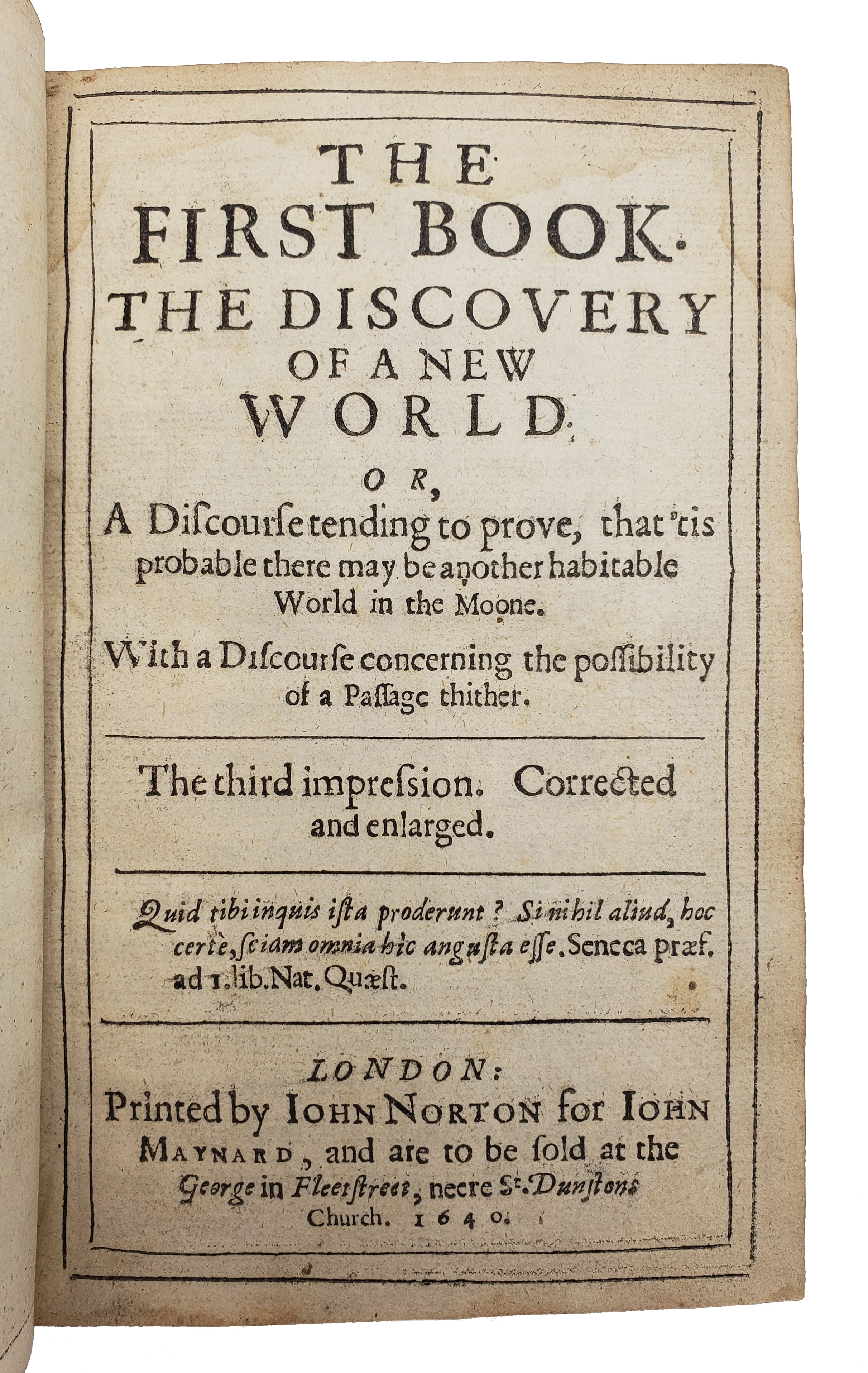 A fascinating and remarkably prescient study of the possibility of life on the moon, with charming woodcut astronomical diagrams. It is the first work in English to consider the mechanics of popular space travel and one of the first works of popular science in any language. The ‘First Book’ was first published in 1638, but this 1640 edition for the first time completed it with a fourteenth chapter including the sensational idea of contriving a way of flying to the moon, alongside a second book discussing the Earth’s status as a moveable planet. A distinguished figure in seventeenth-century scientific circles who went on to become the Royal Society’s first secretary, Wilkins was a strong advocate for a ‘natural theology’ in which ‘[b]oth man and nature are governed by laws that ensure the harmony of religion and science’ (DSB 14 p.361). His Discourse brings these theories to bear in a set of propositions defending the views of Galileo, Copernicus and Kepler as well as the merits of experimental philosophy to aid Scriptural interpretation.