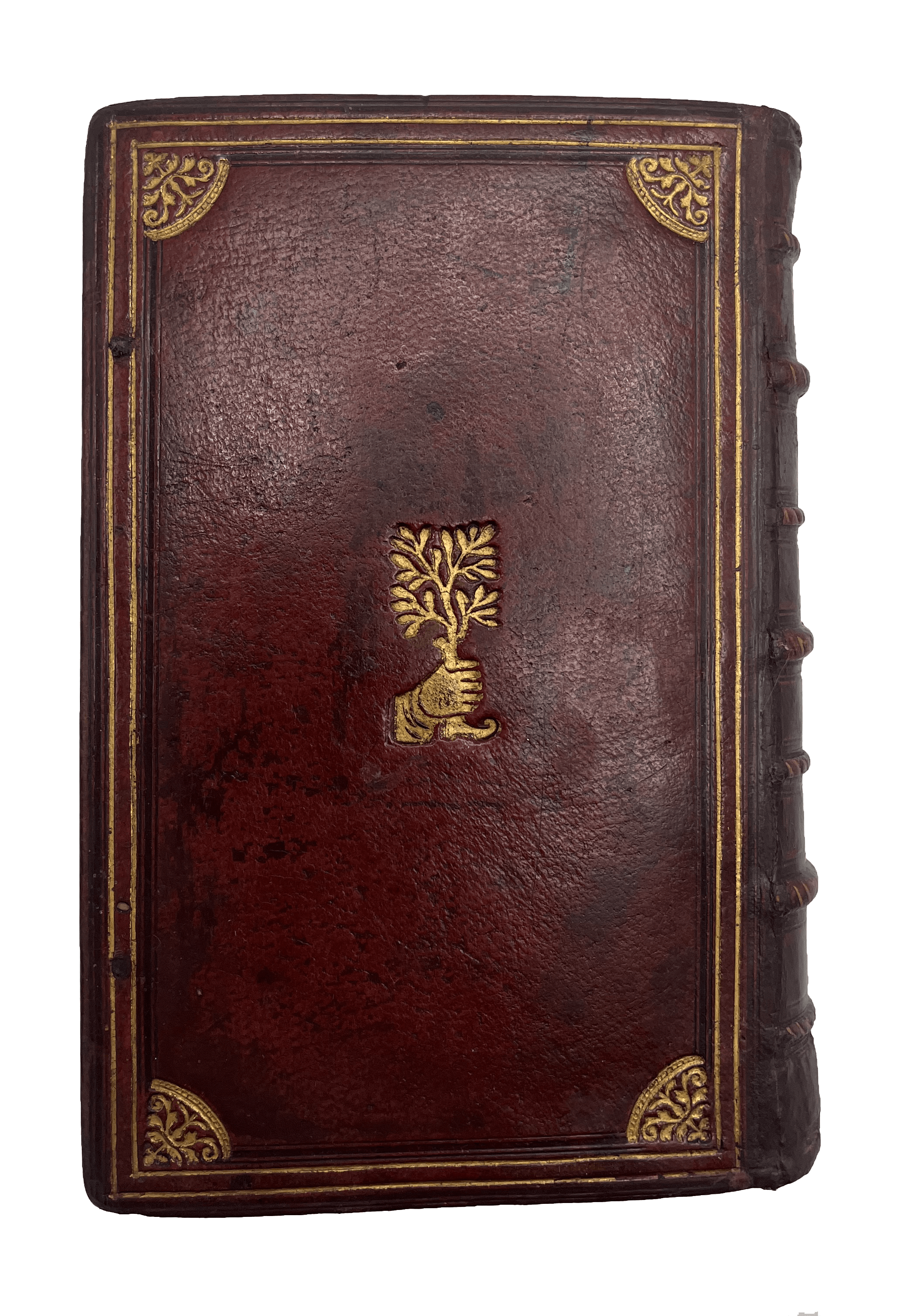 The charming contemporary bindings feature an abstract emblem, a hand holding a sprouting branch, which bears a striking resemblance to the ‘dextrocherium’ motif, a hand holding a spray of flowers, symbolising wisdom and learning. ‘Like many other motifs of book decoration, it may have perhaps originated as a personal device of some […] royal personage and then become a more or less generally used decorative tool, without any particular implication of ownership, or other significance, like the dolphin, the spot of ermine, the Burgundian briquet or the portcullis in England.’ (Goldschmidt p.295) Michael Isengrin’s palm tree device also shares a horticultural theme; he joined the guild of gardeners in 1530, before starting to print alongside his stepfather in 1531. His work predominantly focused on the classical authors such as Arsitotle, Xenophon, Isocrates, Galen and Plutarch.