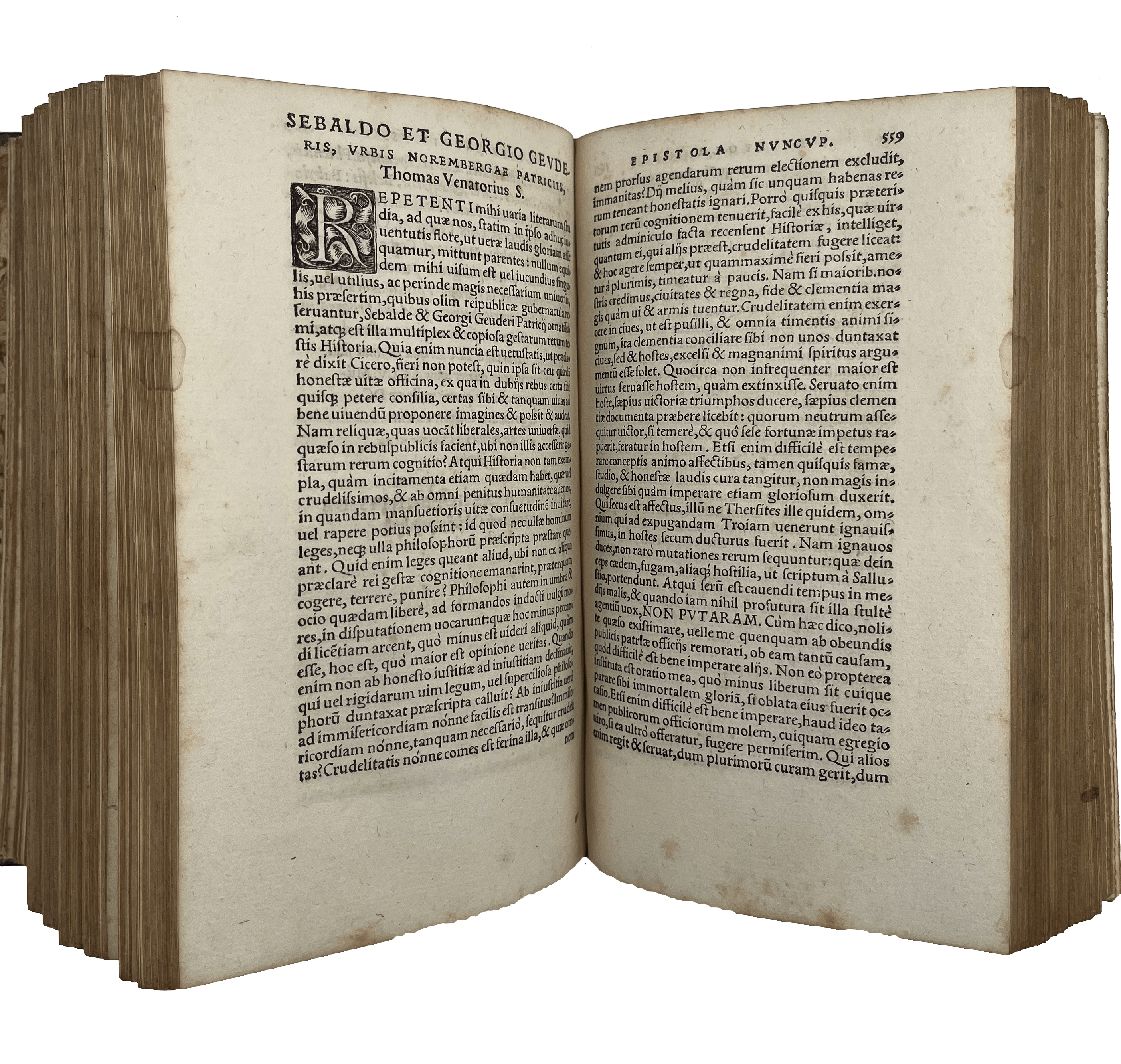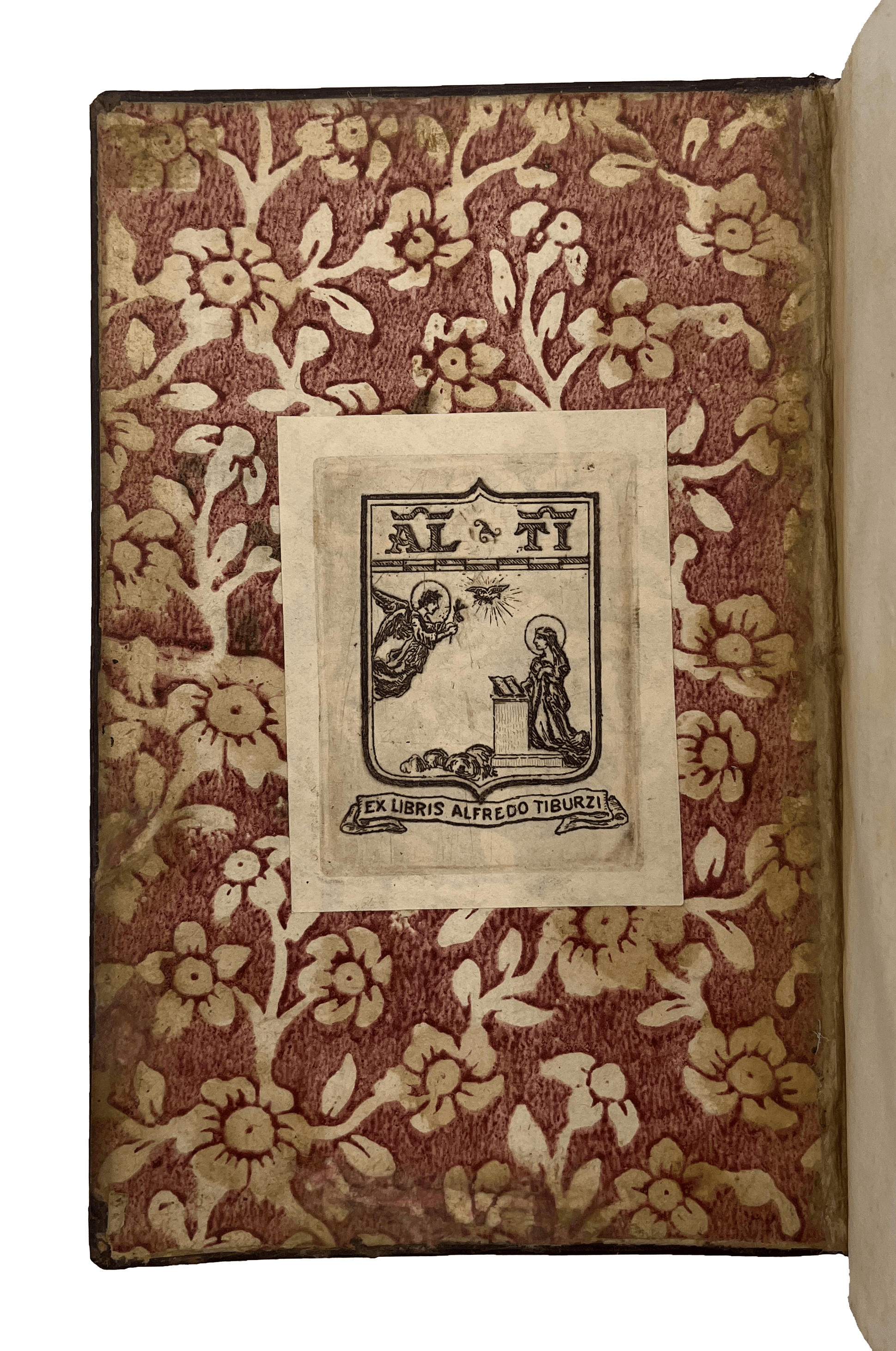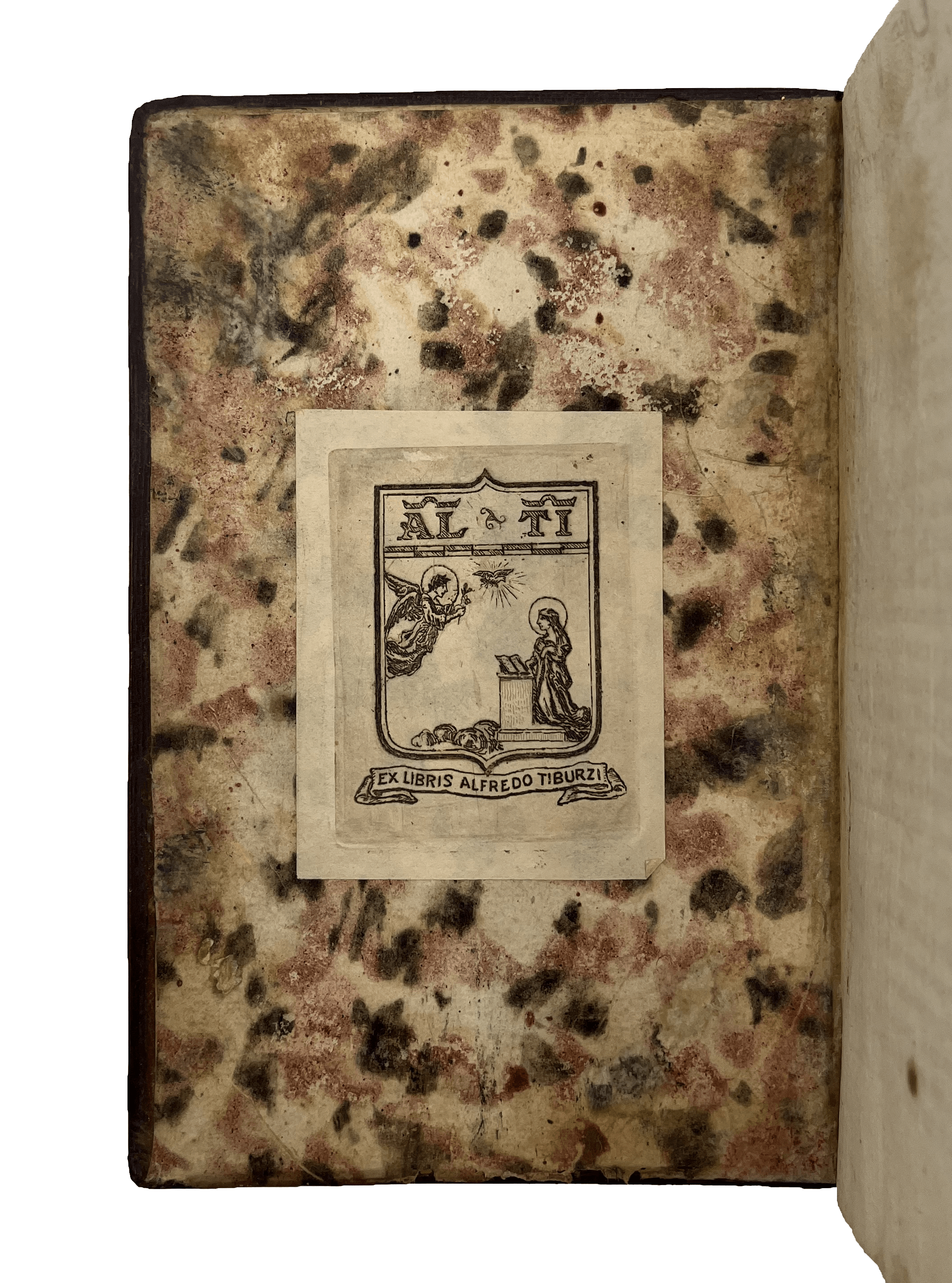 8vo.2 vols. pp. [22] 820, 450. Italic letter, little roman. Printer’s device to t-p, figurative woodcut initials and printed marginalia throughout. Index of memorable historical events and errata preceding text in vol. I, ms. religious dedication to verso ffep. in vol. II. Very light age yellowing, repaired marginal worming to first few leaves of both vols, some marginal staining, repairs to a few gutters. Good, clean copies in most handsome 16th C Italian, probably Roman, deep red morocco, double gilt rules with fleurons to corners of inner frame, gilt emblematic tool of a foot shaped sprouting branch gripped by a hand, author’s name and volume no. lettered in gold above, raised bands, some worming to spine, a.e.g, lacks ties. C19 bookplate of Alfredo Tiburzi to front pastedown.