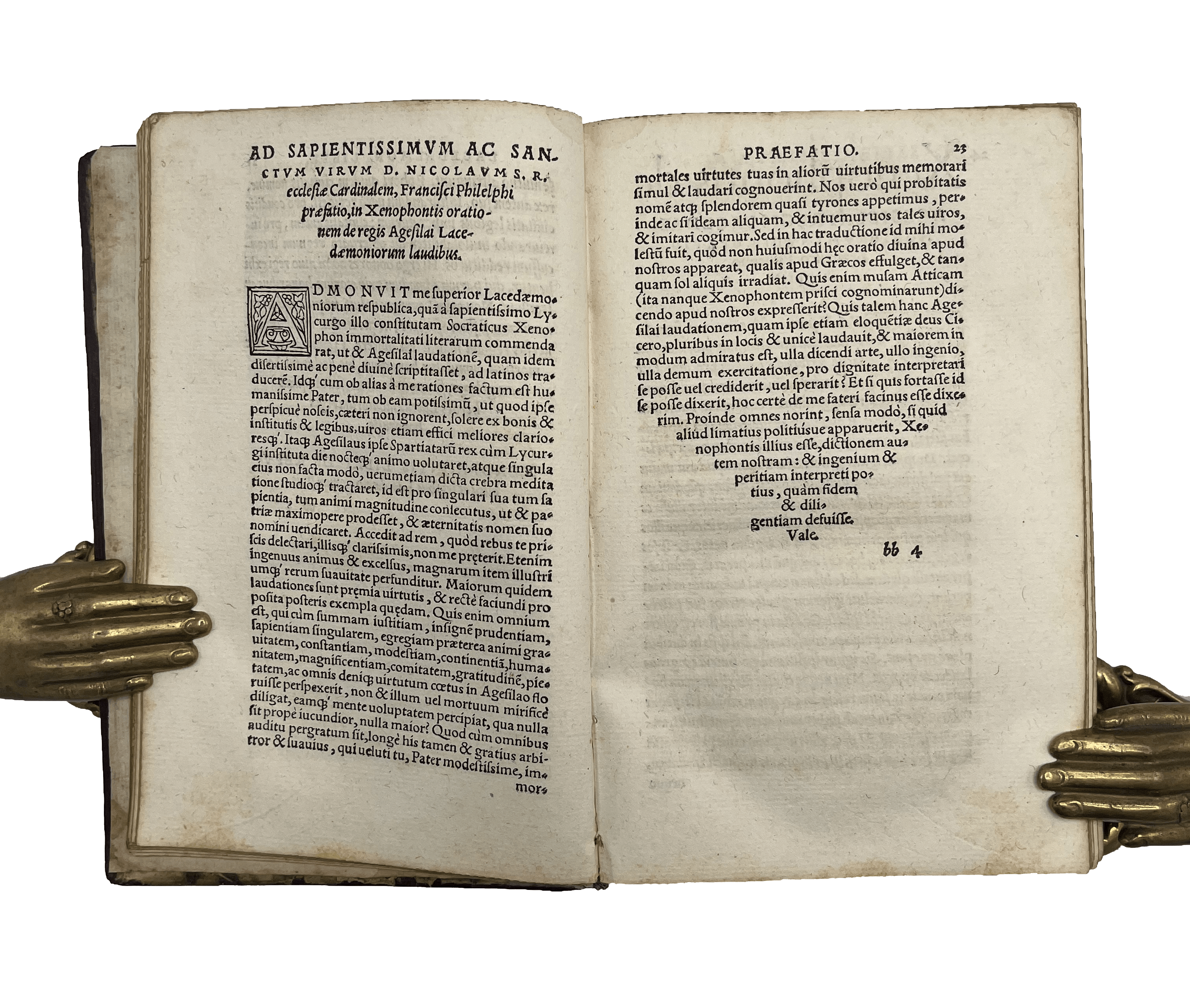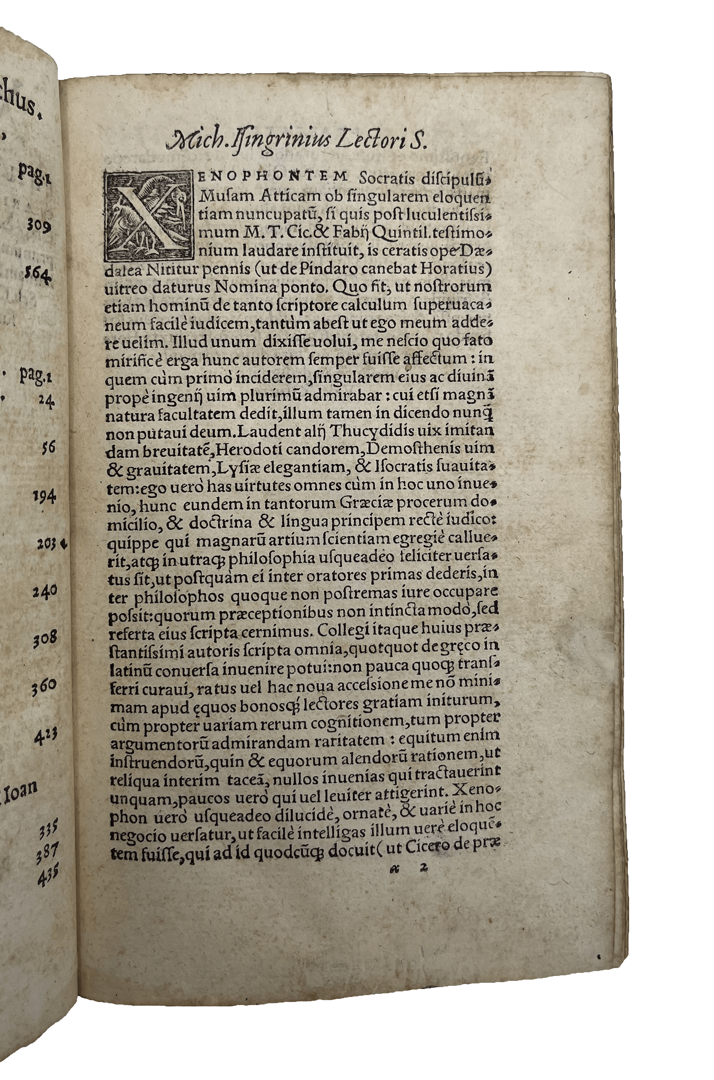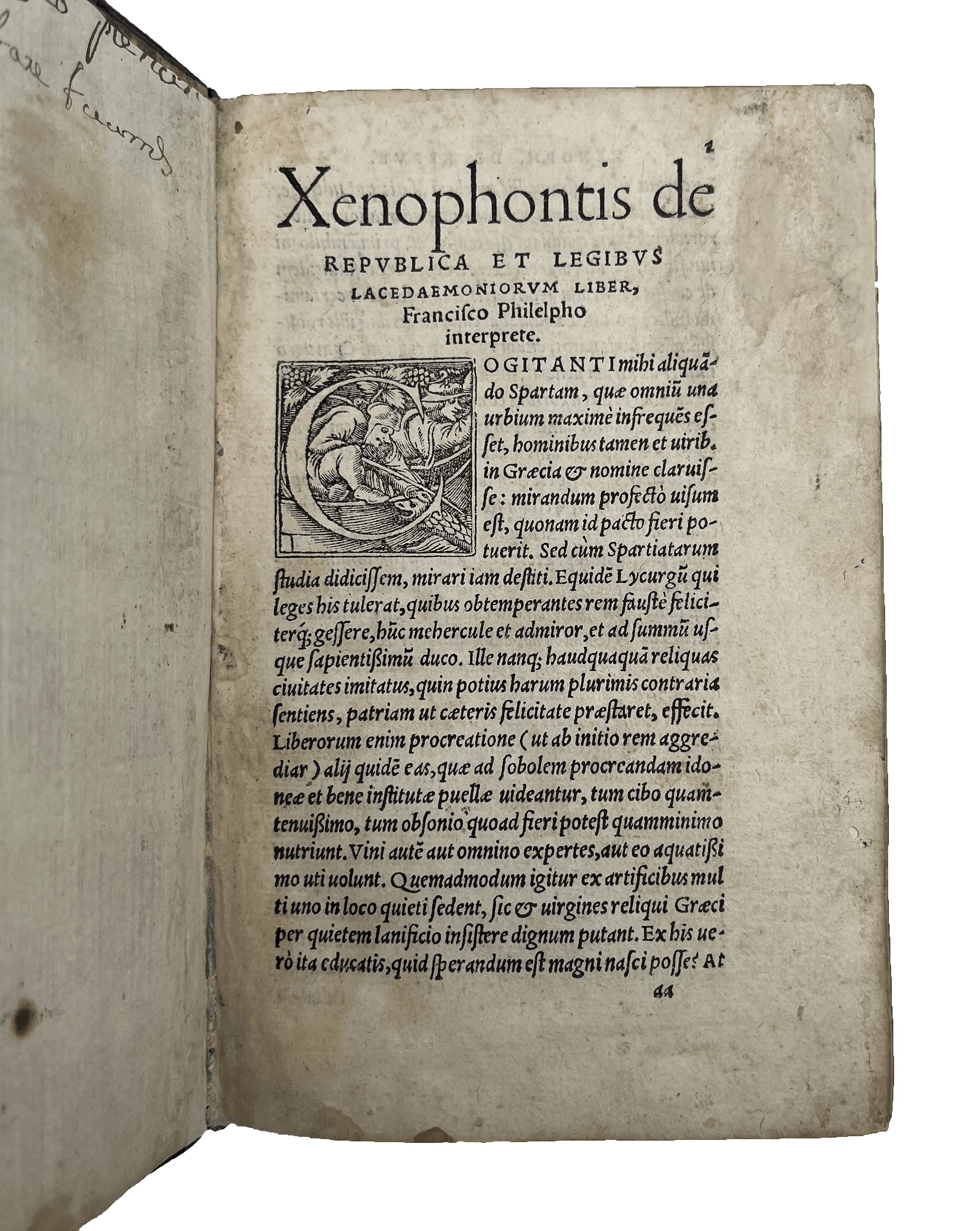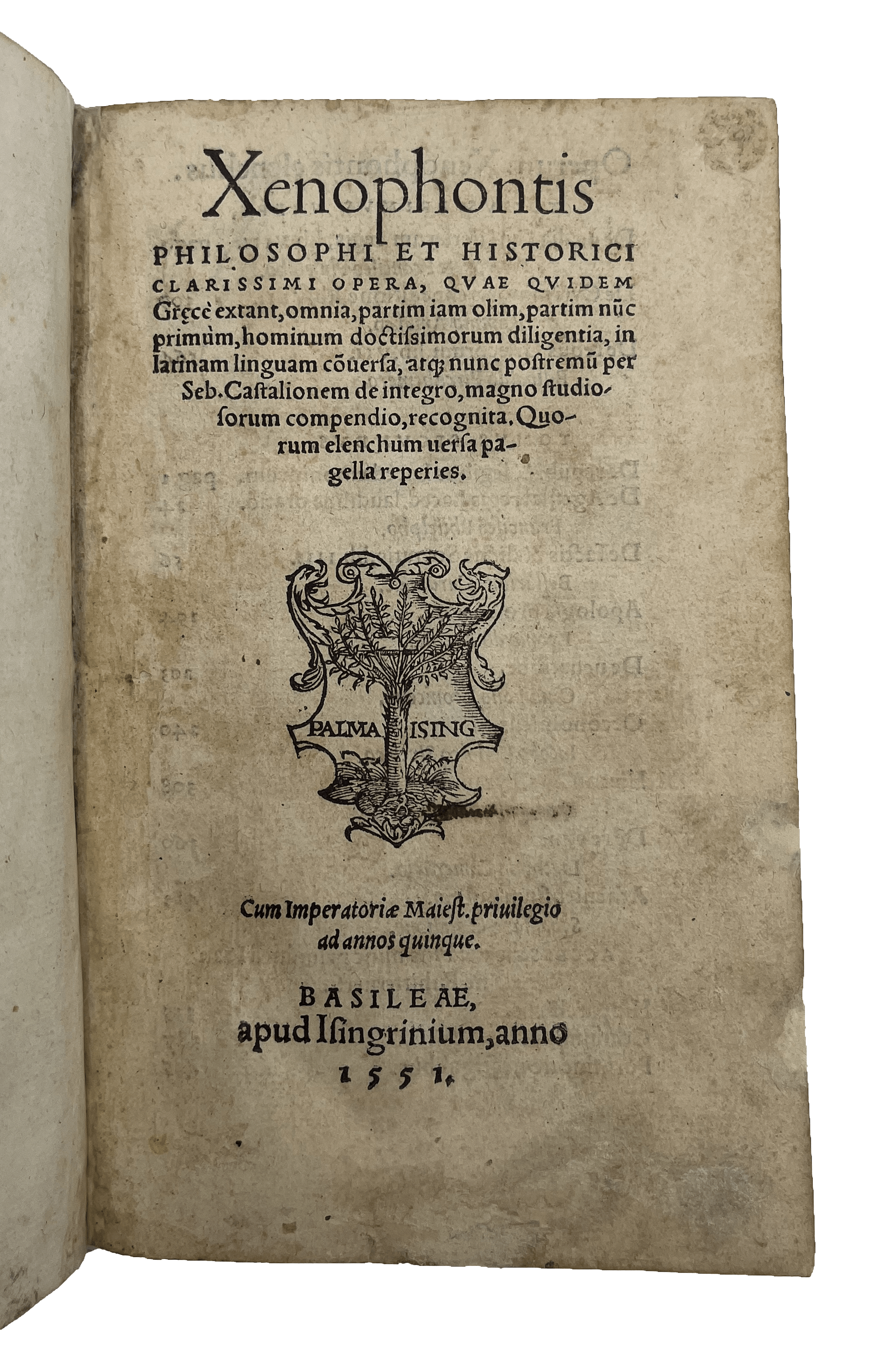 A very attractive pair of finely bound copies of the work of Ancient Greek historian Xenophon (430-350BC). It is a Latin translation of the famed ‘Basel edition’, published by Sebastian Castalio (1515-1563) while he was a professor of Greek there, for which he used the corrected editions of Junta with the help of mss. as its basis.