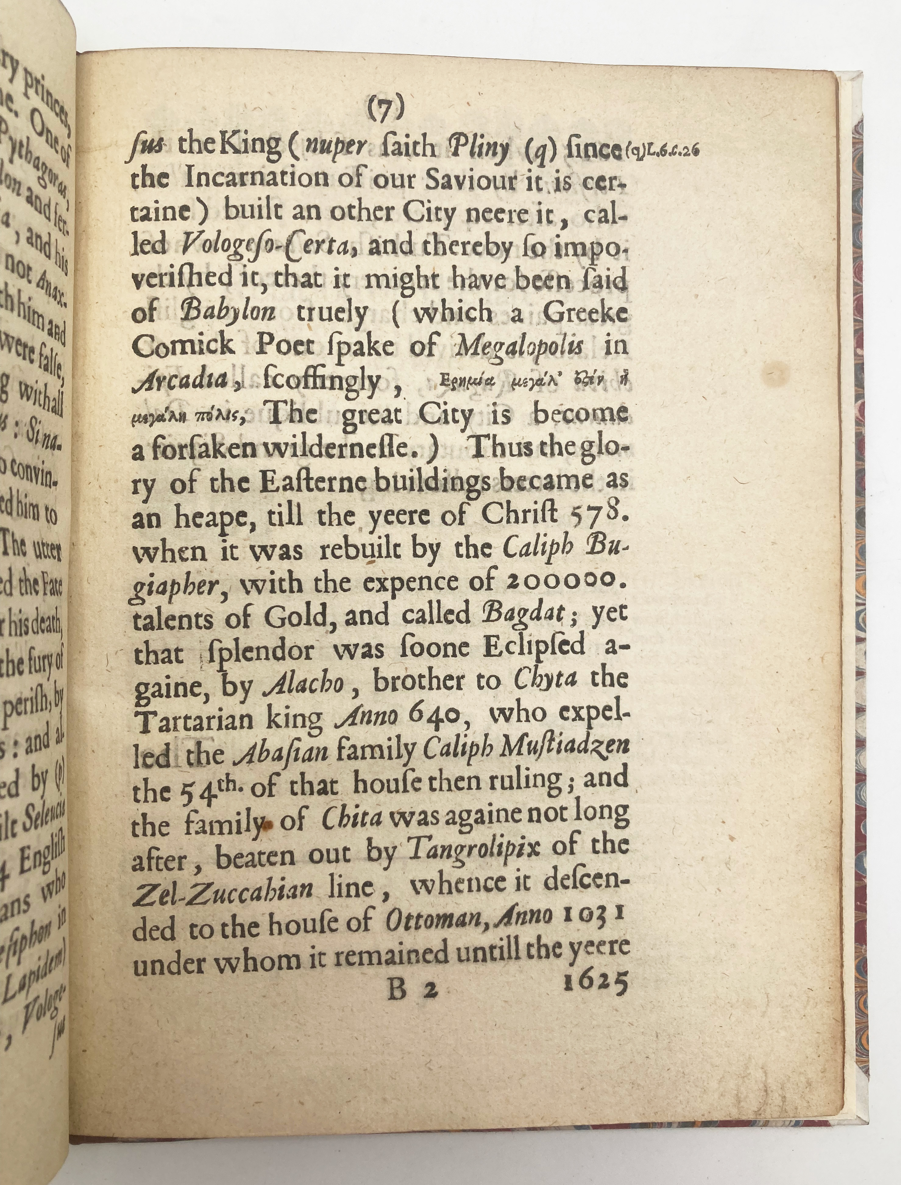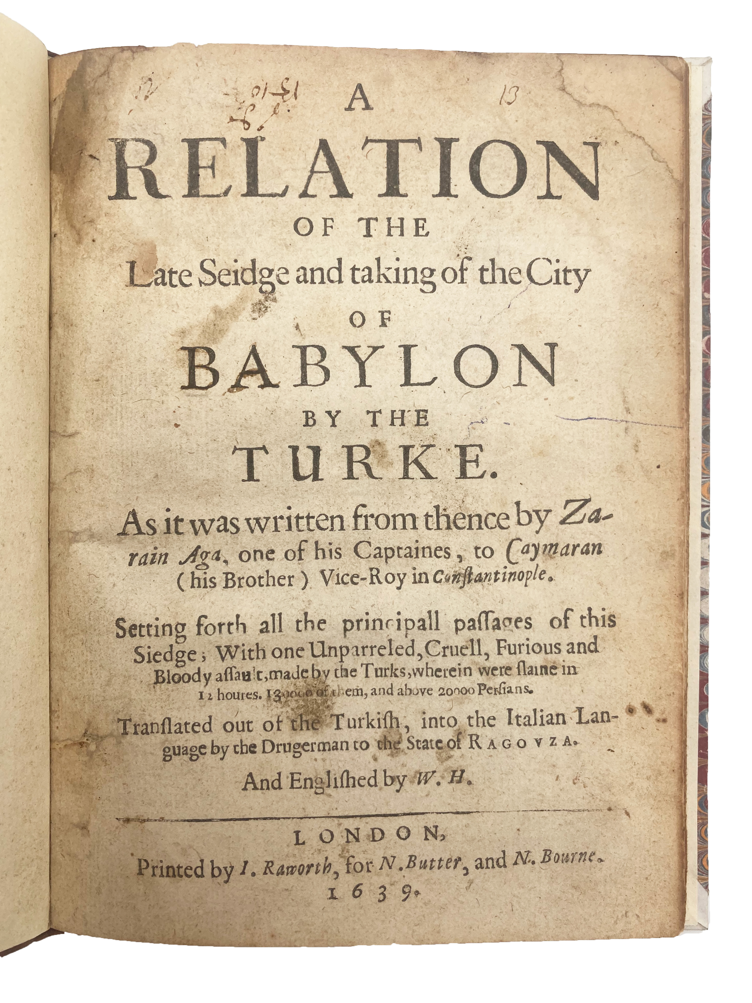 An interesting contemporary account of the siege of Baghdad (Babylon) in 1638 during which Sultan Murat IV reclaimed the city from the Persians. The account was first translated from Turkish into Italian by a dragoman (interpreter) in Raguza and subsequently “Englished” by William Holloway. Though no such captain Zarain has been traced, Holloway affirms the authenticity of this account in his letter on the final leaf: “This foresaid relation is here of all held for a certain truth, this State having sent the selfe same news to the Pope and Viceroy of Naples, and hath also beene confirmed to bee true, by 100 severall Carryers…” Nonetheless, Holloway’s translation carries an obvious bias as he makes frequent jabs at the Zarain and the Ottomans in his marginal notes, never missing an opportunity to accuse them of blasphemy for their allegiance to the sultan.