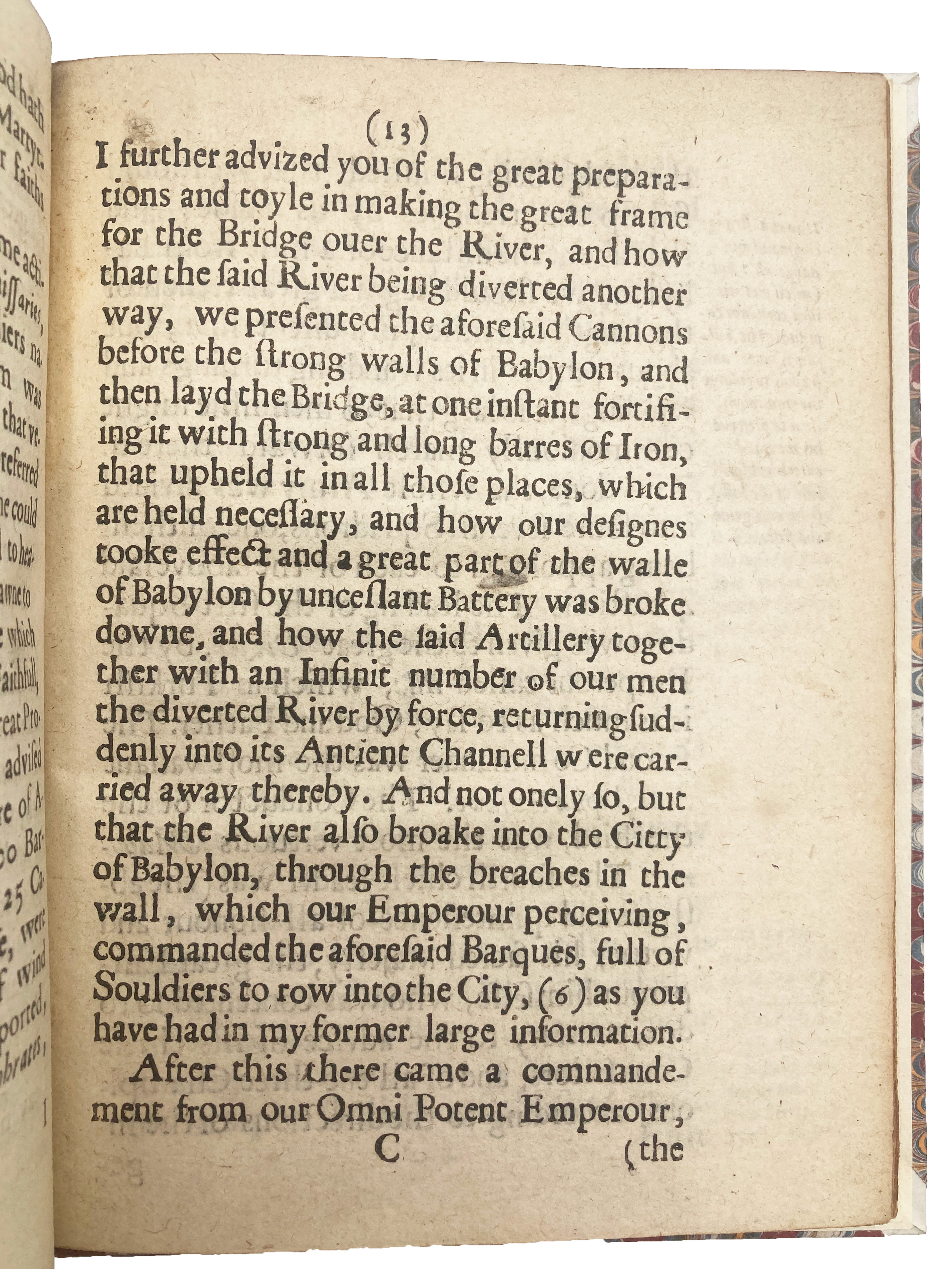 The work opens with an abridged history of the city, starting with its legendary foundress Semiramis and ending with the Persian Prince Abas, who in 1625 ended a thousand years of Ottoman rule. Zarain begins with a description of the vast Ottoman army, which included 4 bastions, 73,589 horses, 35,000 foot (some Janissaries) and lords and captains from Greece, Albania, and Morea. He describes how the army diverted the Euphrates, built a bridge over it, and arranged cannons to be fired at the walls of Babylon. Upon breaking through the fortification, 1000 boats of soldiers entered the city via the river. The Persians, armed only with scimitars, were unable to hold off the Ottomans with their muskets and retreated. Seeing their imminent defeat, the Persian leader, Obet Han, secretly surrendered himself to the Turks after they had promised his people unmolested travel back to Persia. The aftermath was perhaps bloodier than the battle itself: both sides remained highly suspicious of the truce and bloodshed resumed, culminating in the “mortall destruction” of the Persians and devastating casualties for the Turks. They stormed the castle, and having subdued the remaining 300 Persians within, officially reclaimed the city.