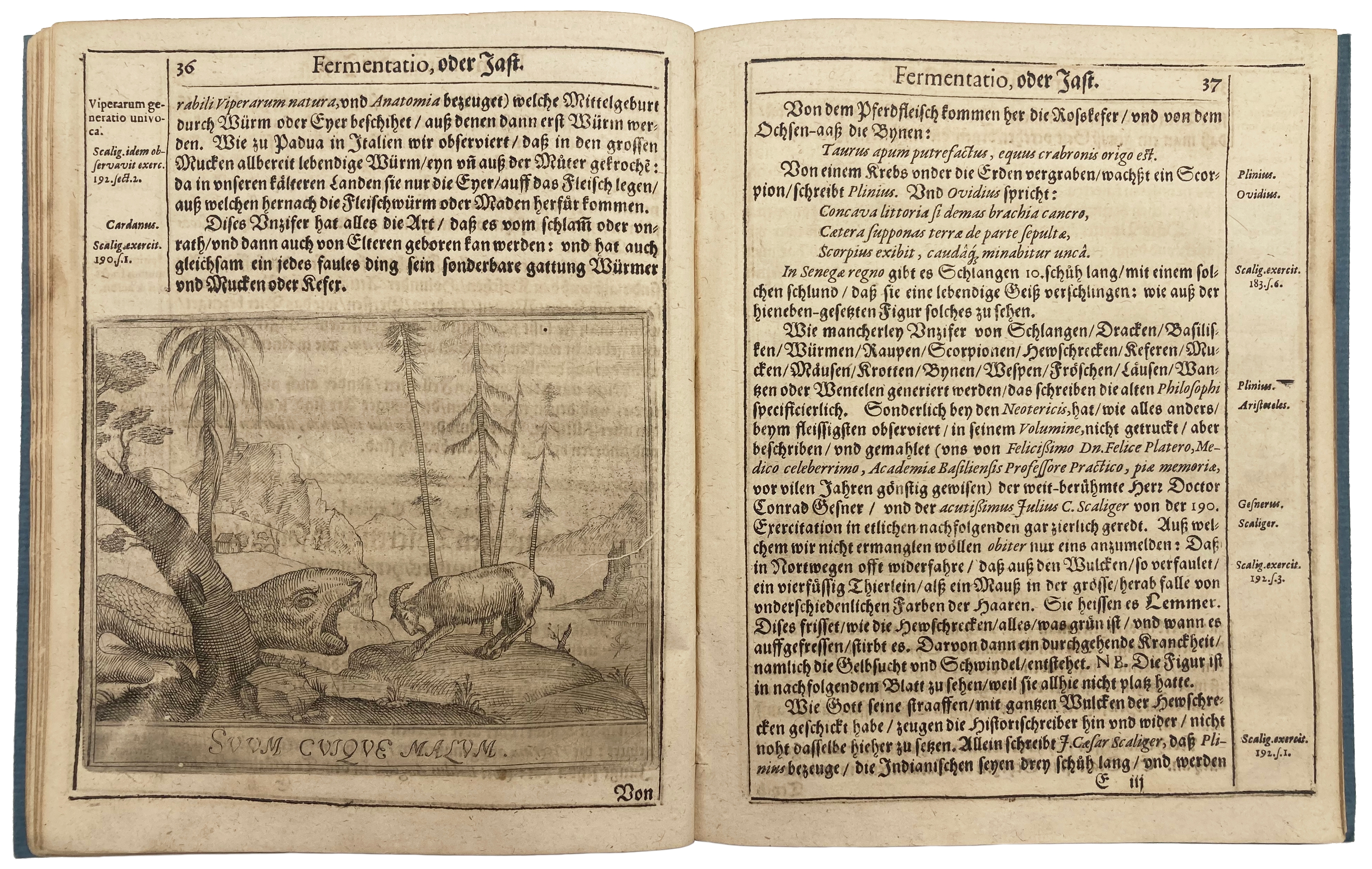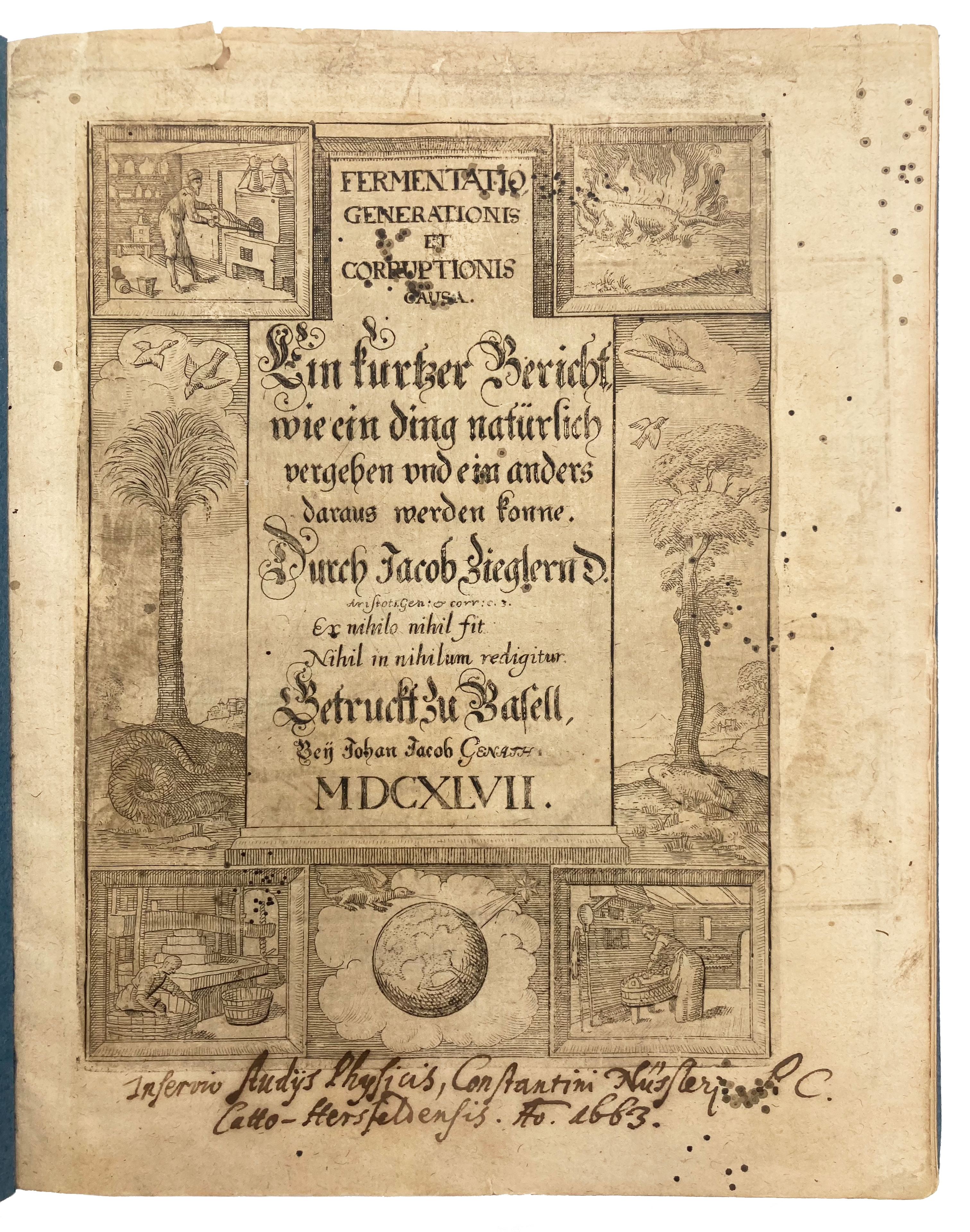 Ziegler is particularly interested in insects and reptiles because of their generation in eggs, which he conceives of as a kind of process of fermentation, just as the generation of vapours through heat leads to certain weather conditions. Ziegler is also interested in the movement of vapours as an explanation for tides, glacial conditions in his native Switzerland, steam, and even earthquakes. However, just as fermentation leads to generation of life and weather, it also breeds corruption, and there are medical chapters here concerning the generation of fevers, the plague (which Ziegler sees as a poison that can be cured with drugs), and pulmonary, circulatory and hepatic conditions.